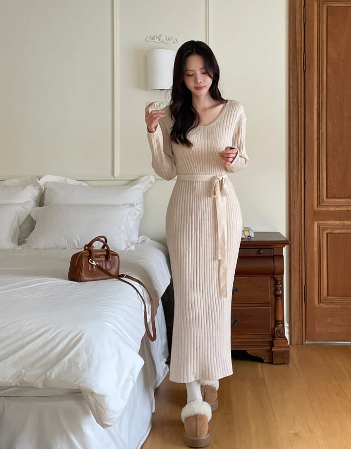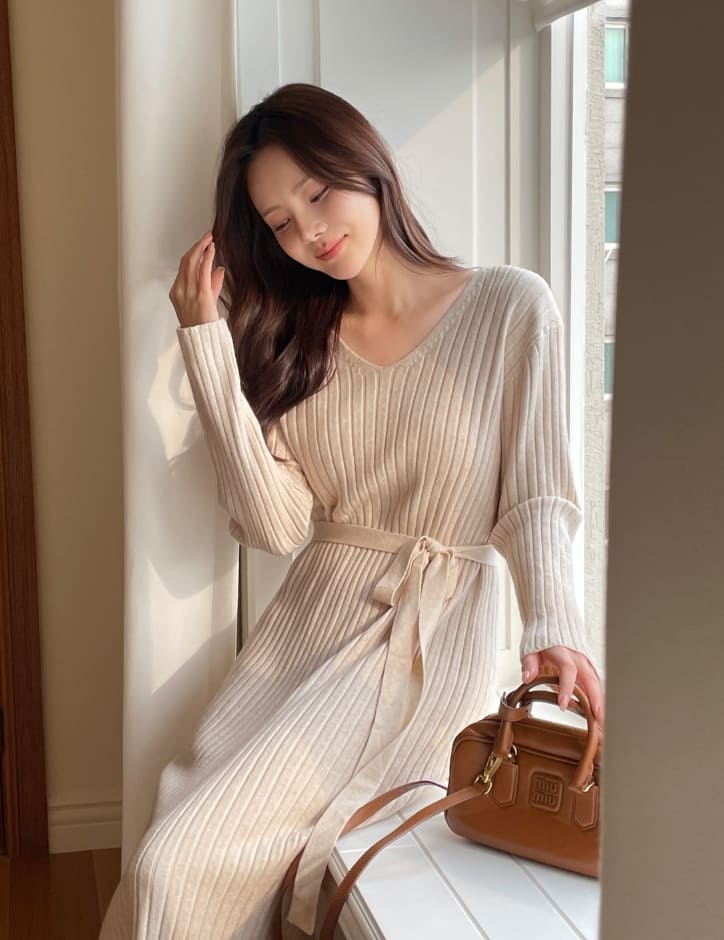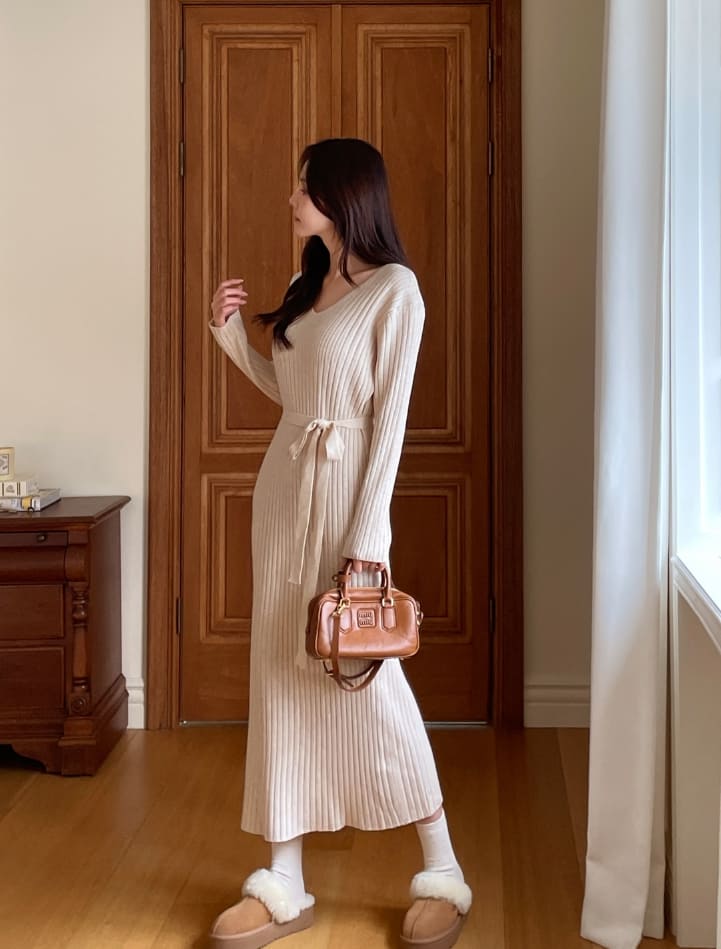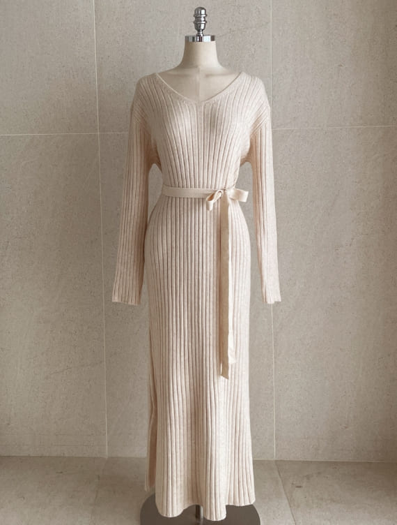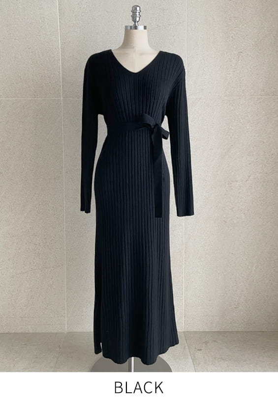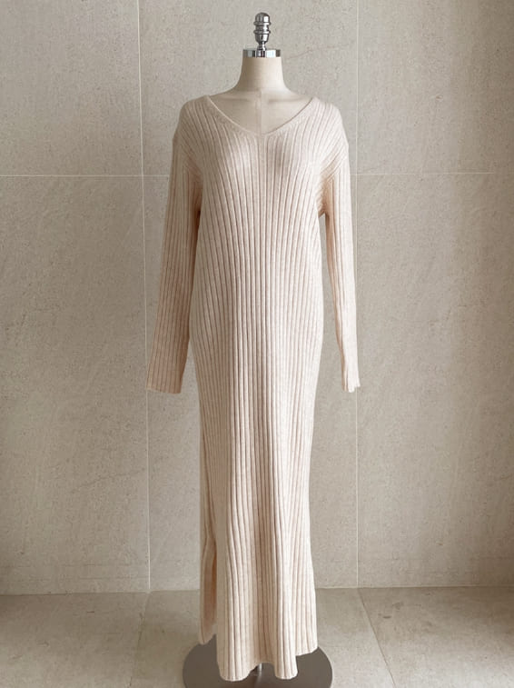 Shuren V-neck Rib Knit Long One Piece (Strap set)