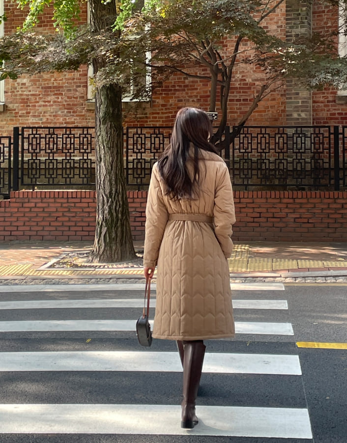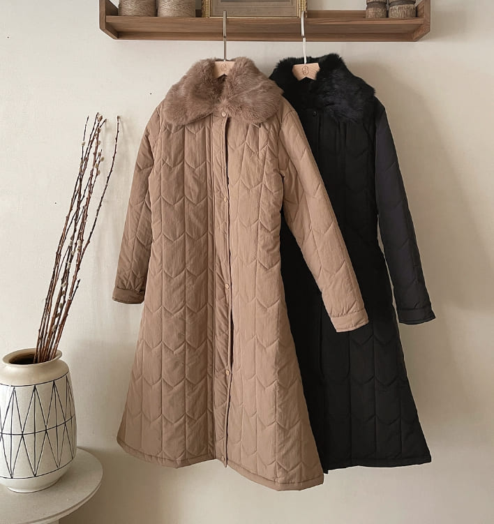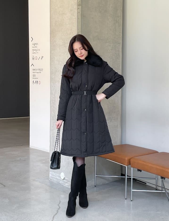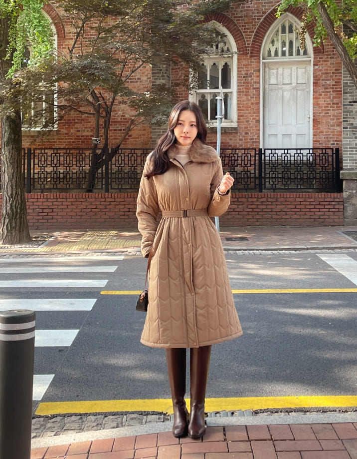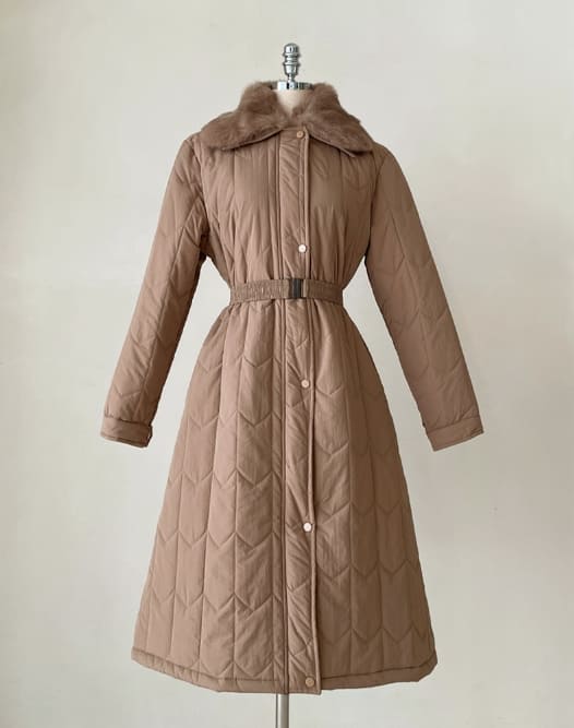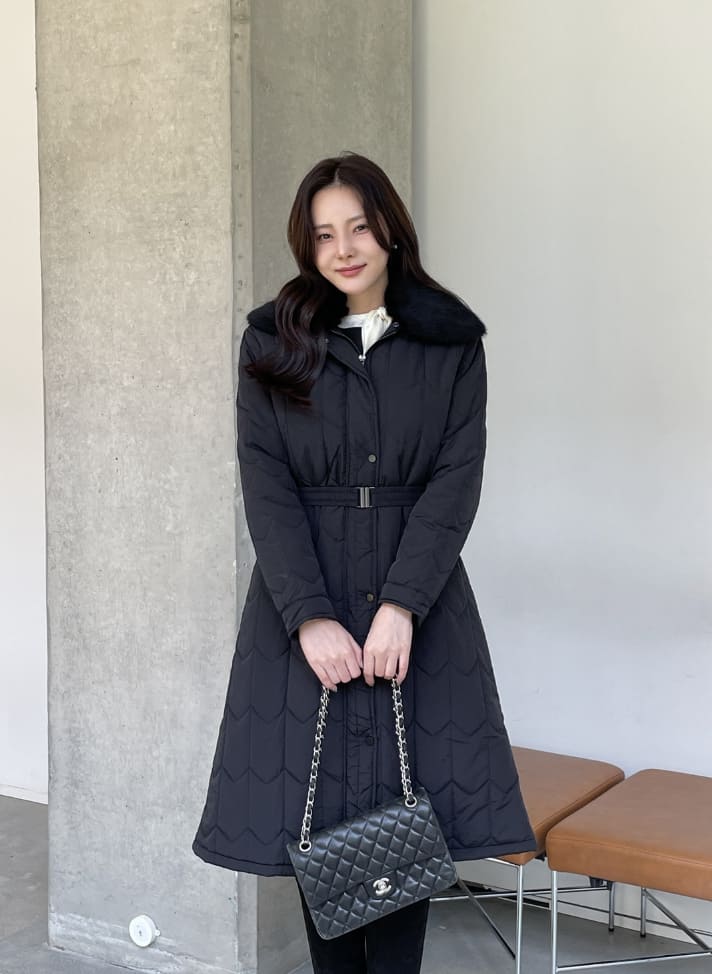 Vero Rabbit Fur Collar Long Padding Coat (Belt Set)