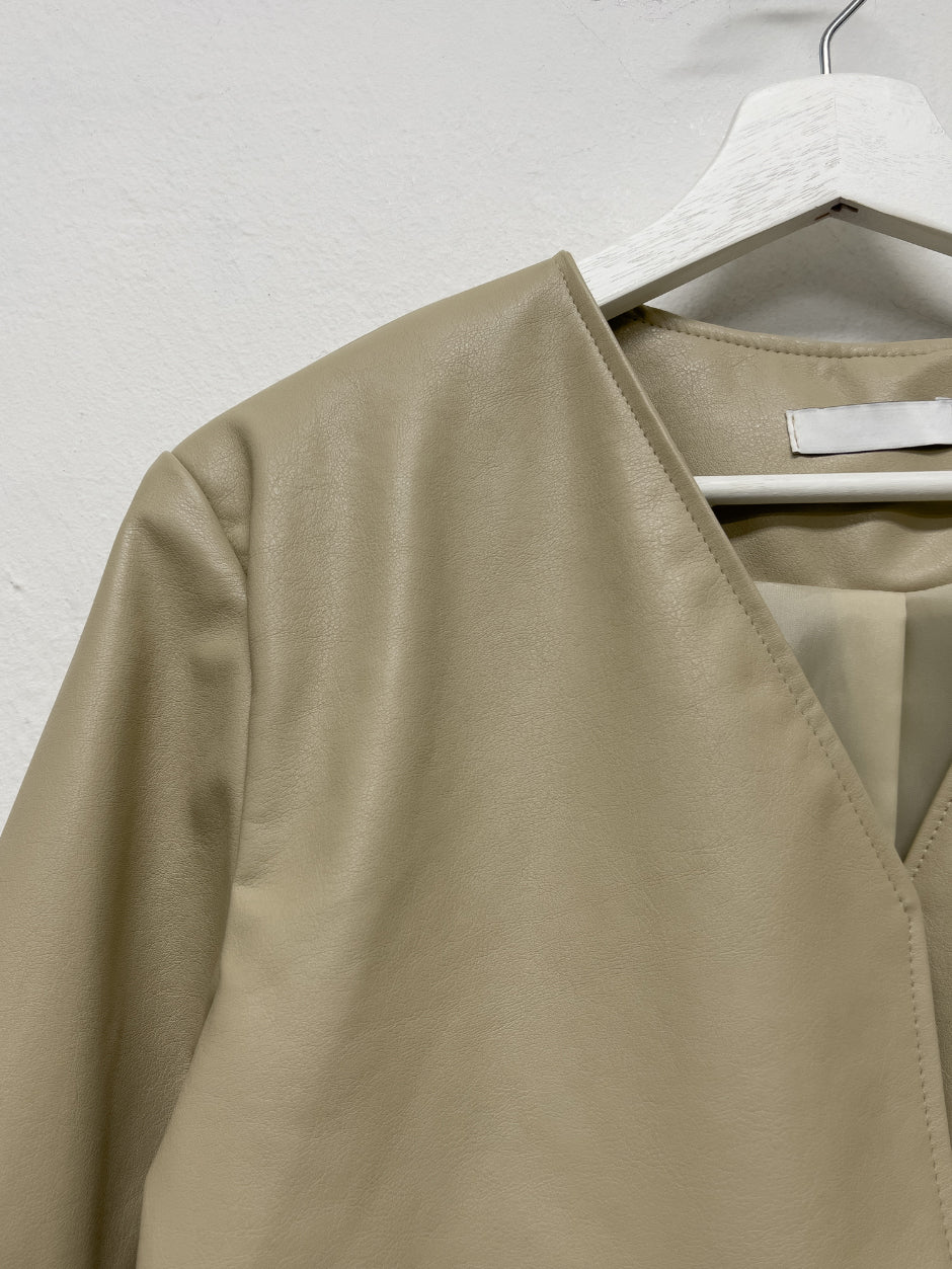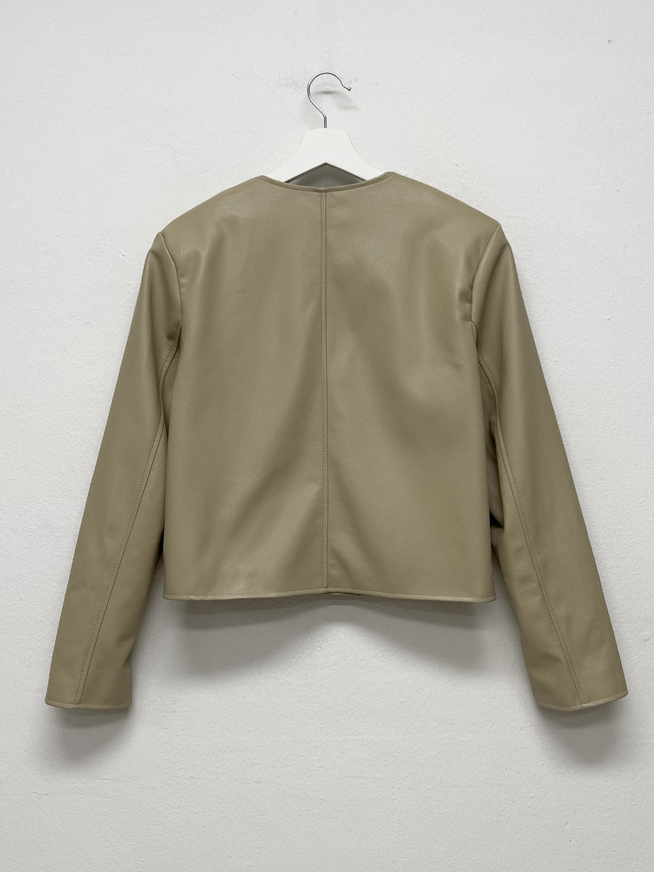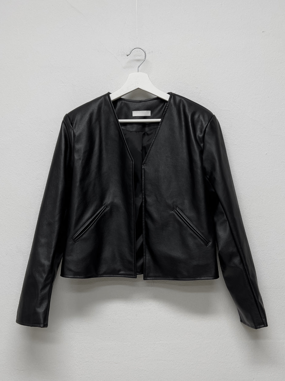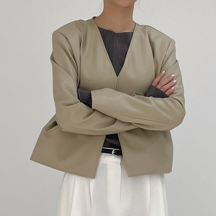 Modern collarless short leather jacket