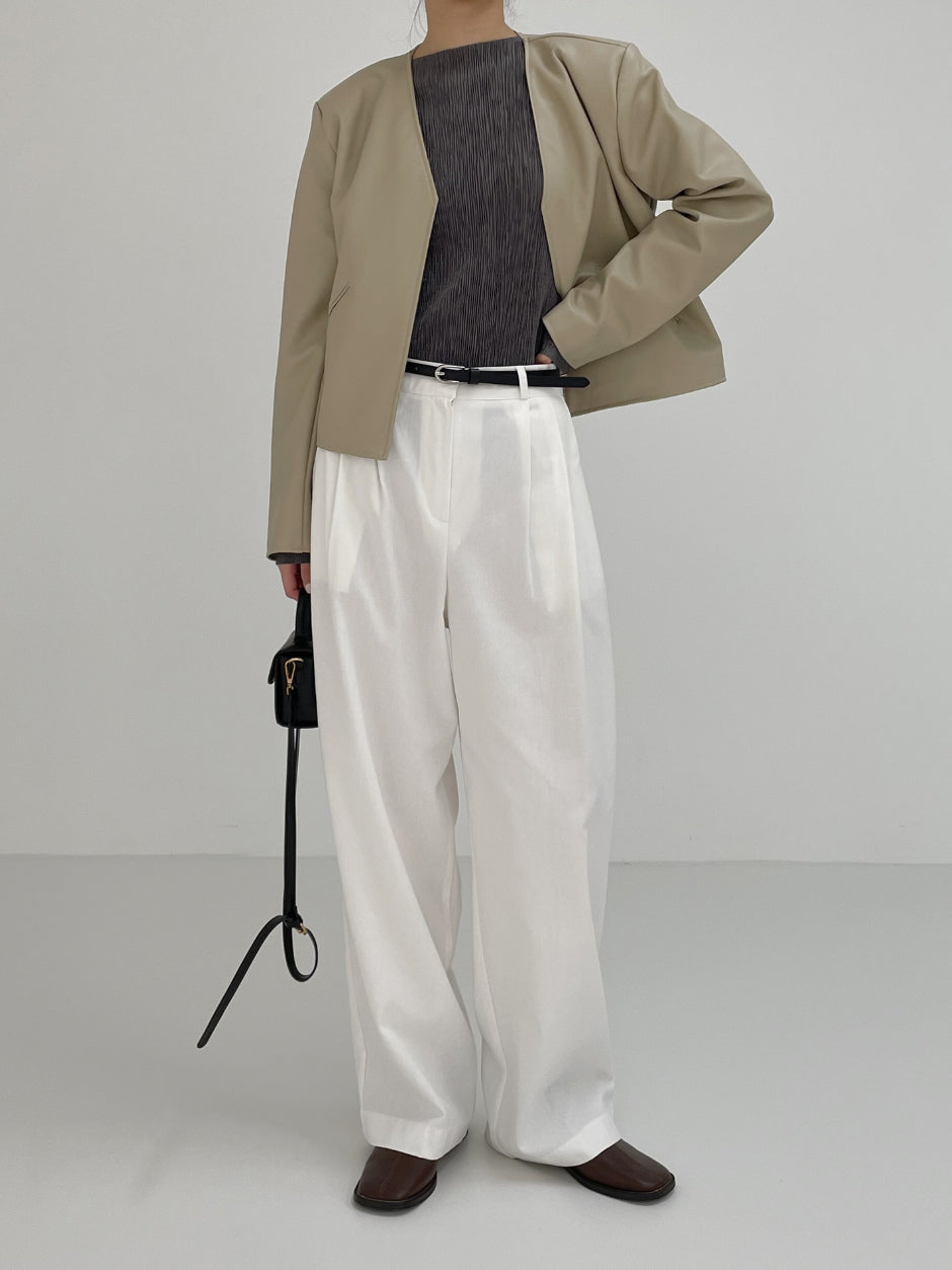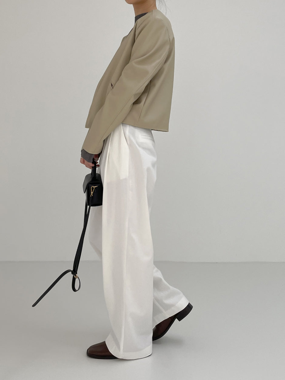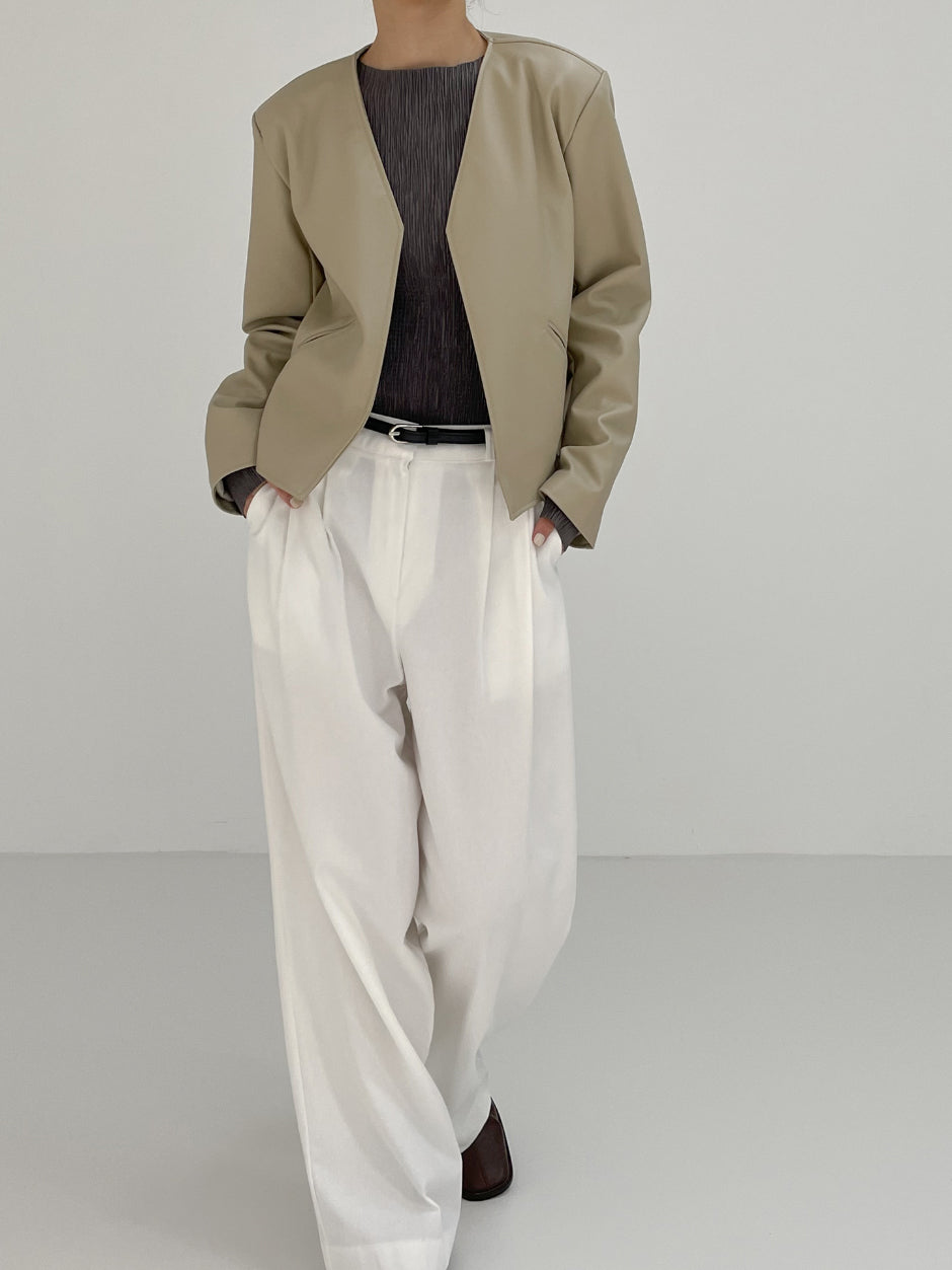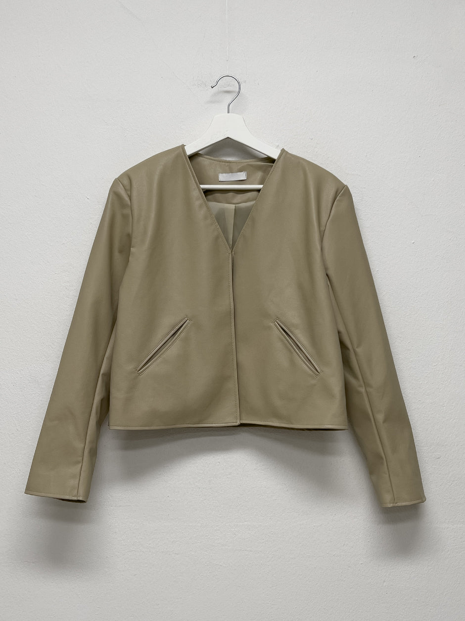 Modern collarless short leather jacket