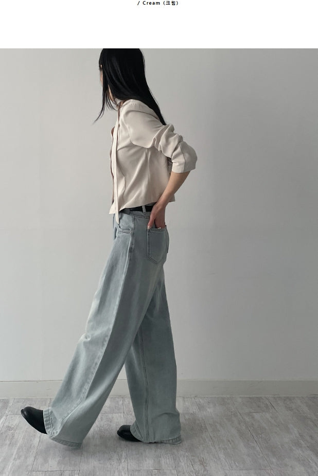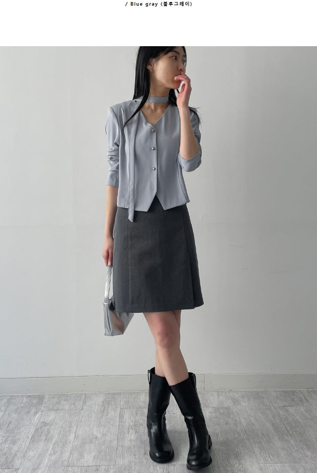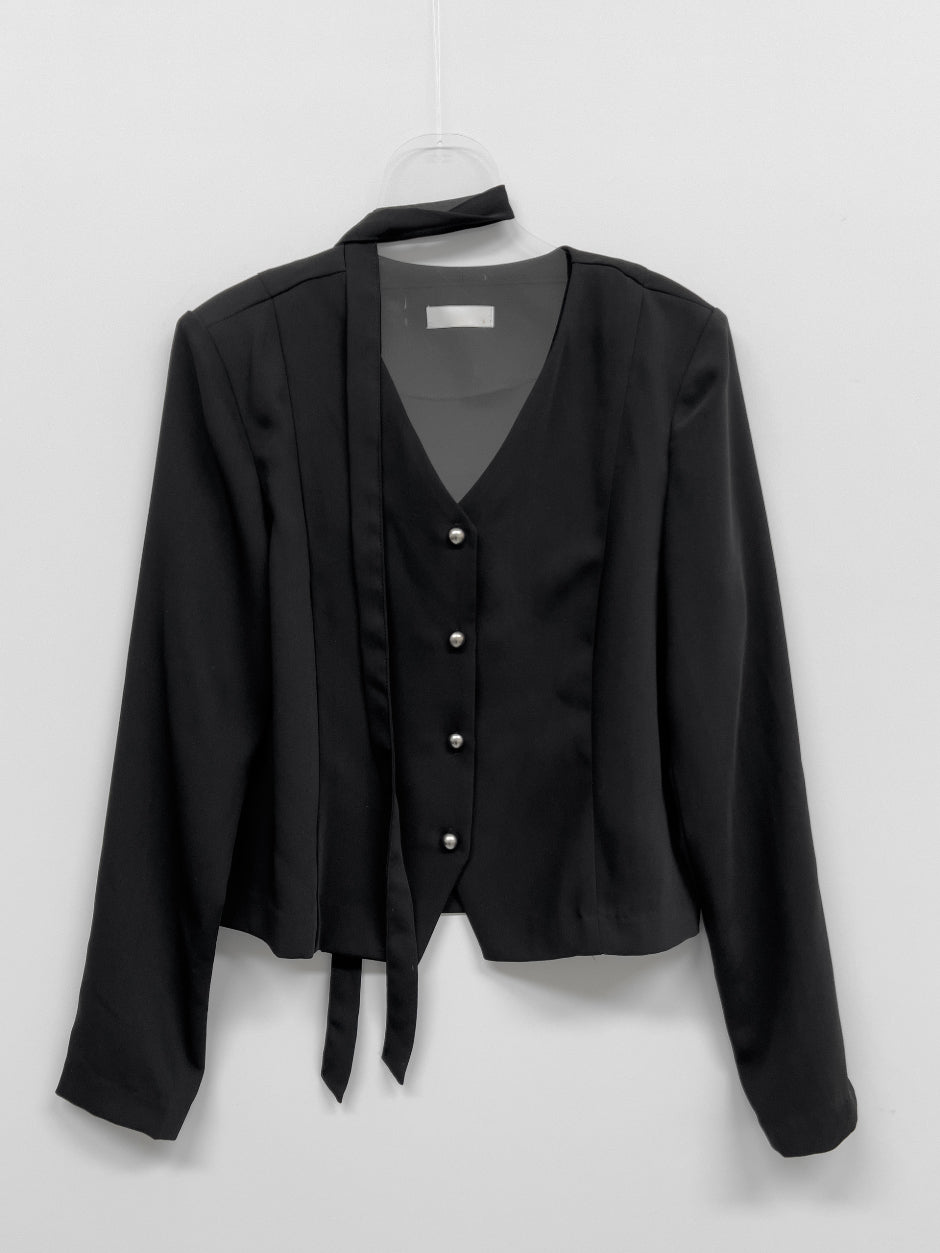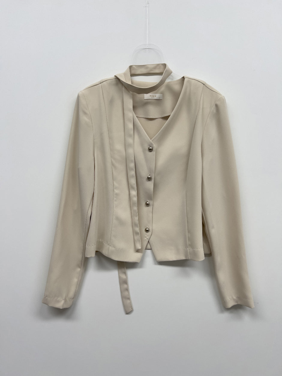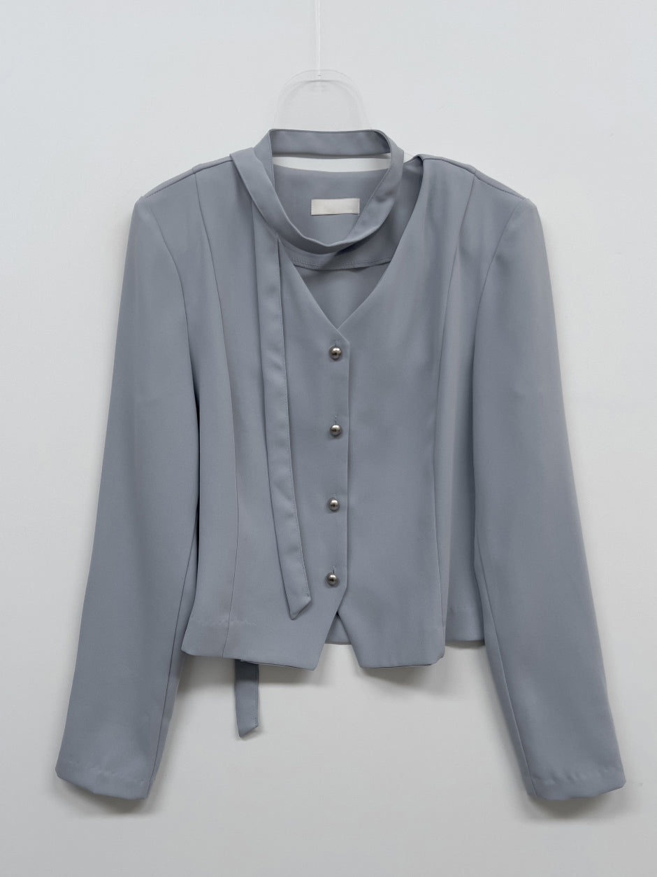 [Tie SET] Padded V-neck Pin Tuck Blouse