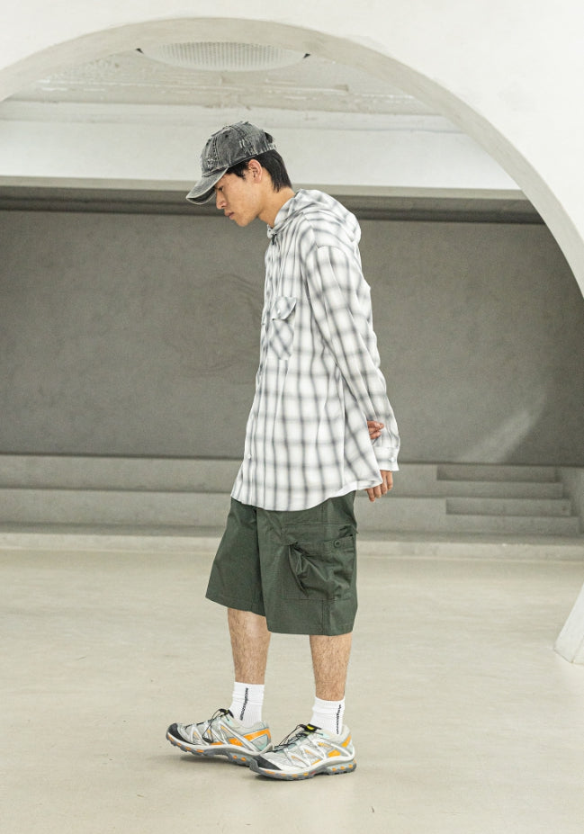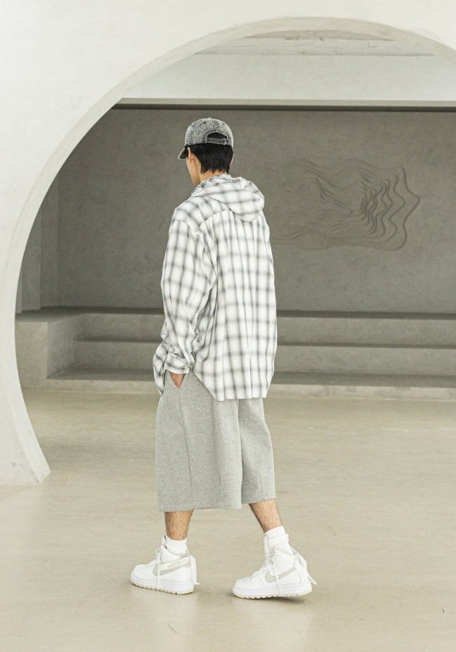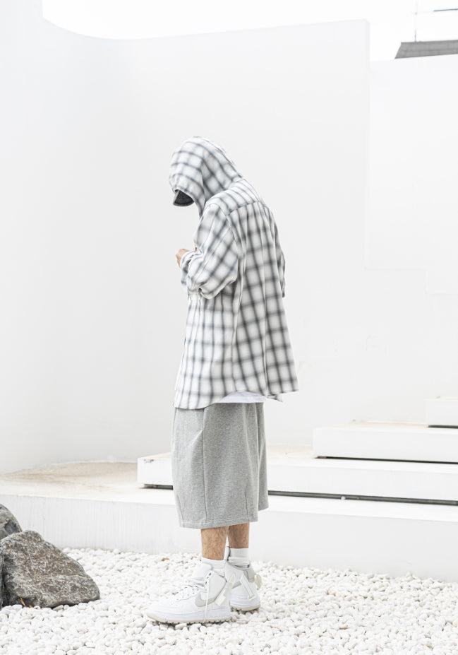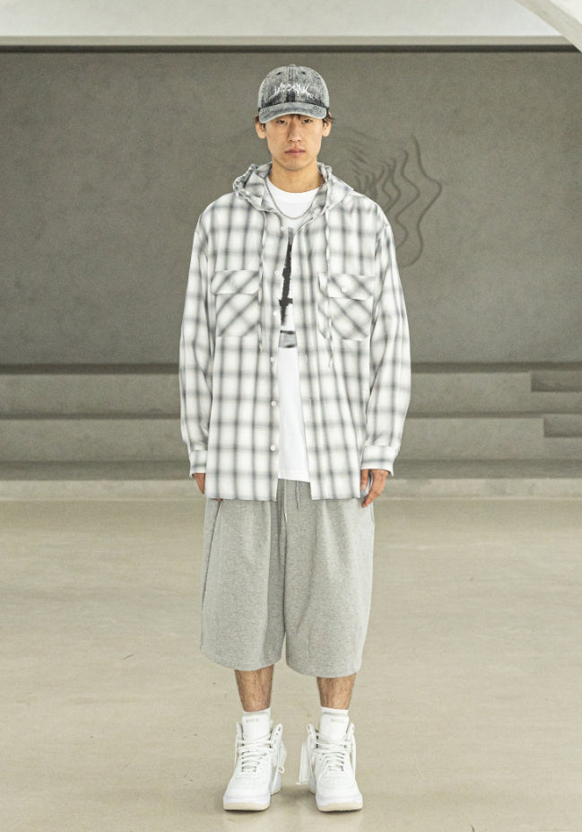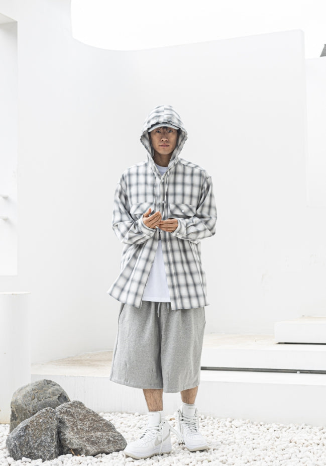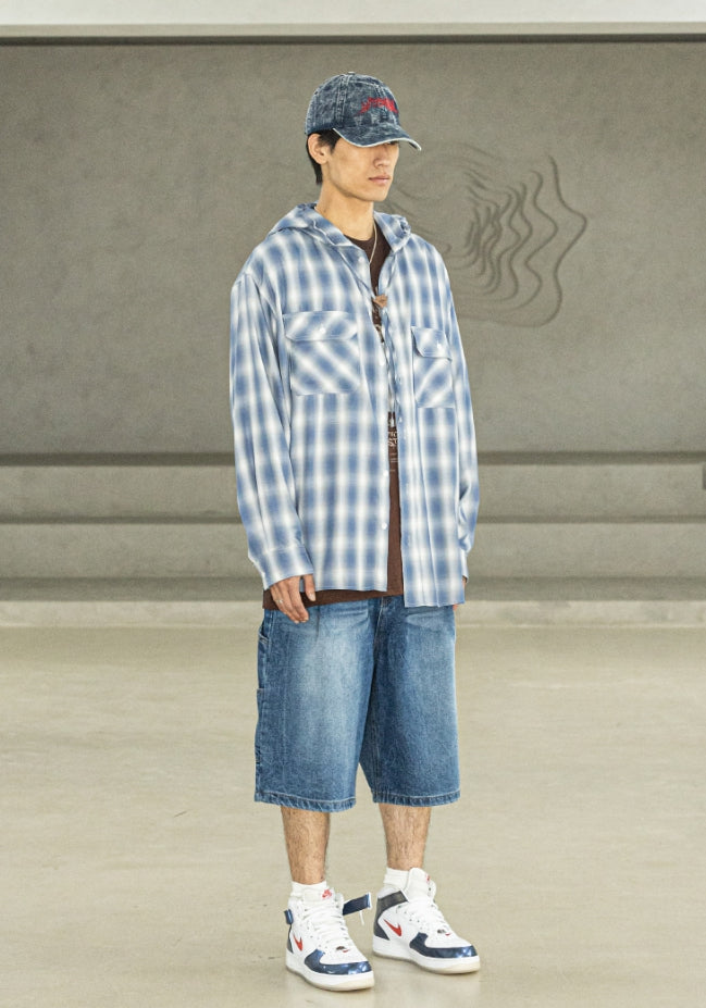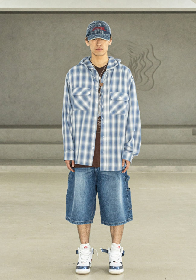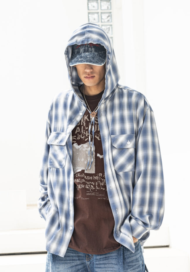 リラックスレザーオーナメントフーディチェック長袖シャツ