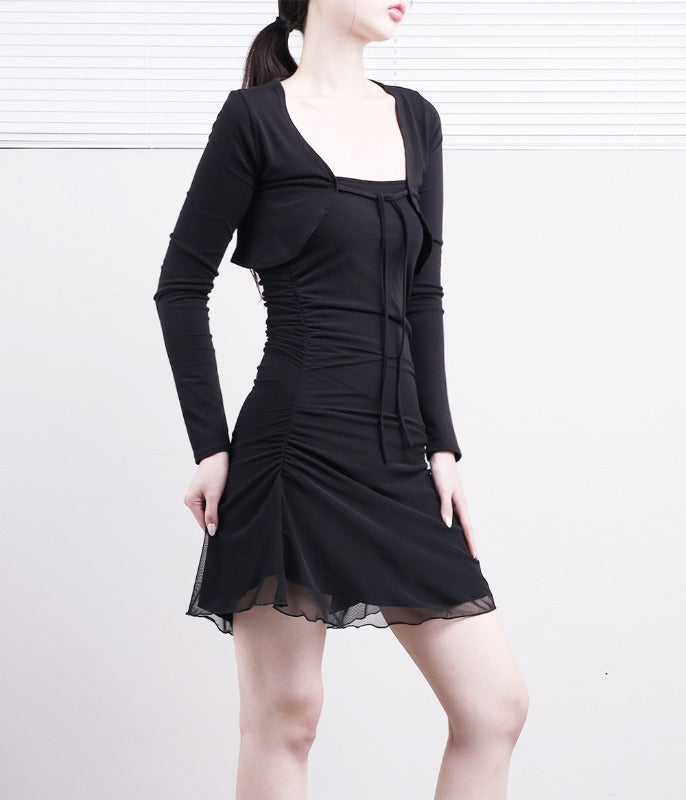 Curling crop cardigan + chiffon one-piece set