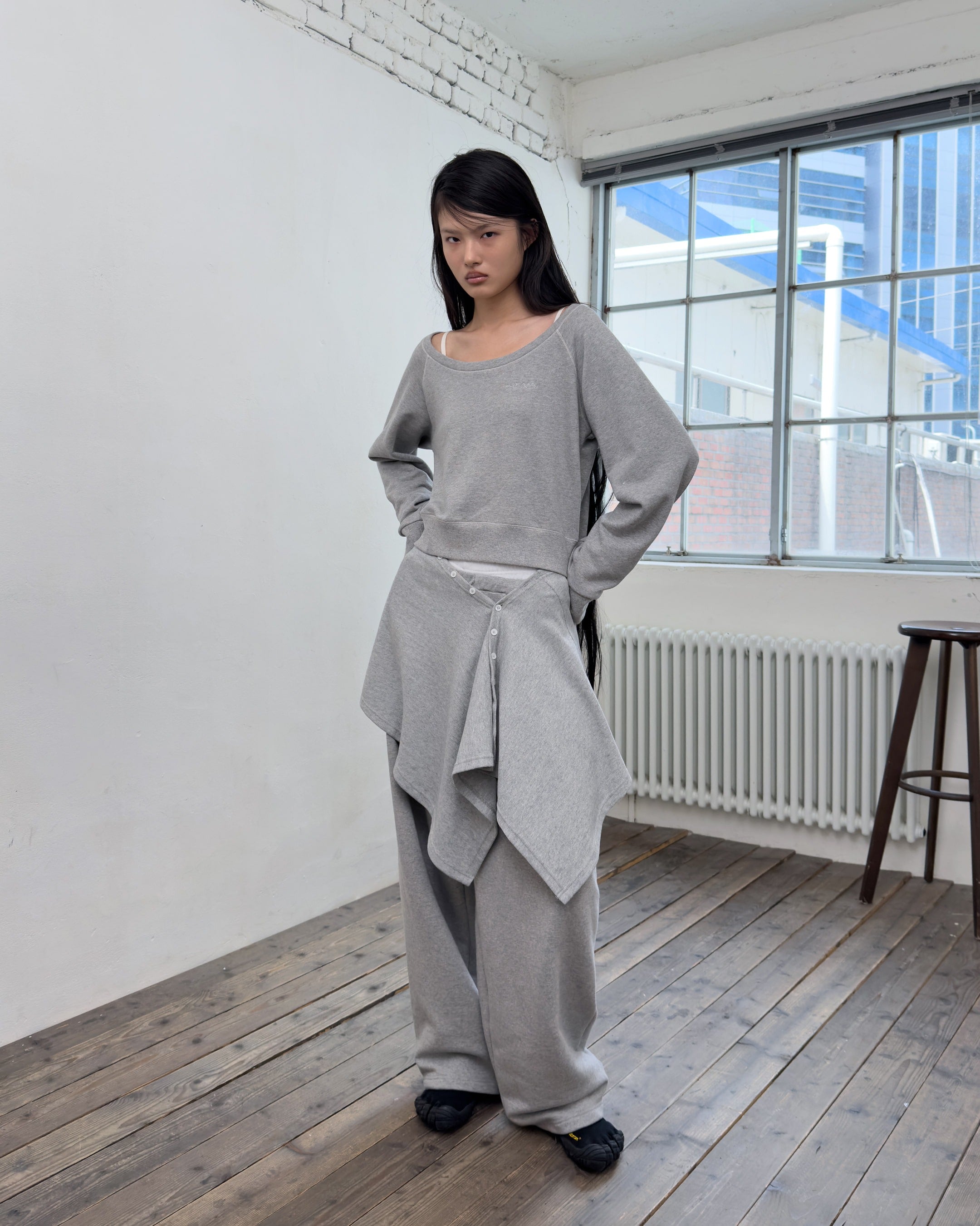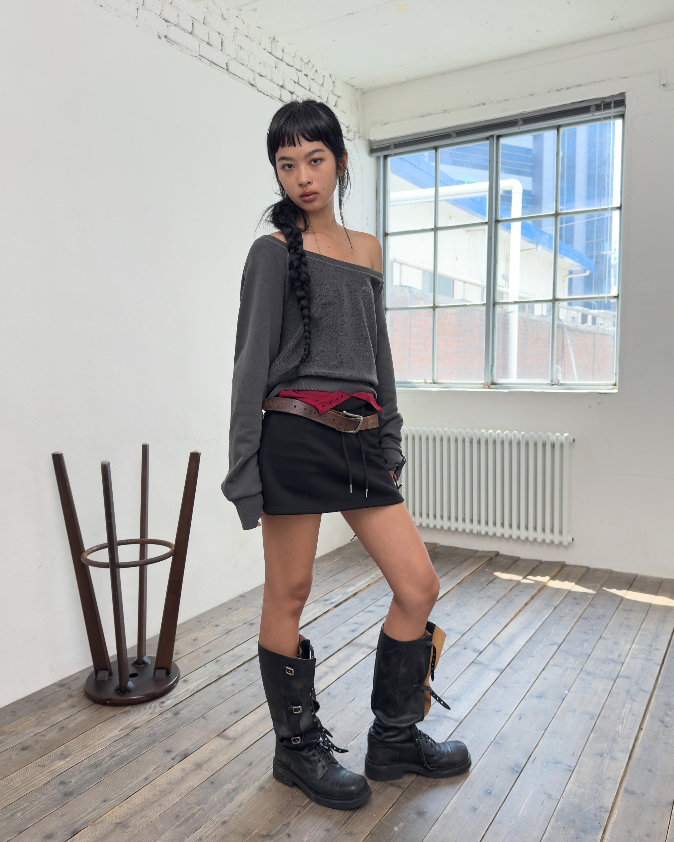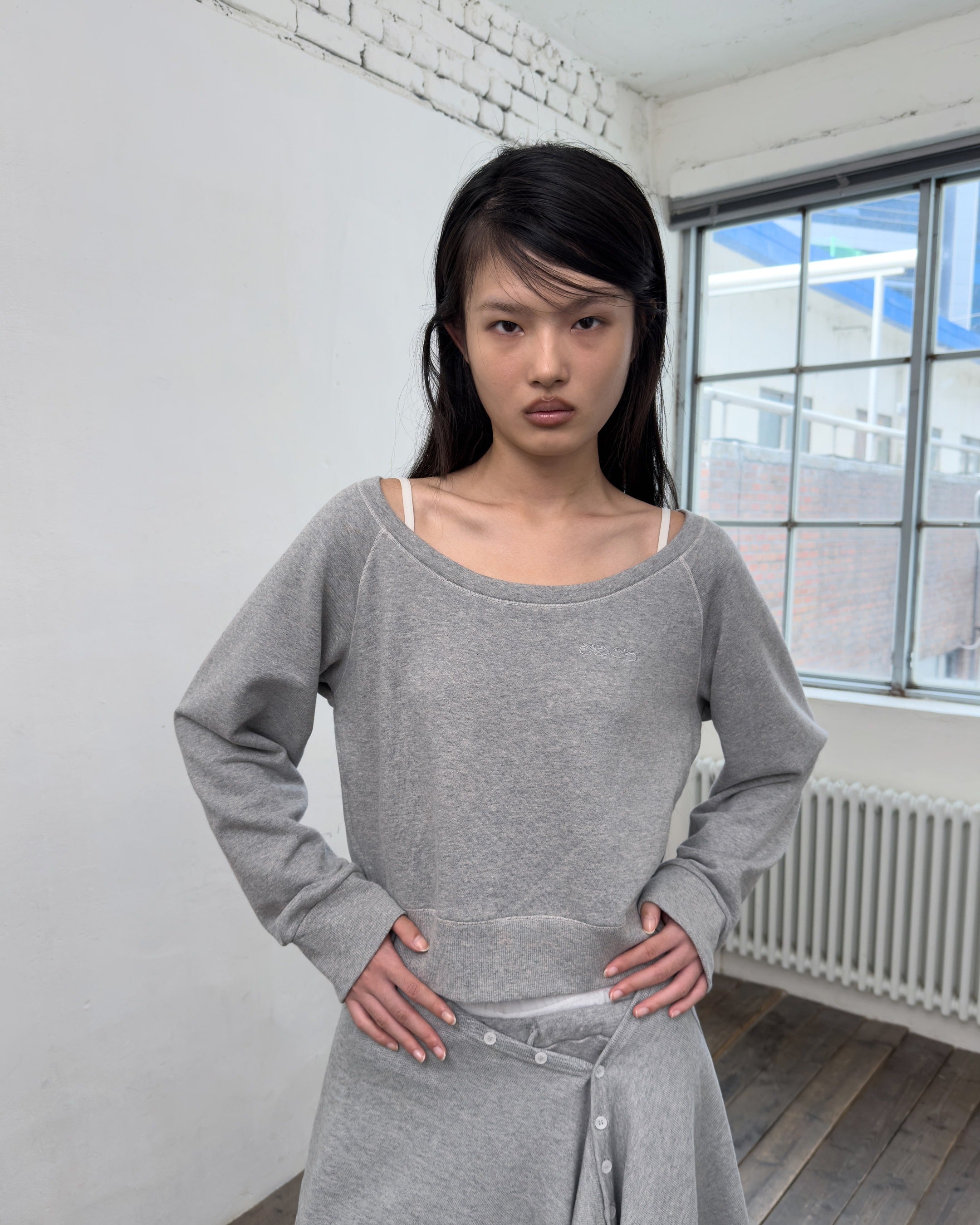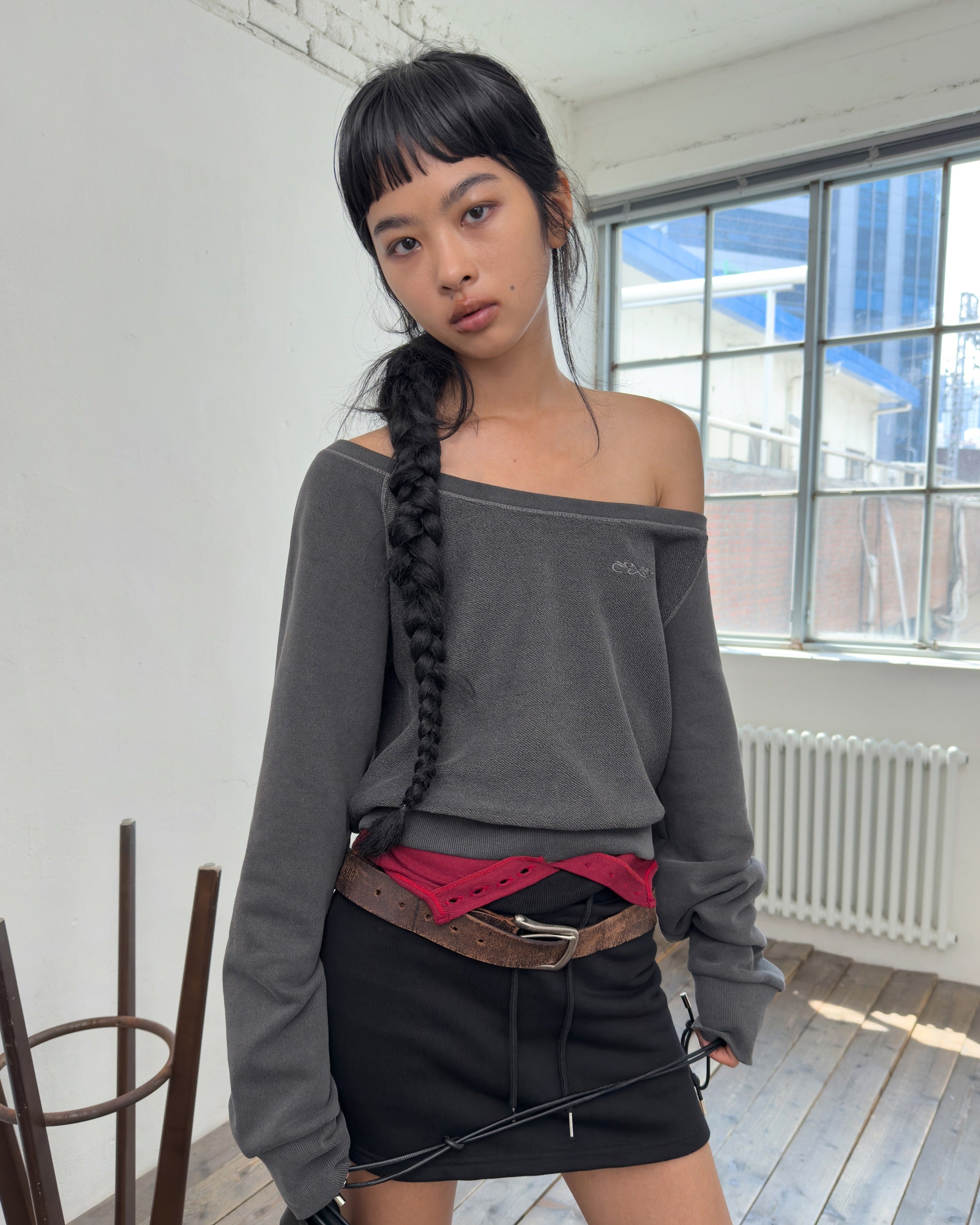 OFF-SHOULDER REVERSE LOOP SWEATSHIRT