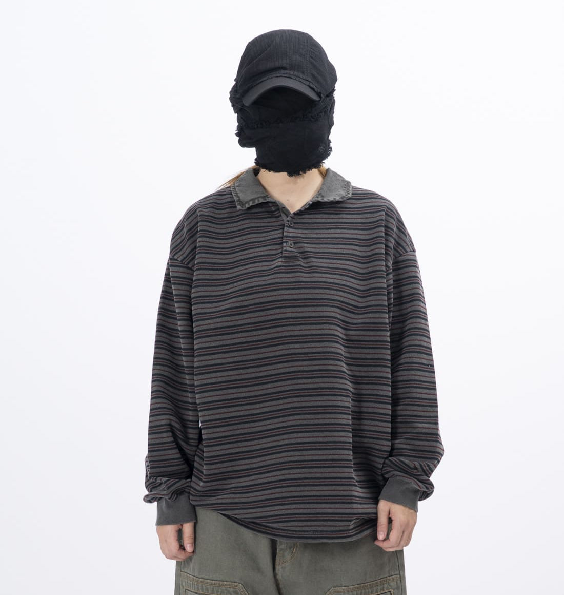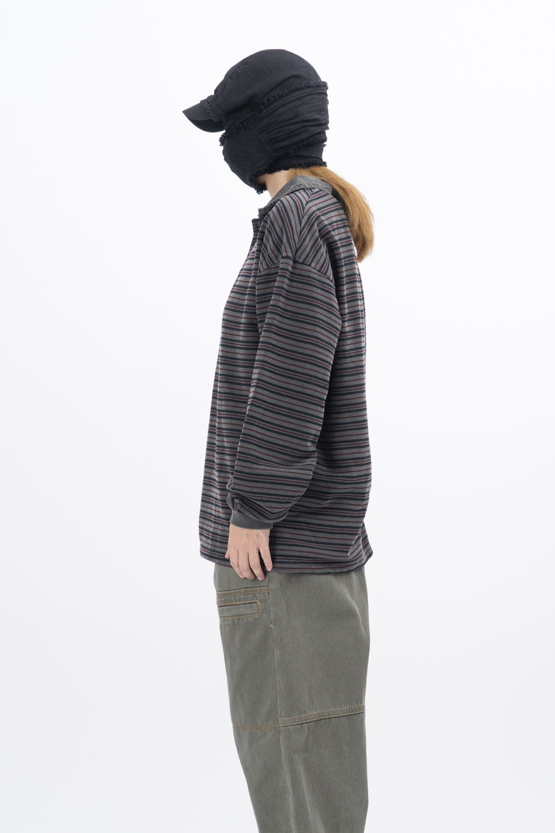 ジュク襟付きボーダーピグメント長袖Tシャツ