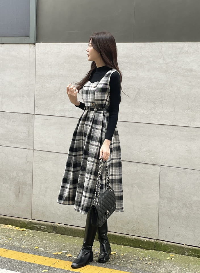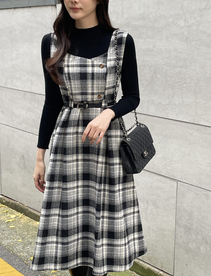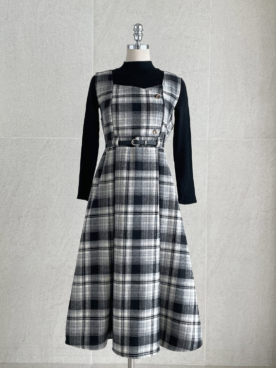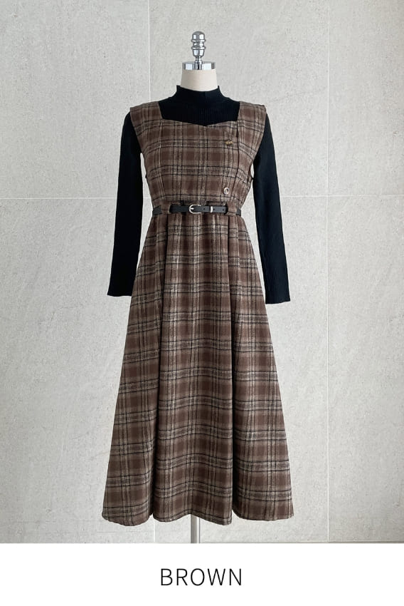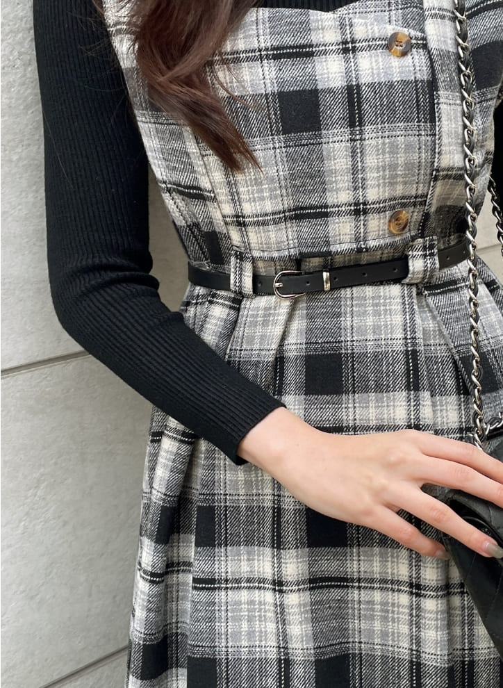 キュレンポーラーニットチェックビスチェワンピースセット(ベルトセット)