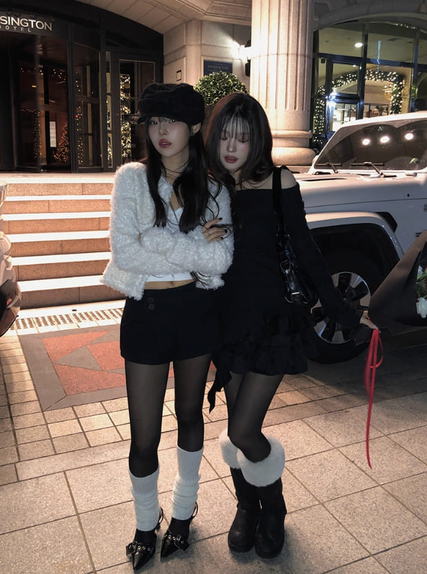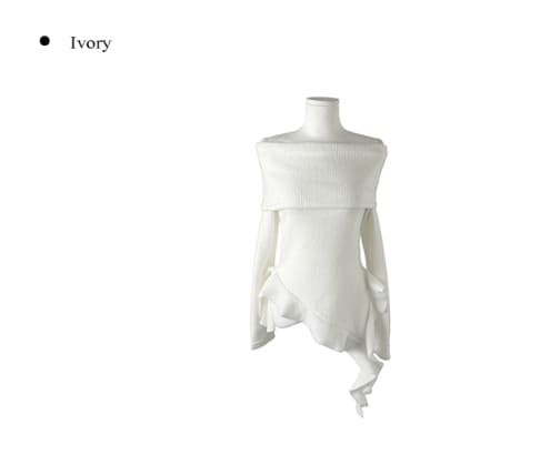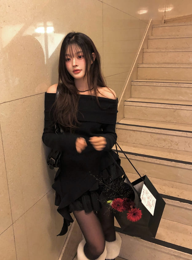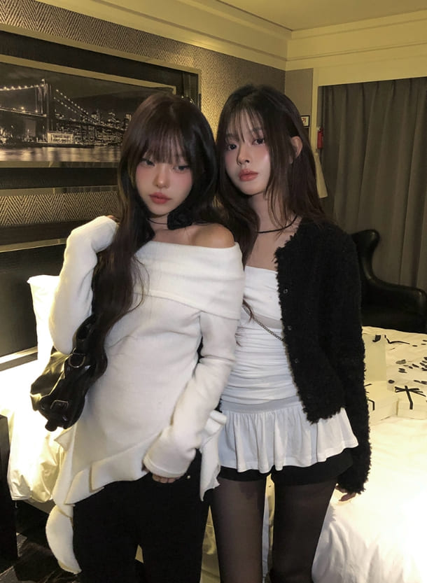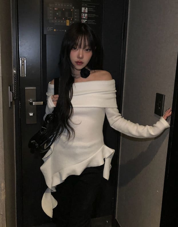 [Brushed] Fove Off-Shoulder Unbalanced Frill Rib Knit