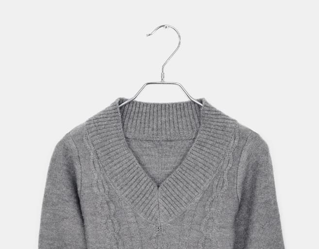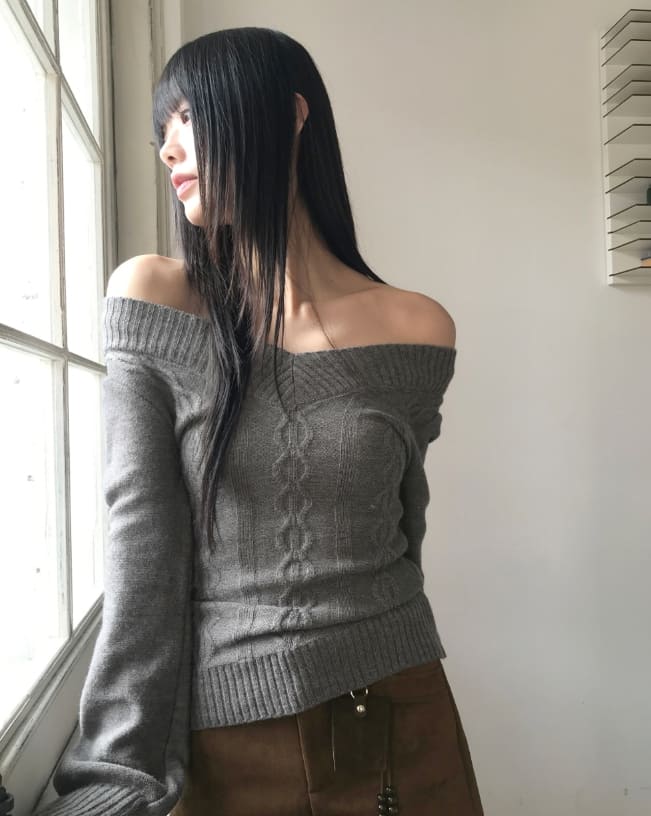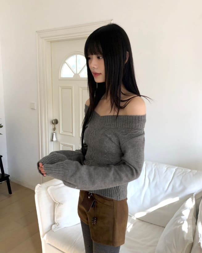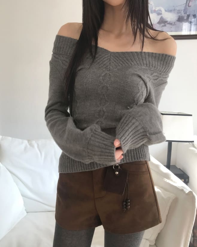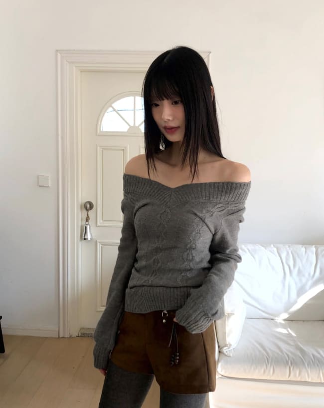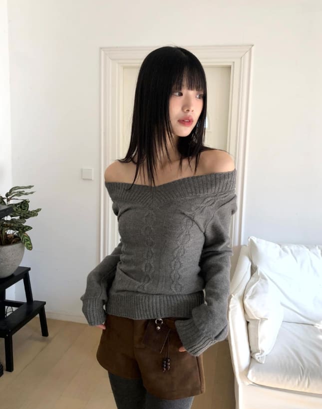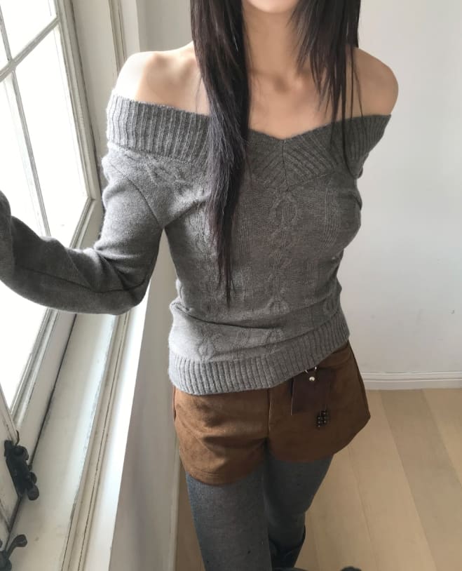 Chimo V-Neck Off-Shoulder Slim Fit Cable Knit