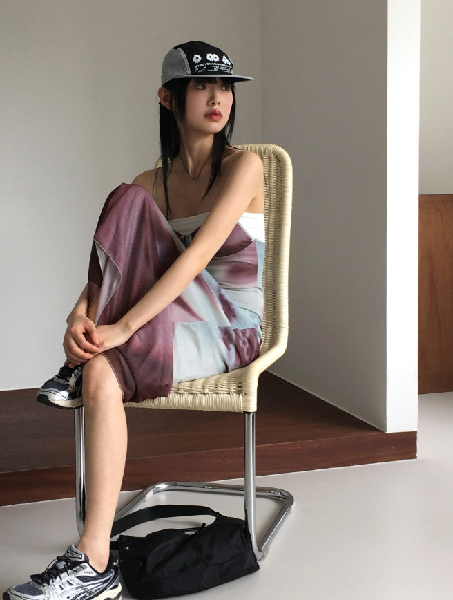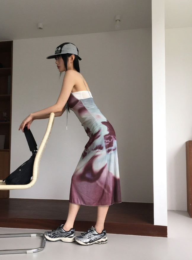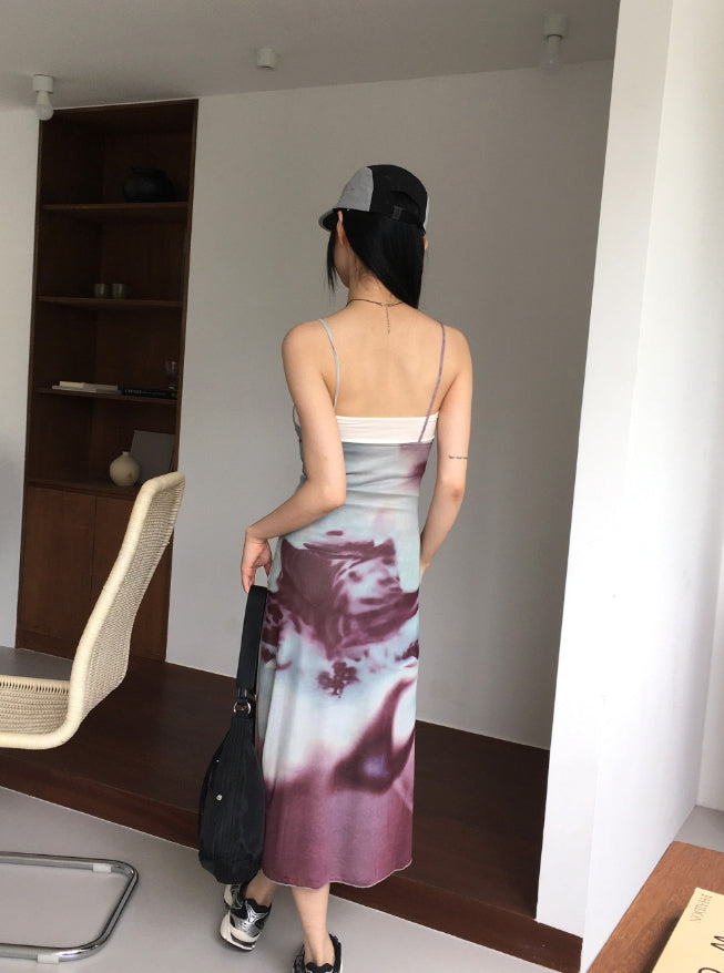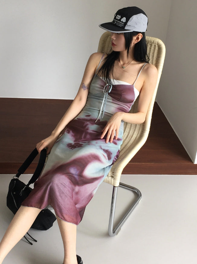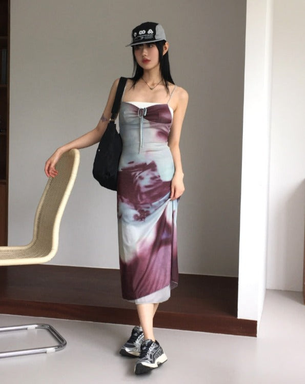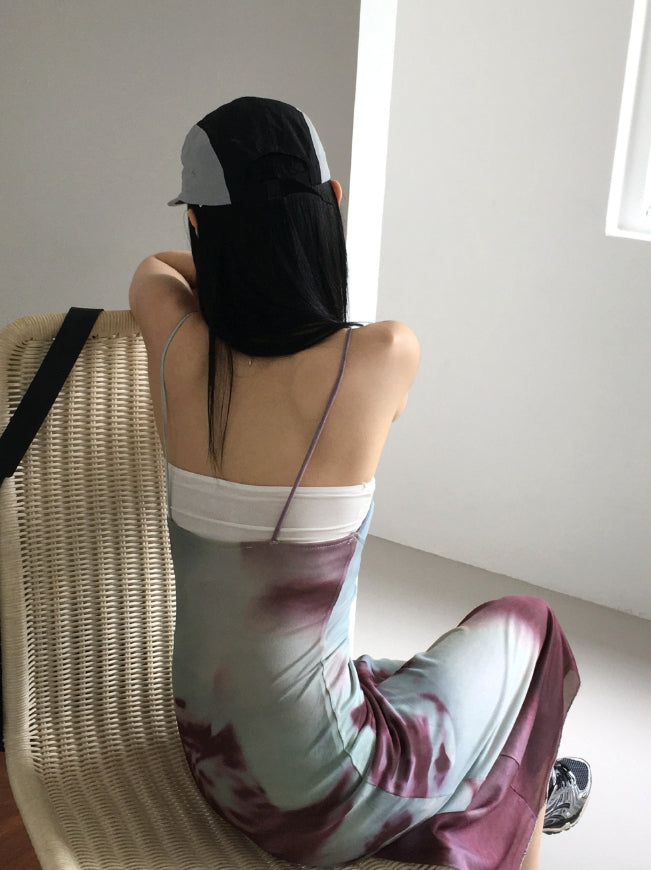 Reva Tie Dye Printed Shirring Strap Long Dress