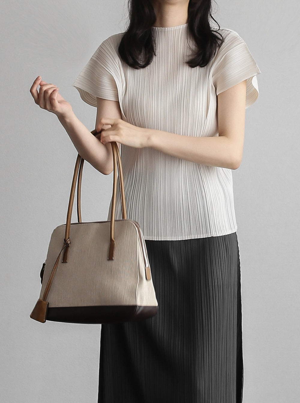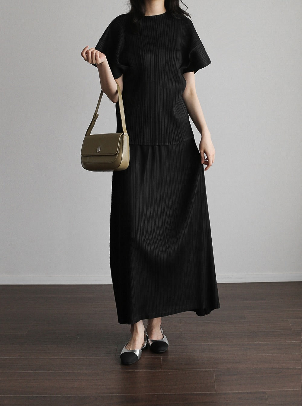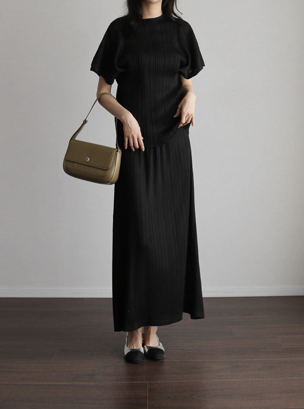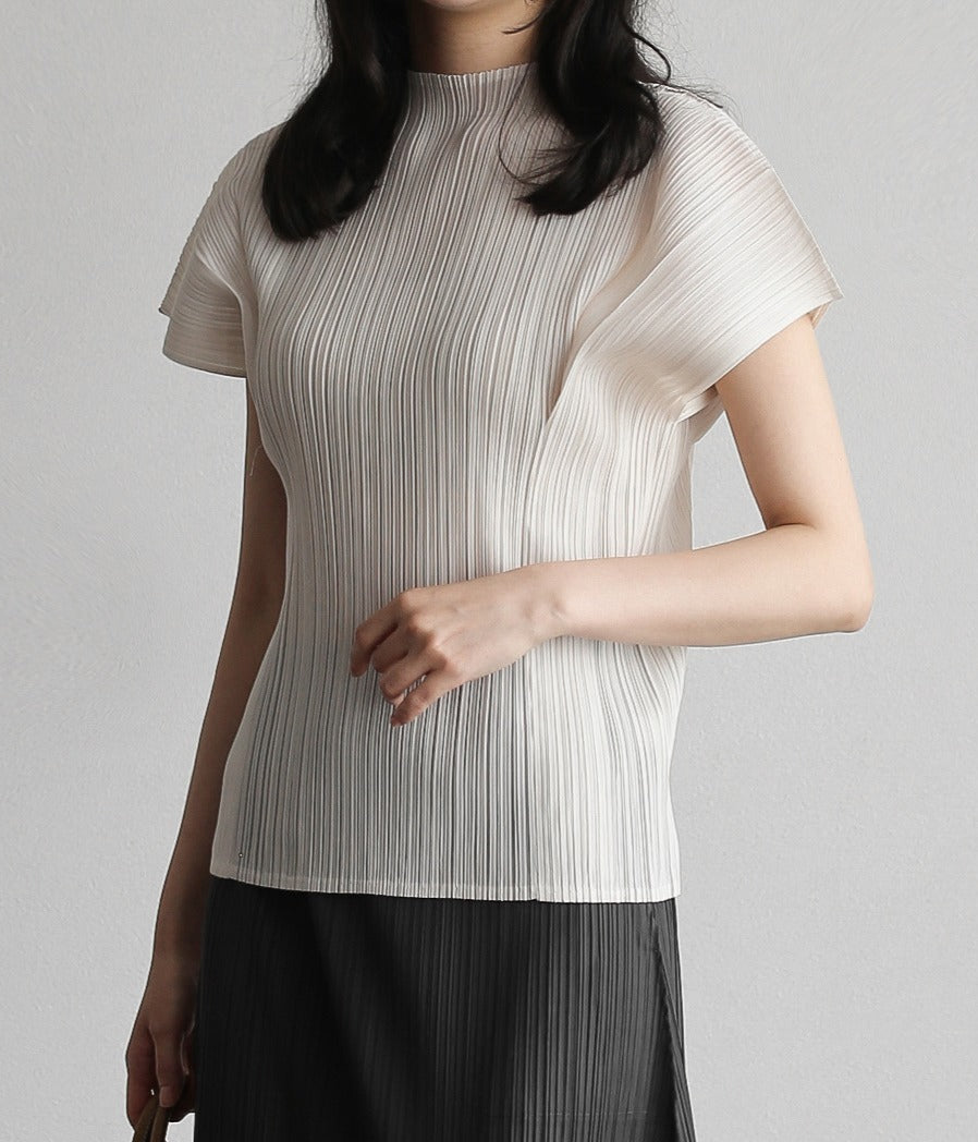 [プレミアム]オレアハイネック半袖プリーツTシャツ