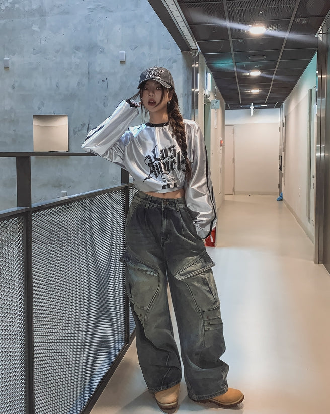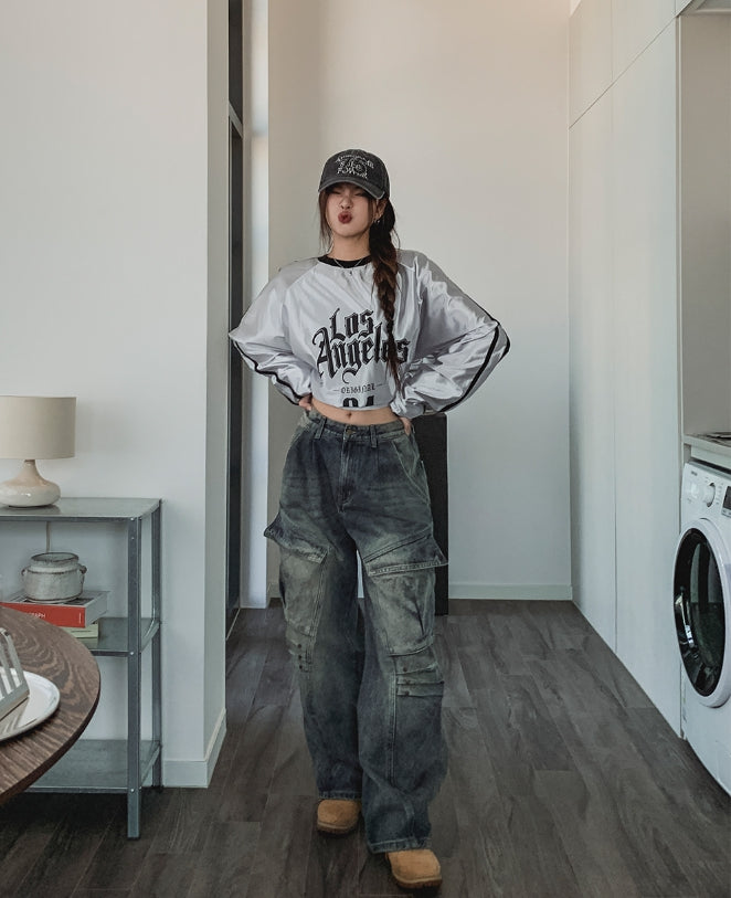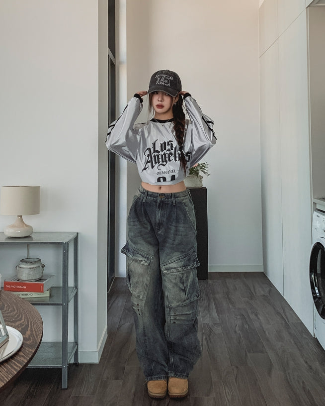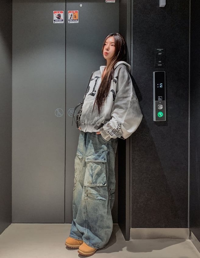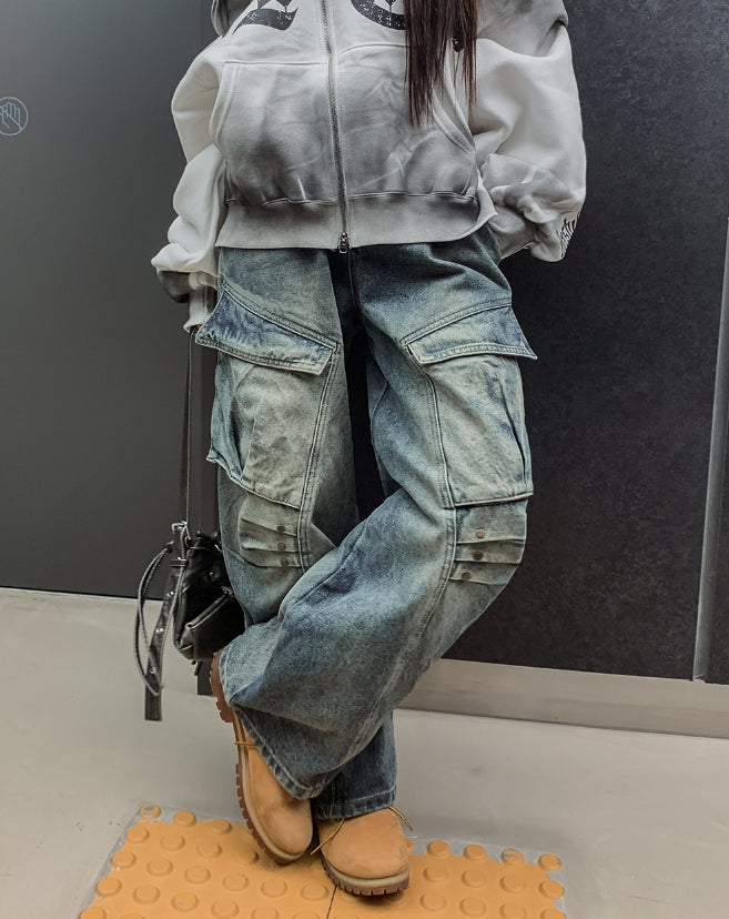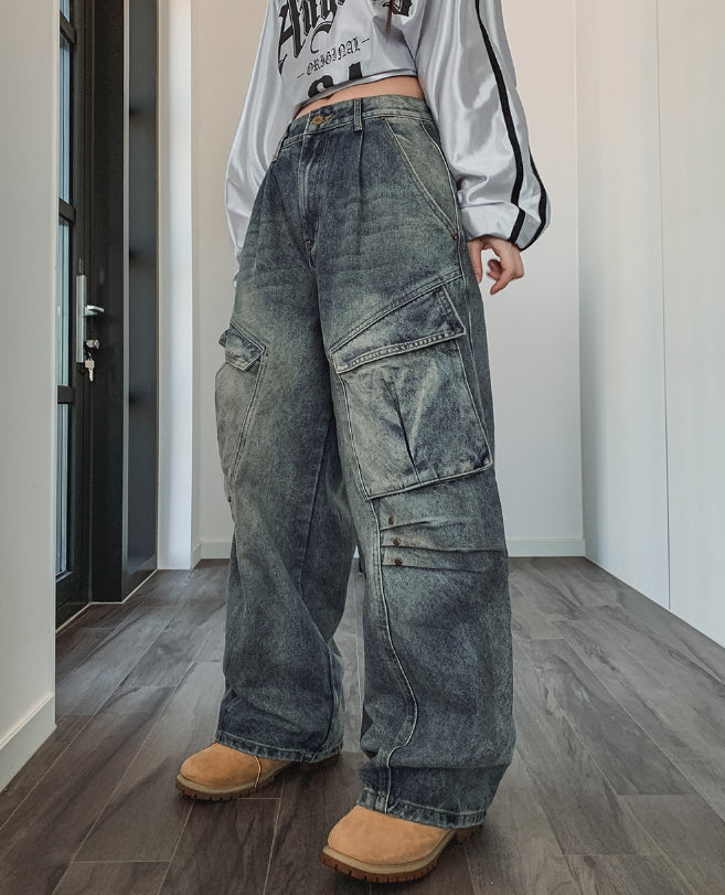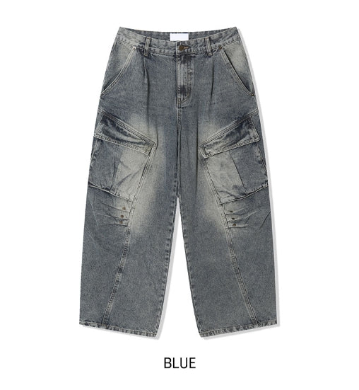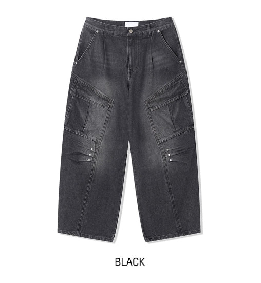 Copper Rivet Pin Tuck Cargo Denim Pants