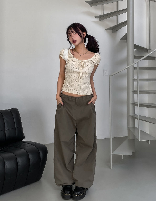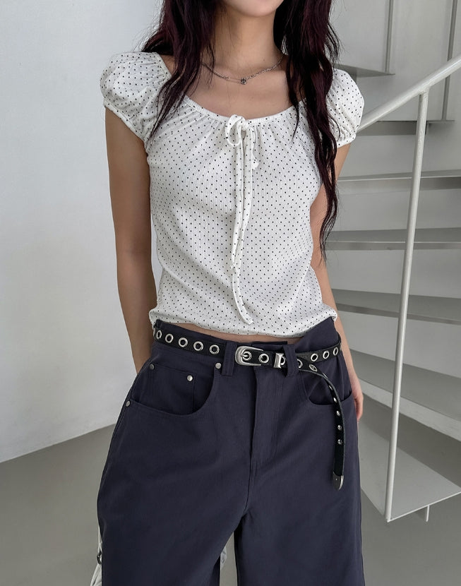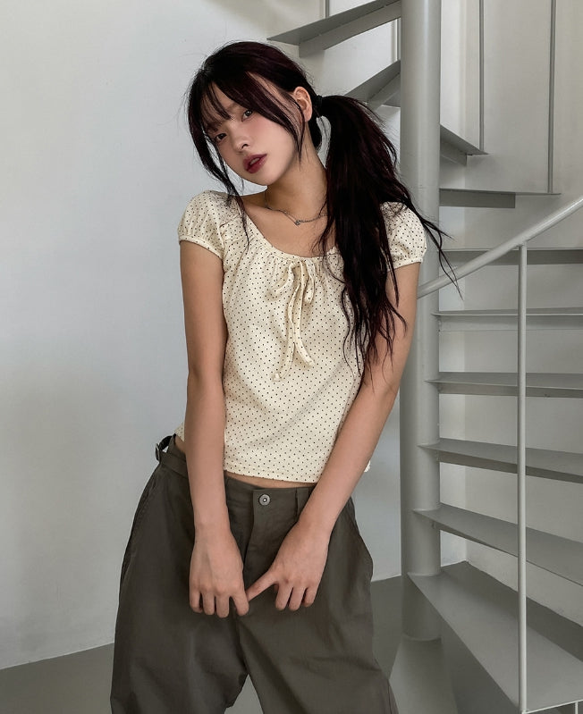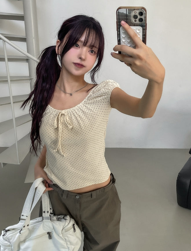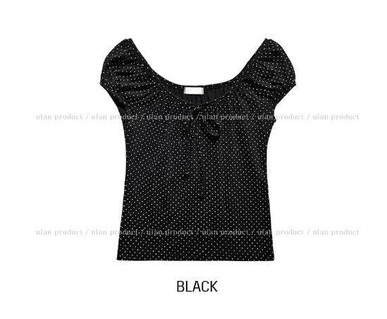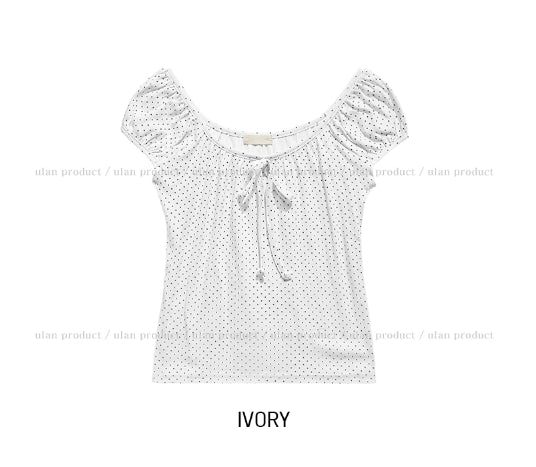 Dot Ribbon Shirring Puff Off-Shoulder Short Sleeve