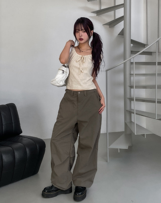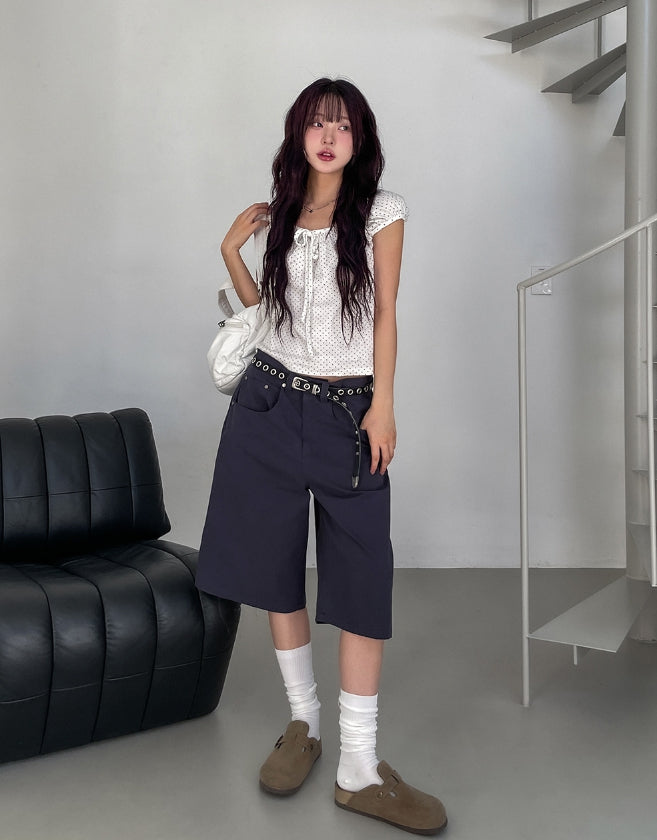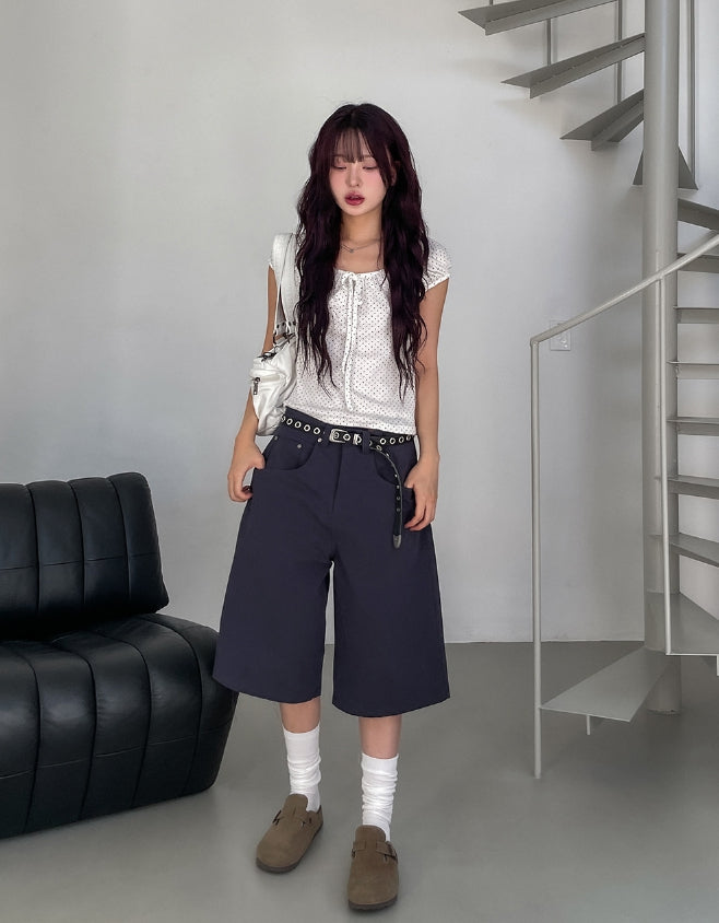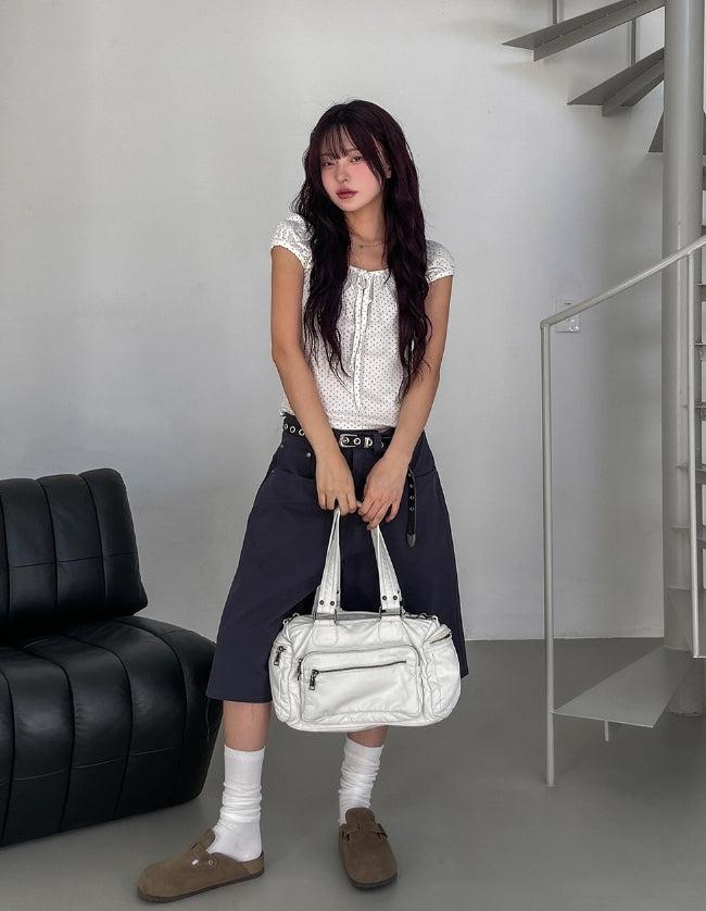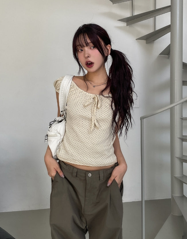 ドットリボンシャーリングパフオフショルダー半袖Tシャツ