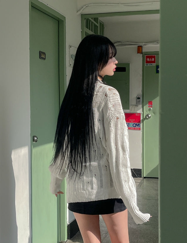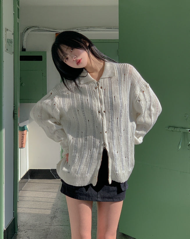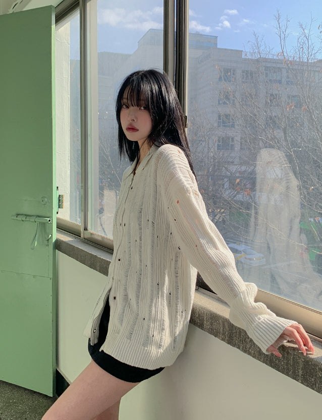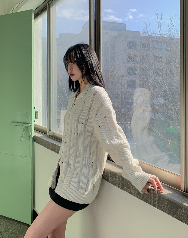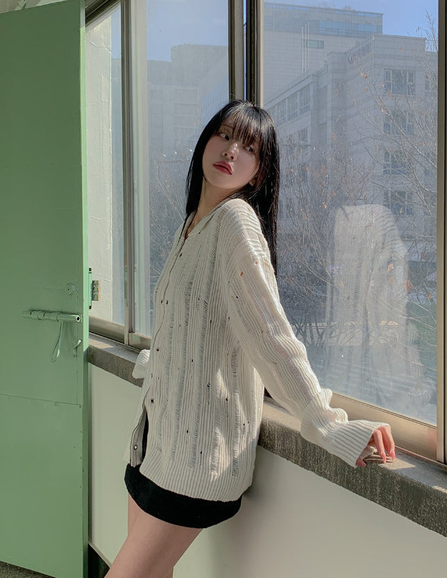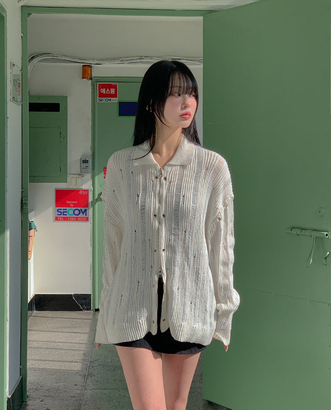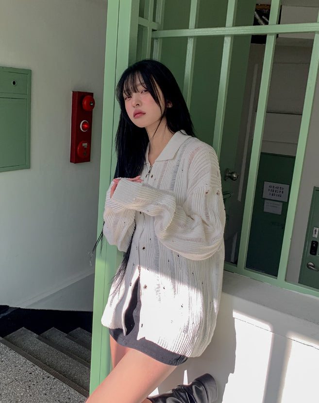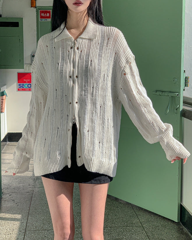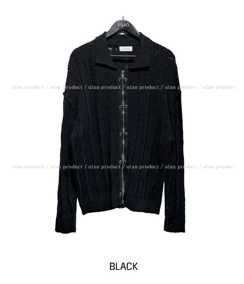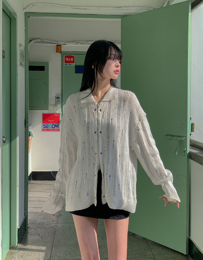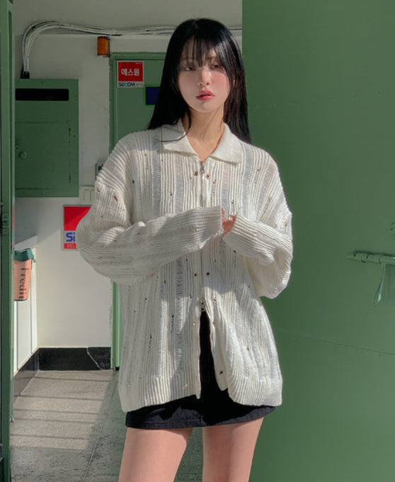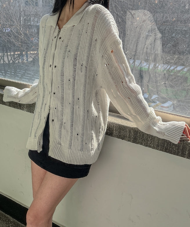 Hailey Damage Eyelet Two-Way Knit Zip-Up