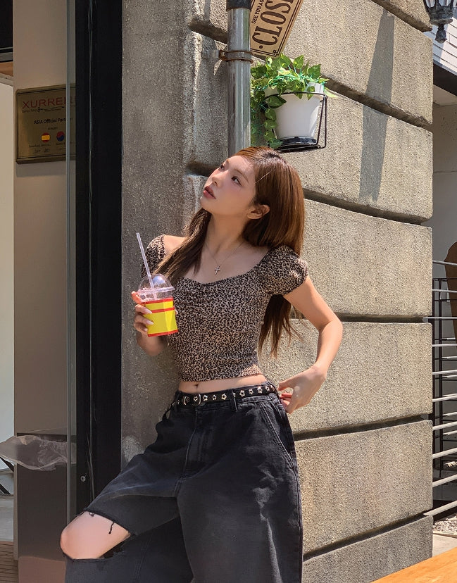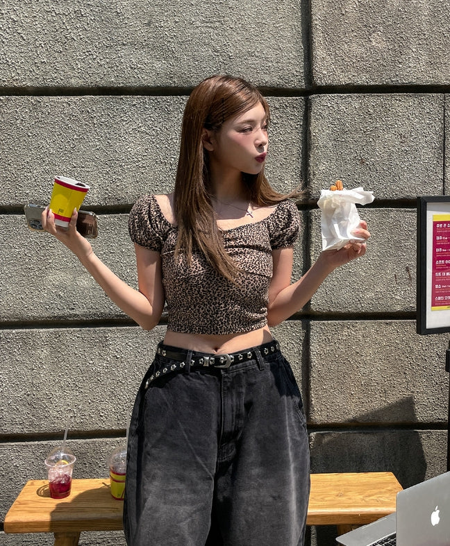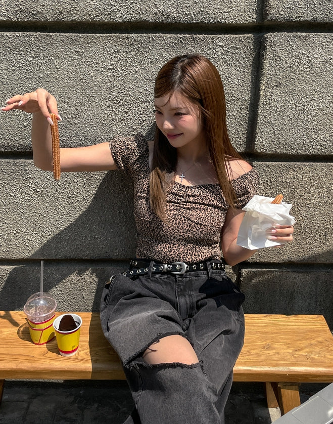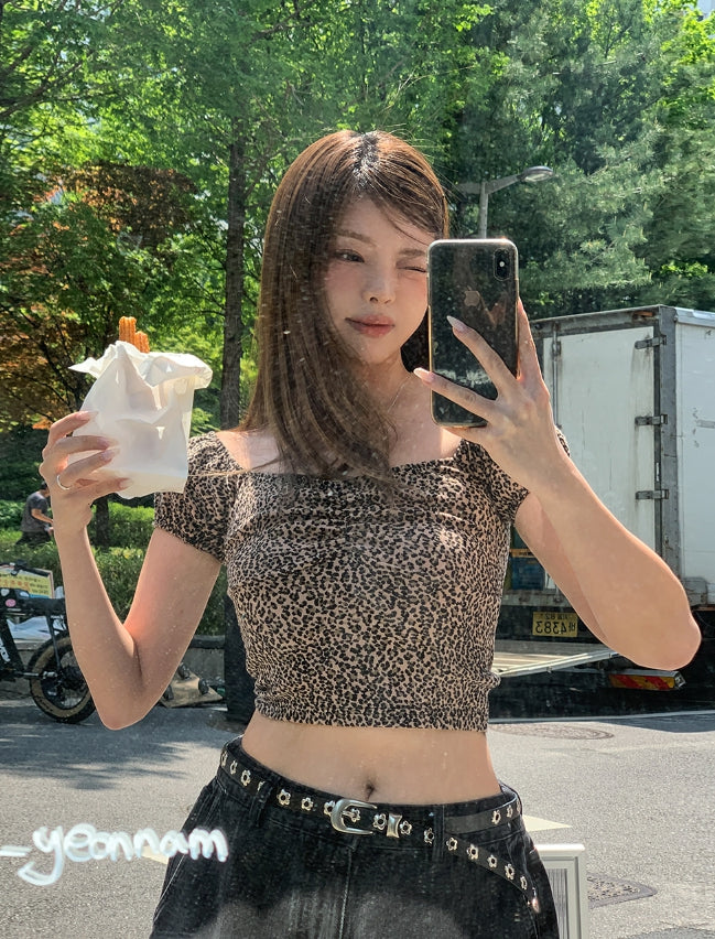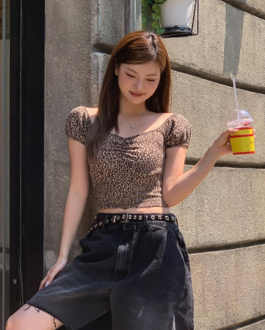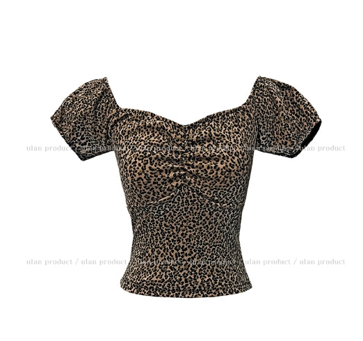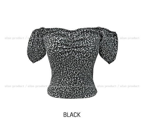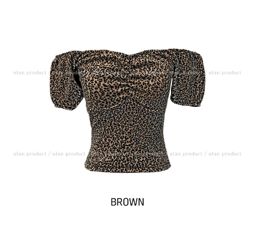 Leopard shirring puff off-shoulder short sleeve