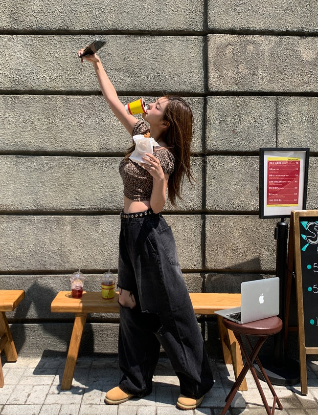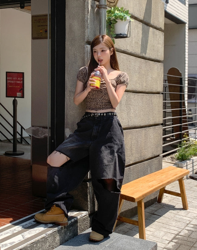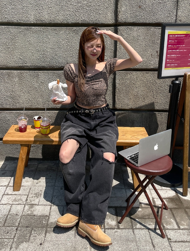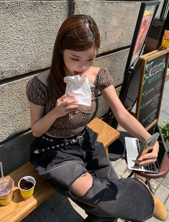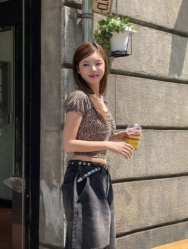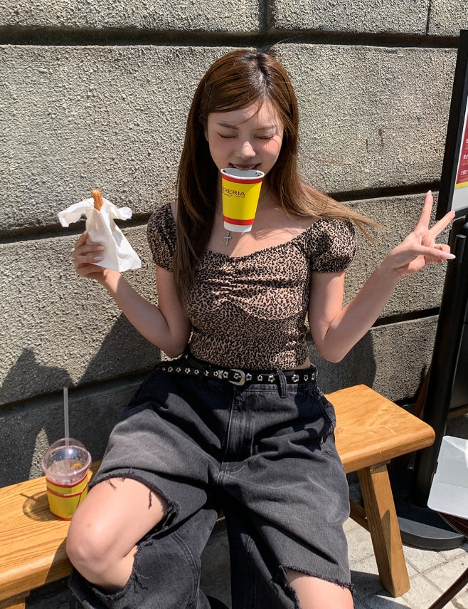 Leopard shirring puff off-shoulder short sleeve