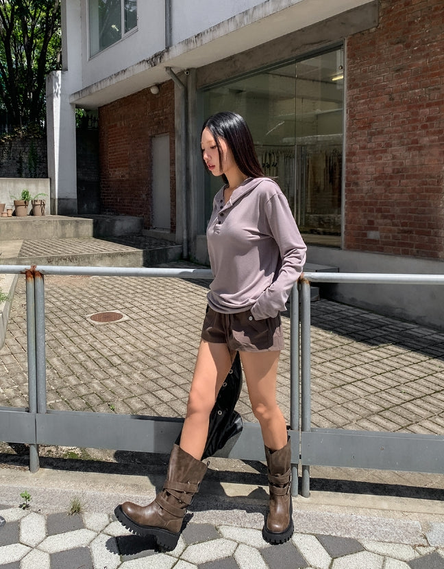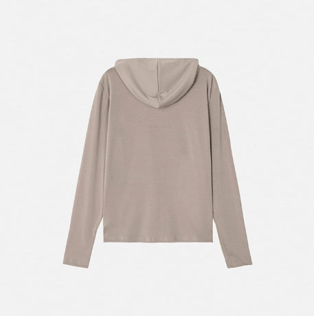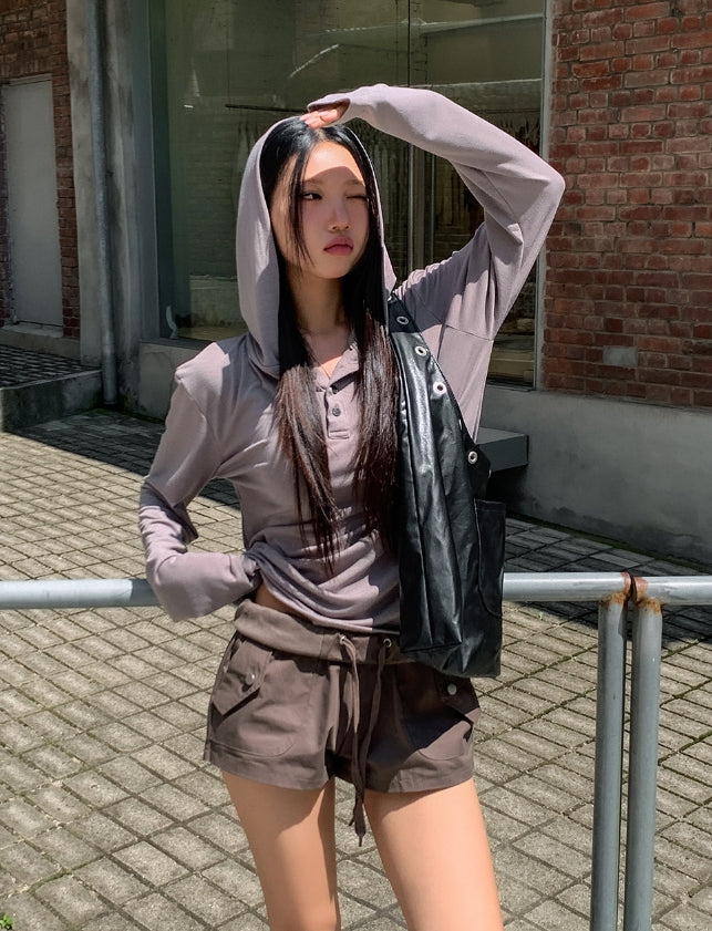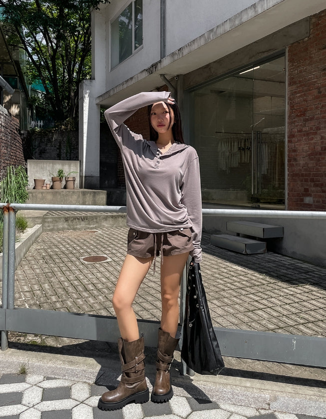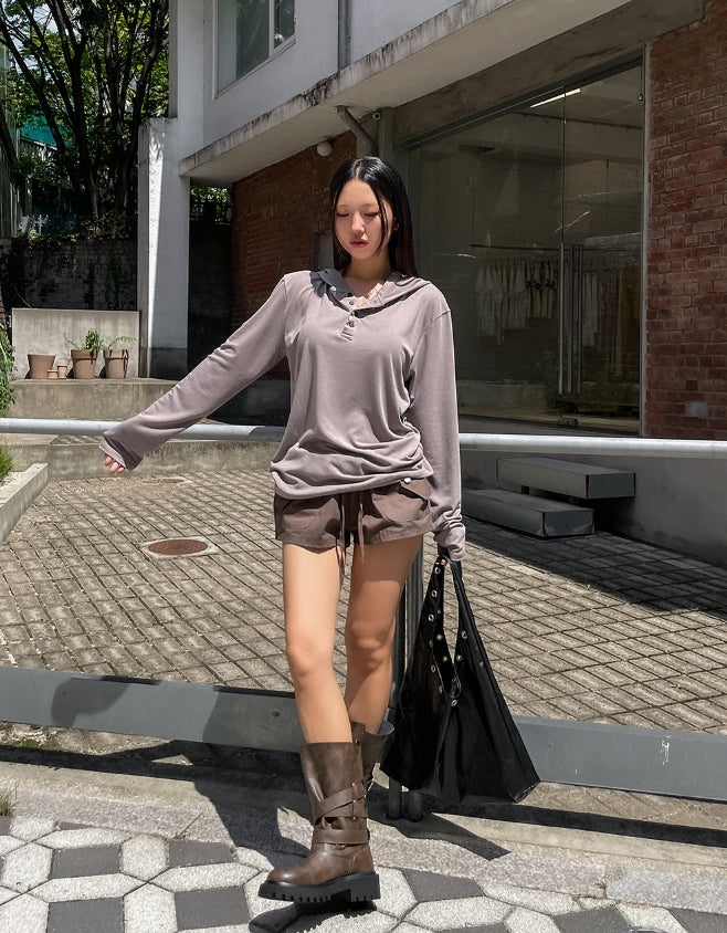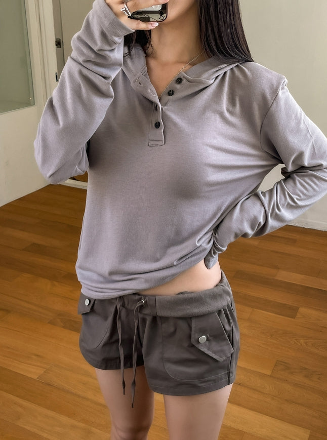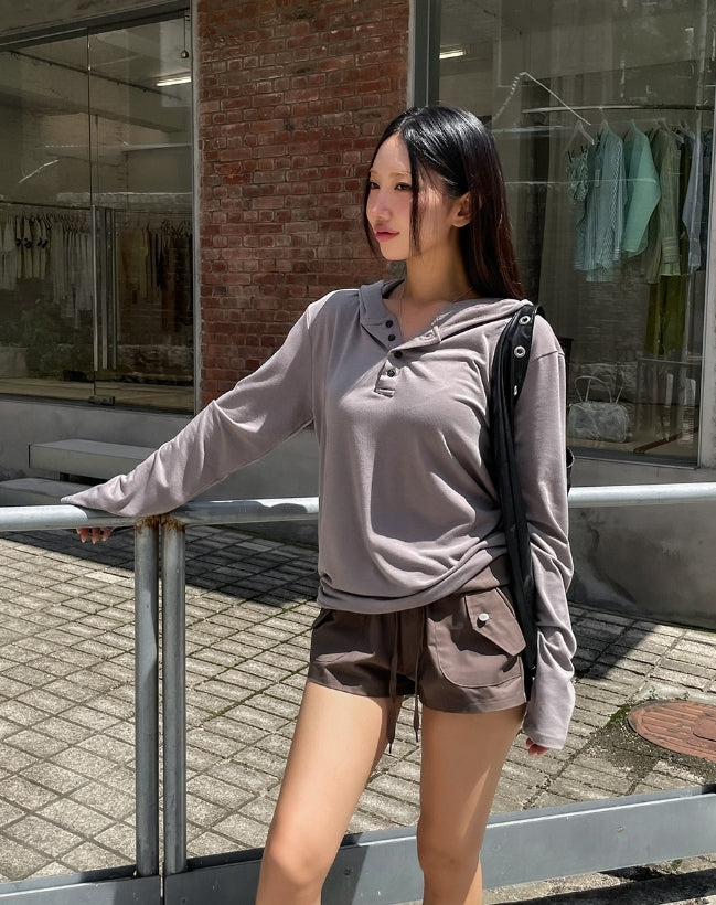 ムードルーズフィットヘンリーネック長袖フードTシャツ