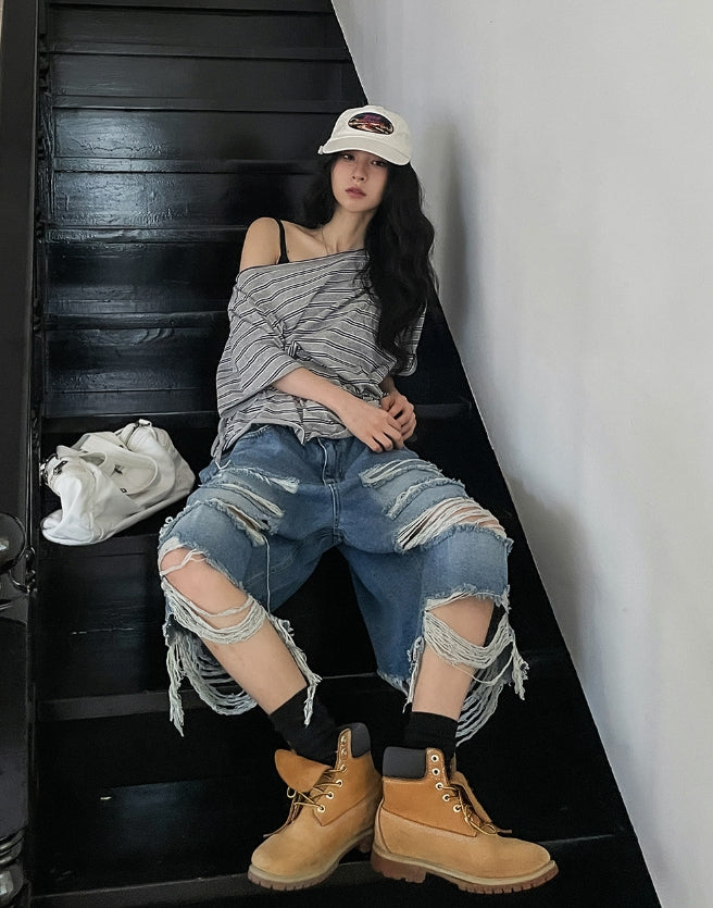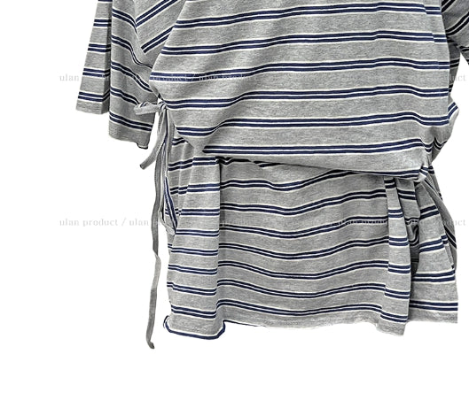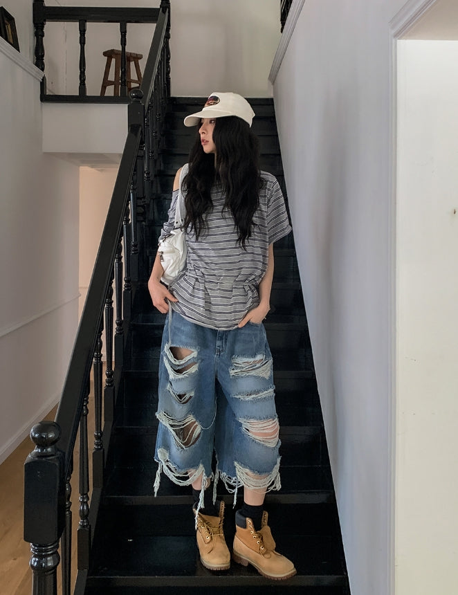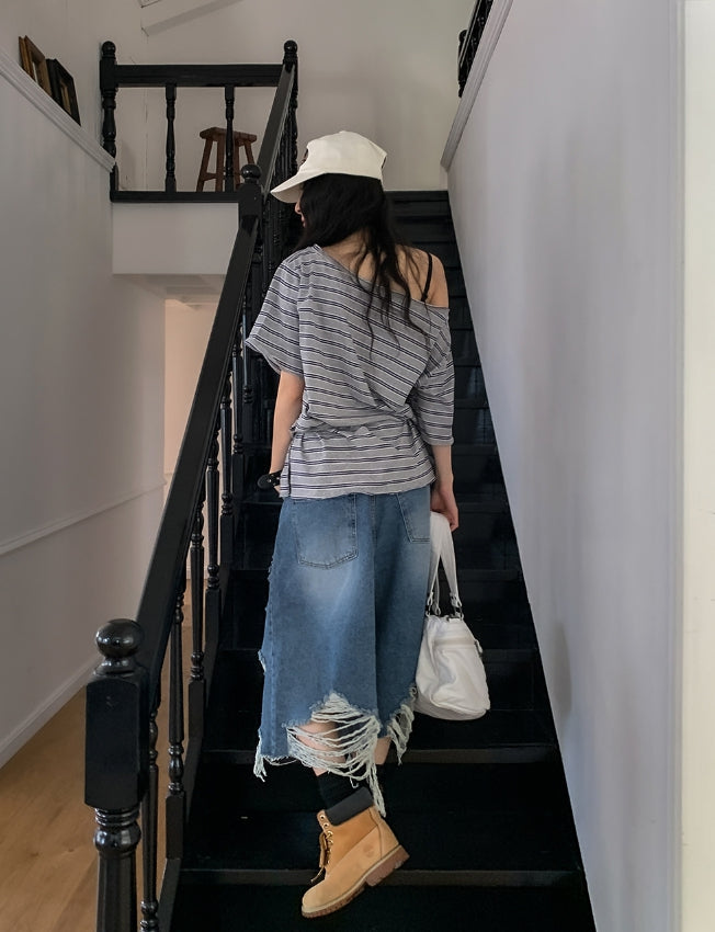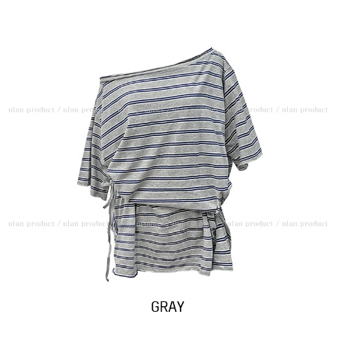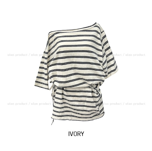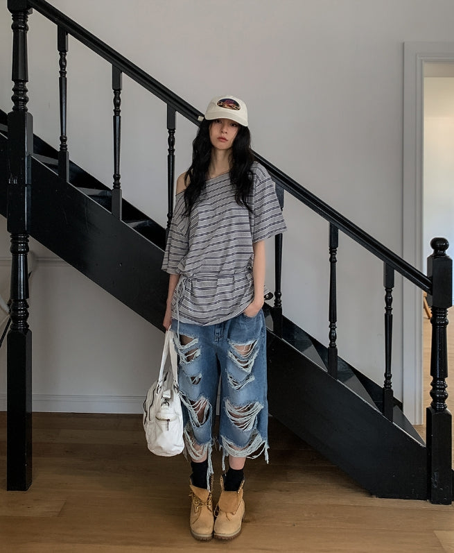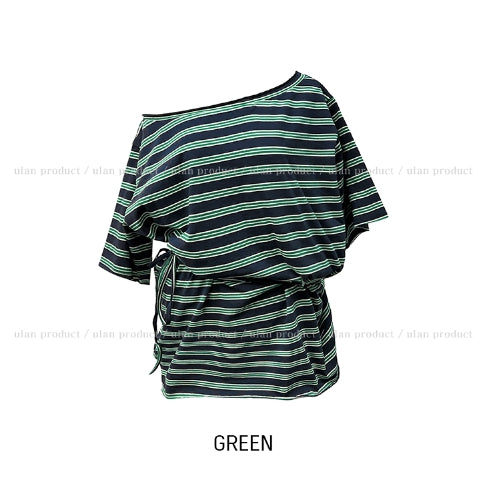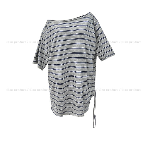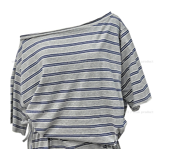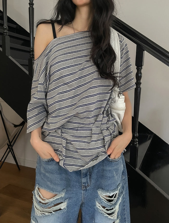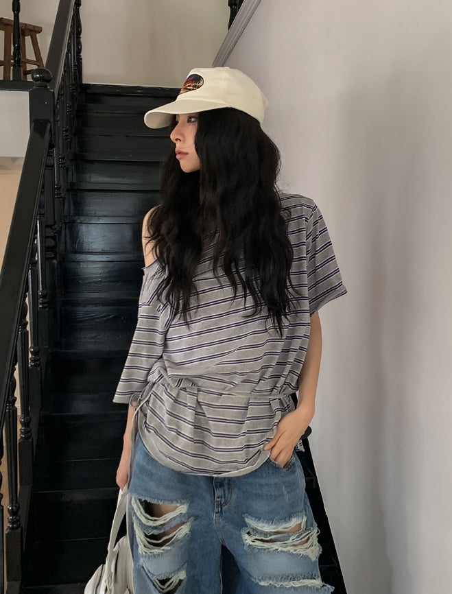 マルチボーダーストラップオフショルダー半袖Tシャツ
