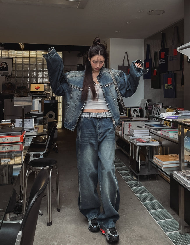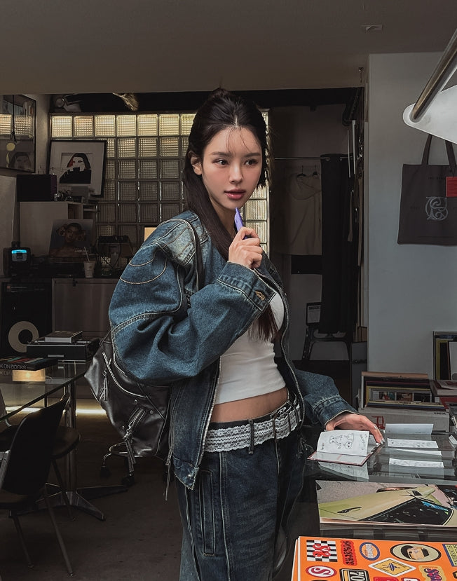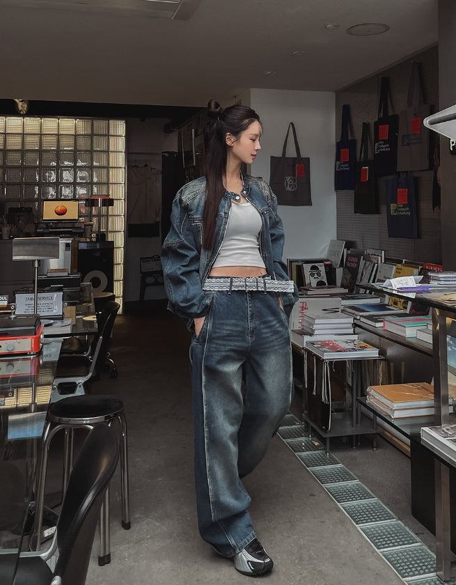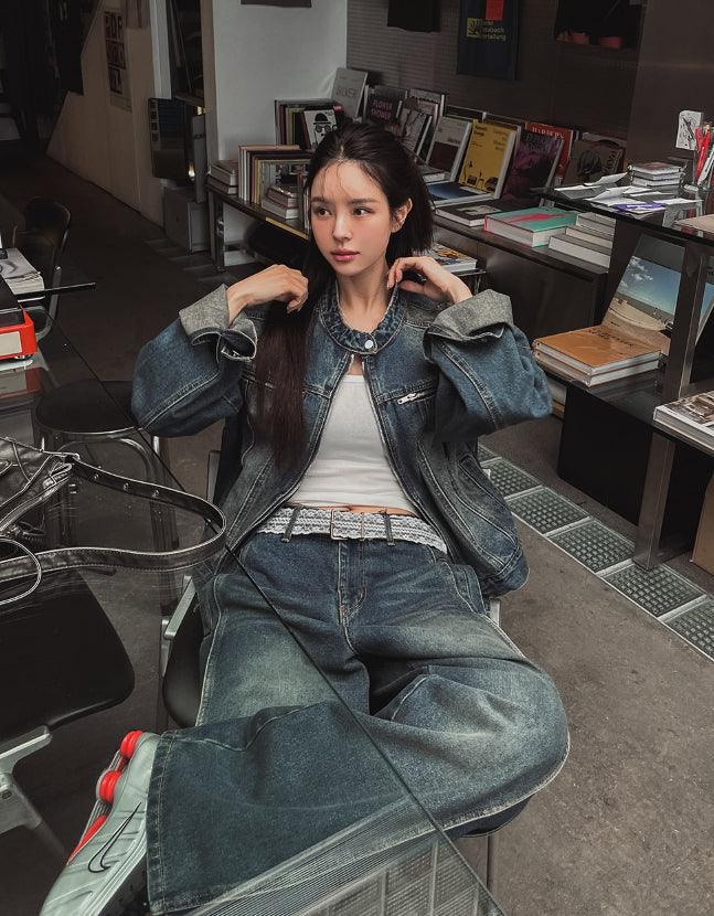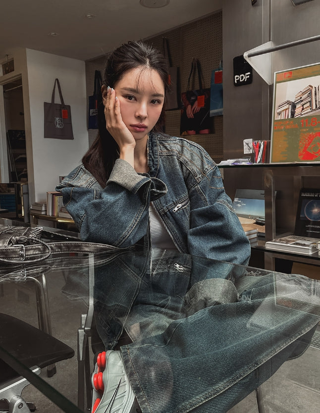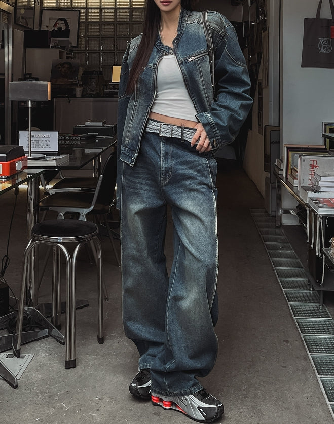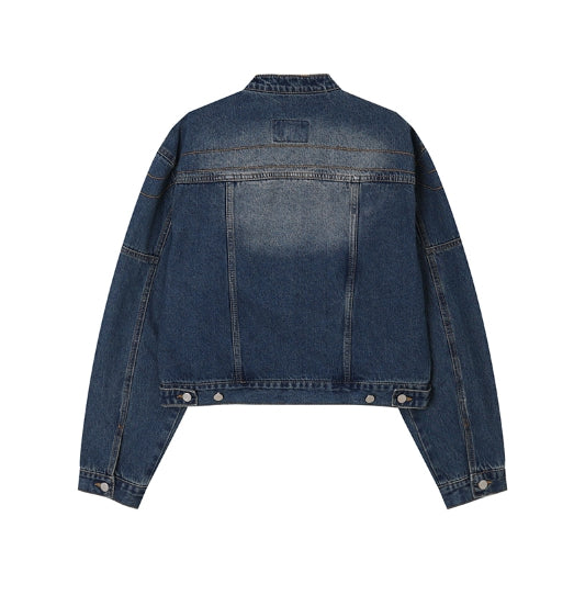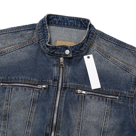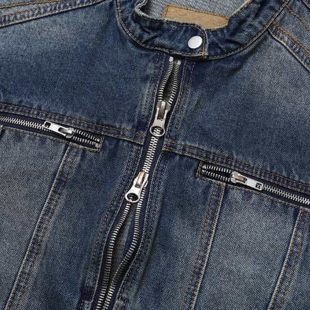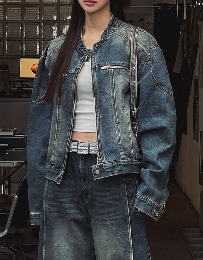 オーシャンウォッシュ加工ステッチバイカーデニムジャケット