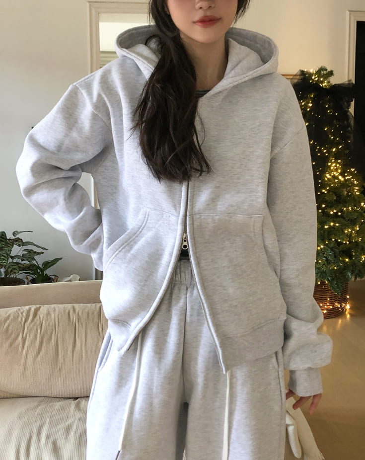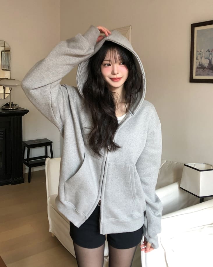 Poi Fingerhole Two-Way Brushed Hooded Zip-Up
