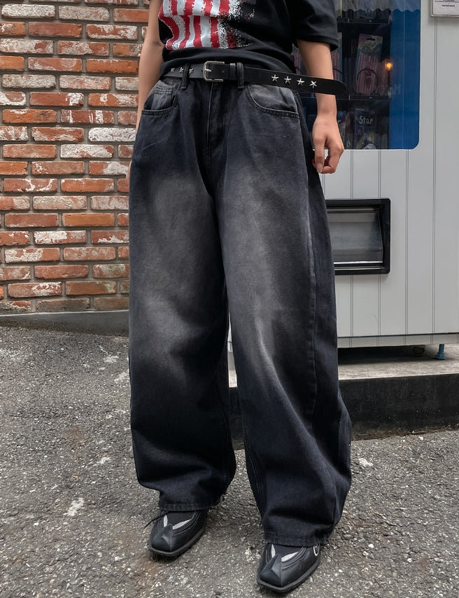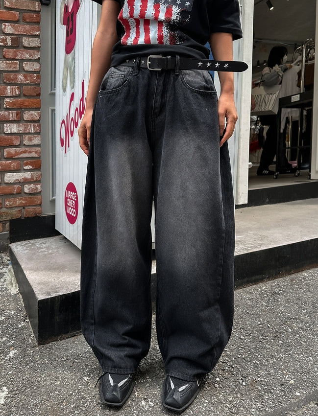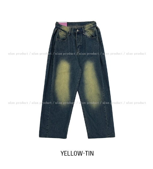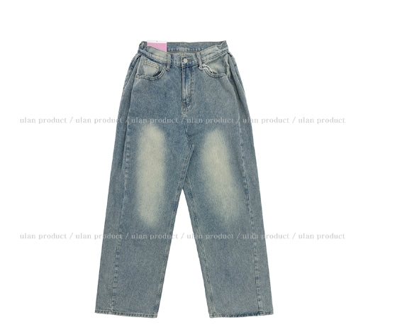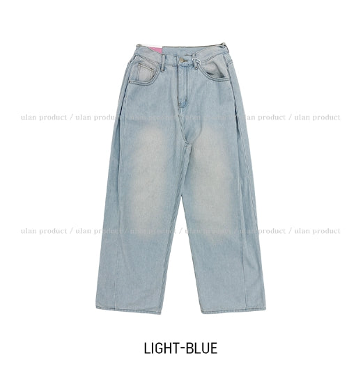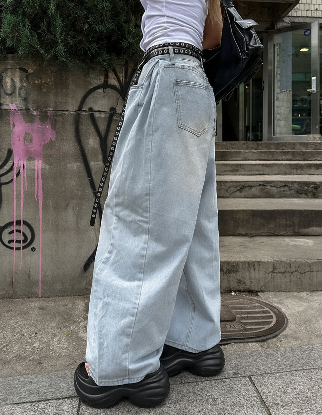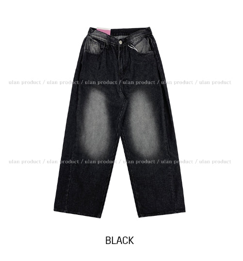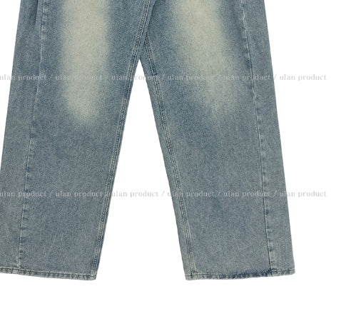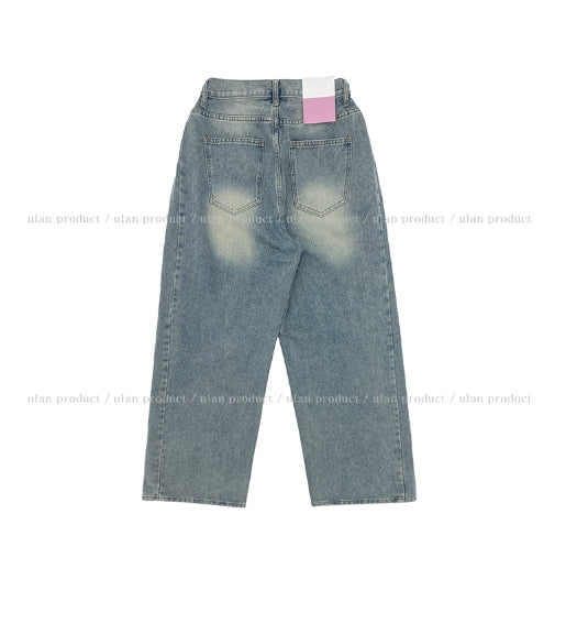 サイドピンタックウォッシュ加工ワイドデニムパンツ