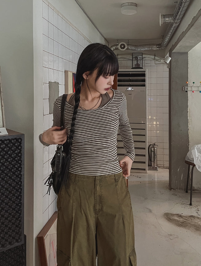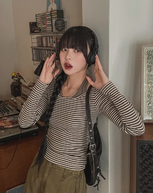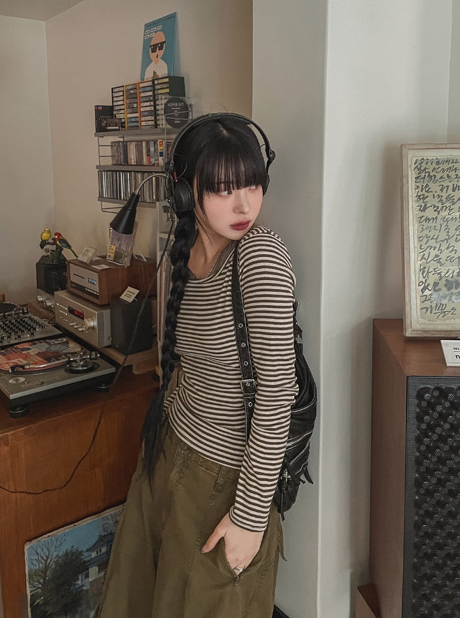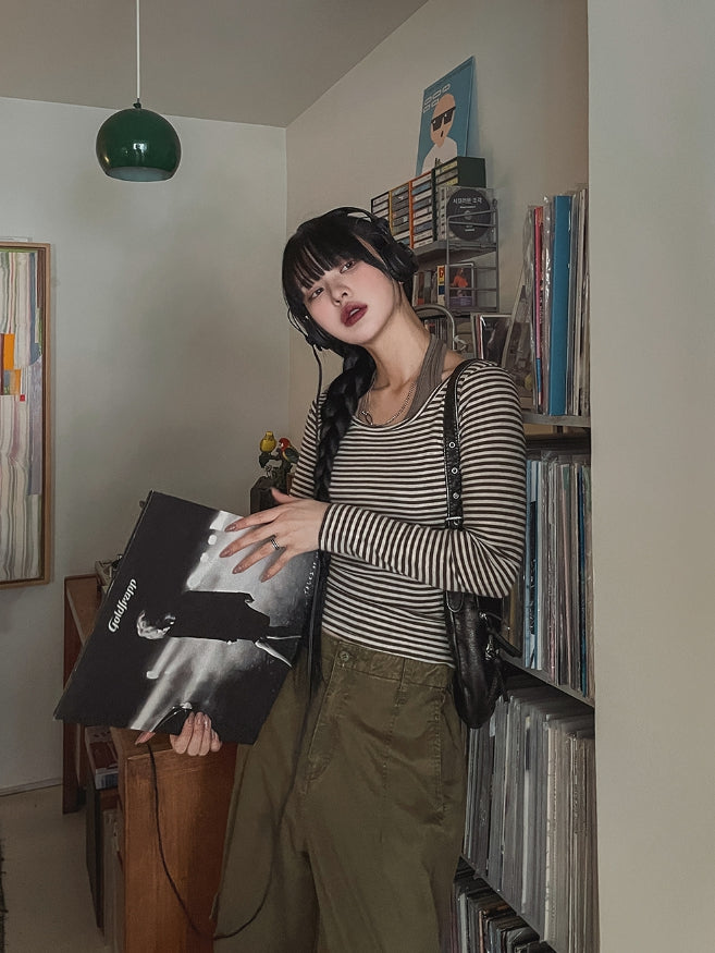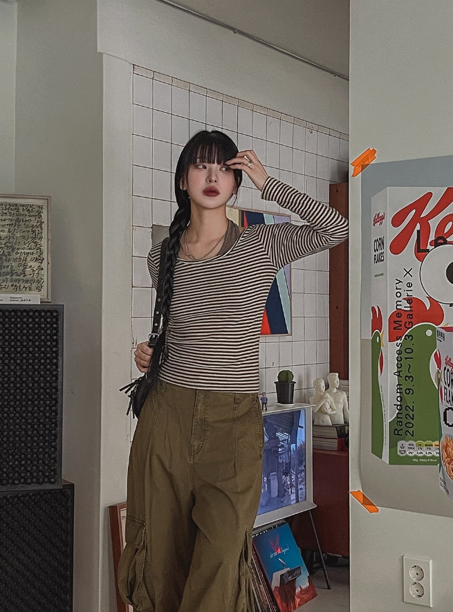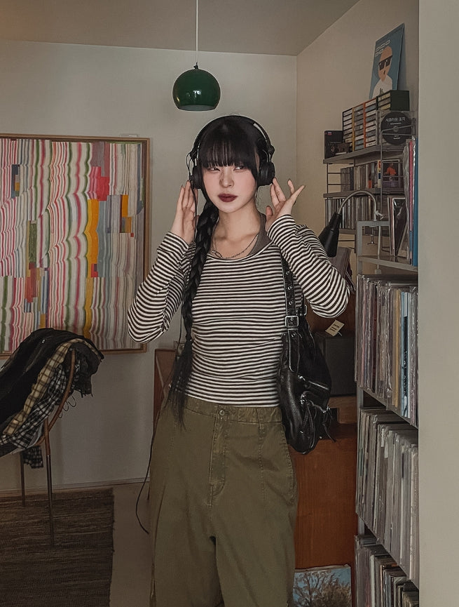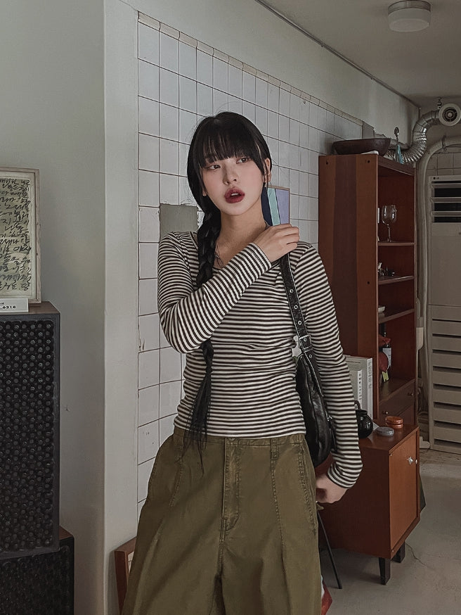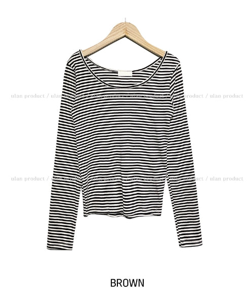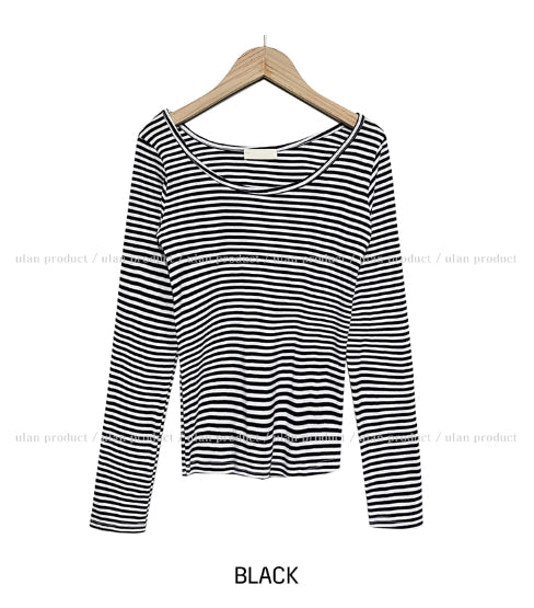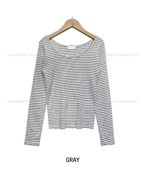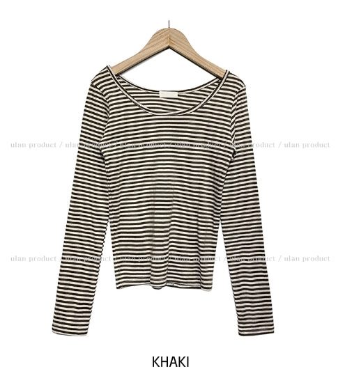 [U-BASIC] Seril Stripe U-Neck Long Sleeve Tee