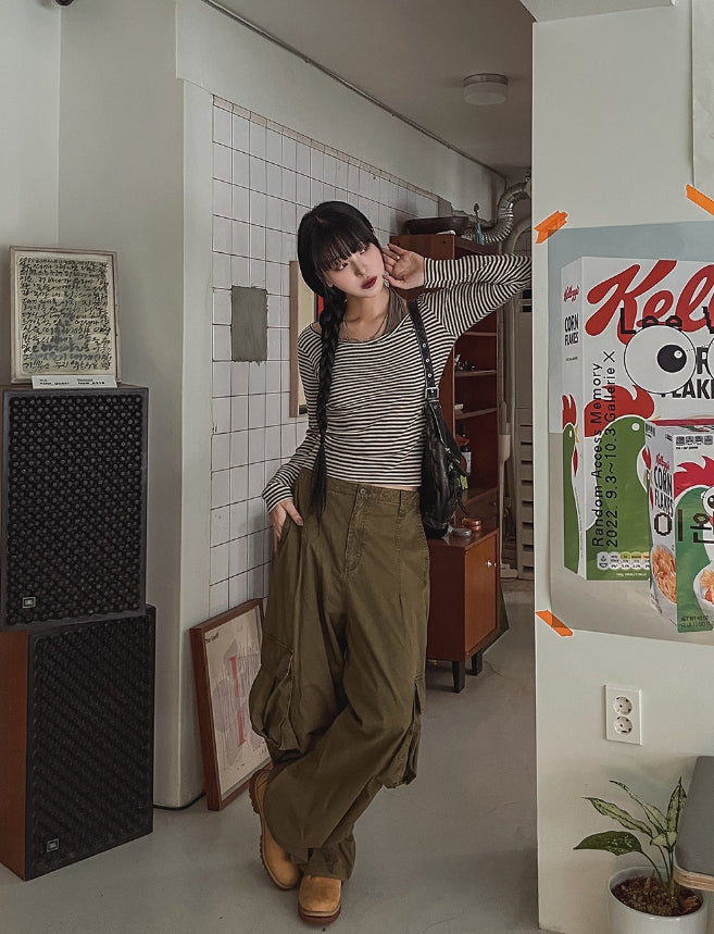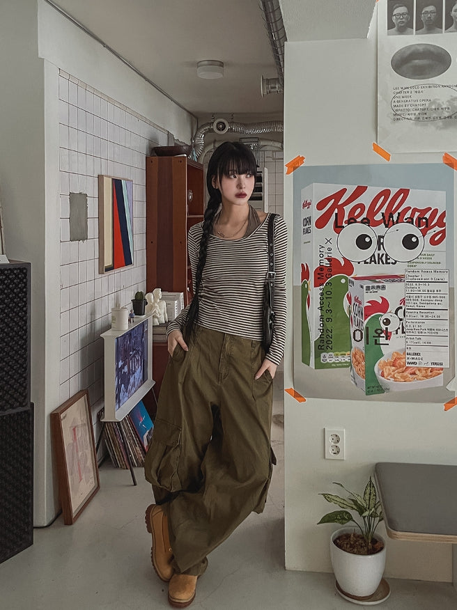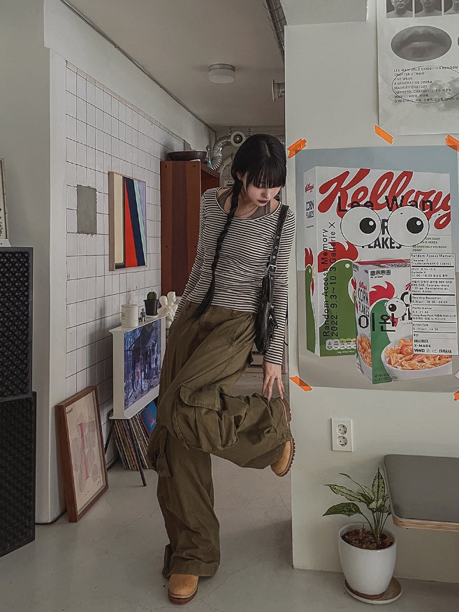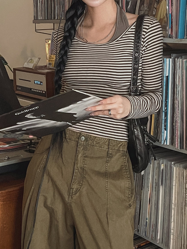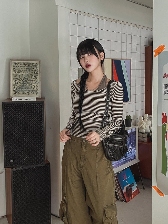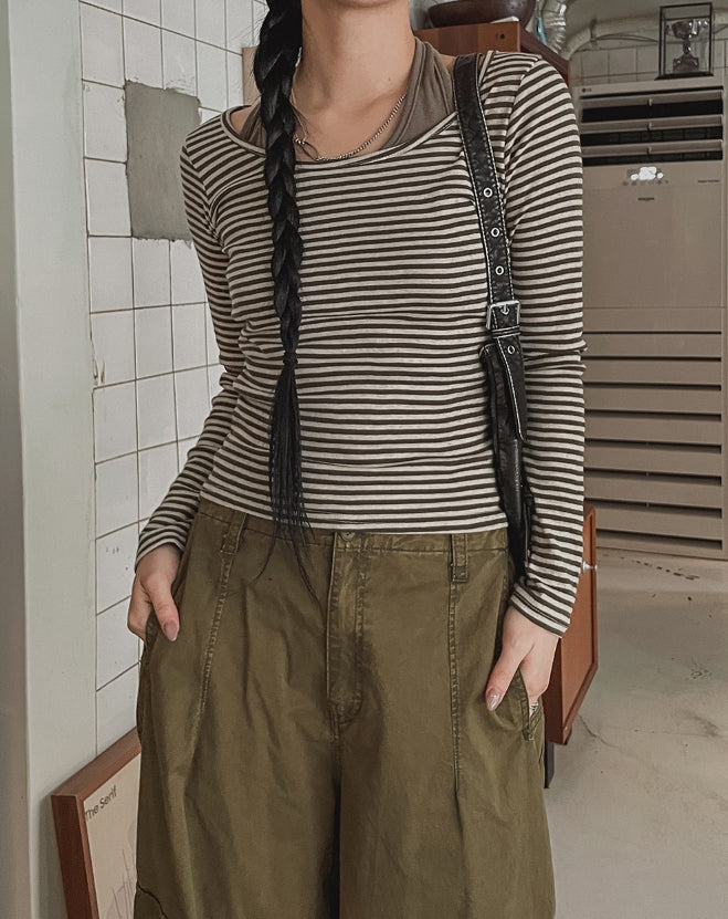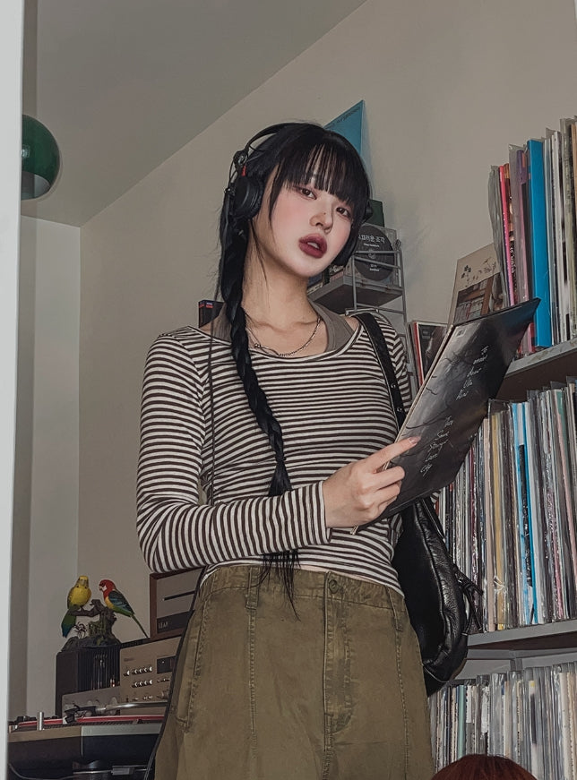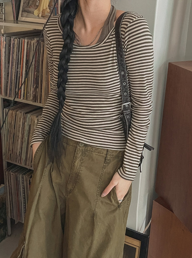 [U-BASIC] Seril Stripe U-Neck Long Sleeve Tee