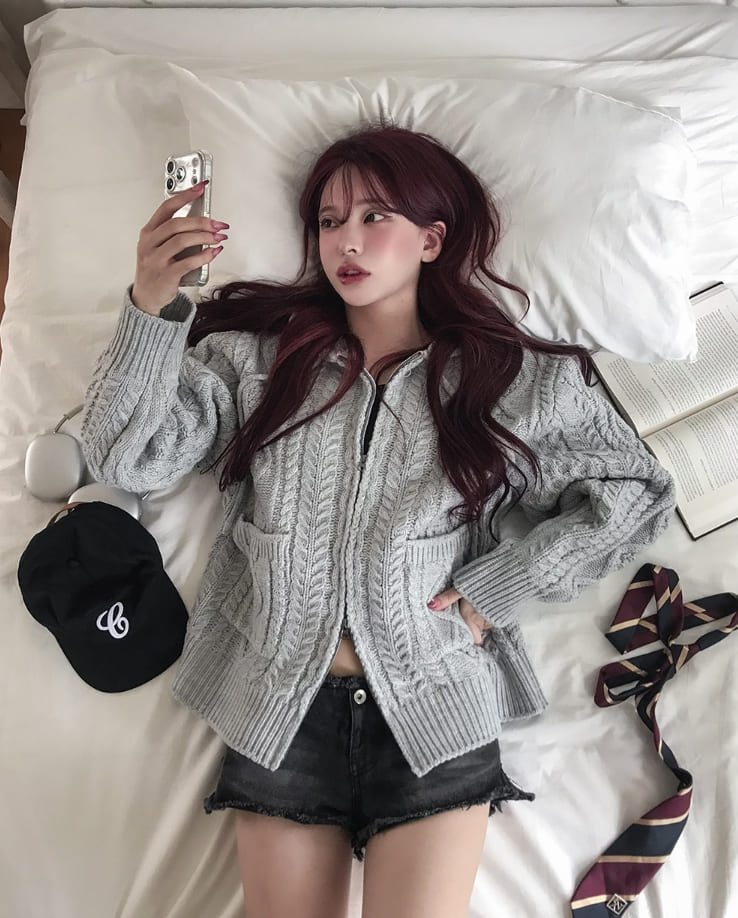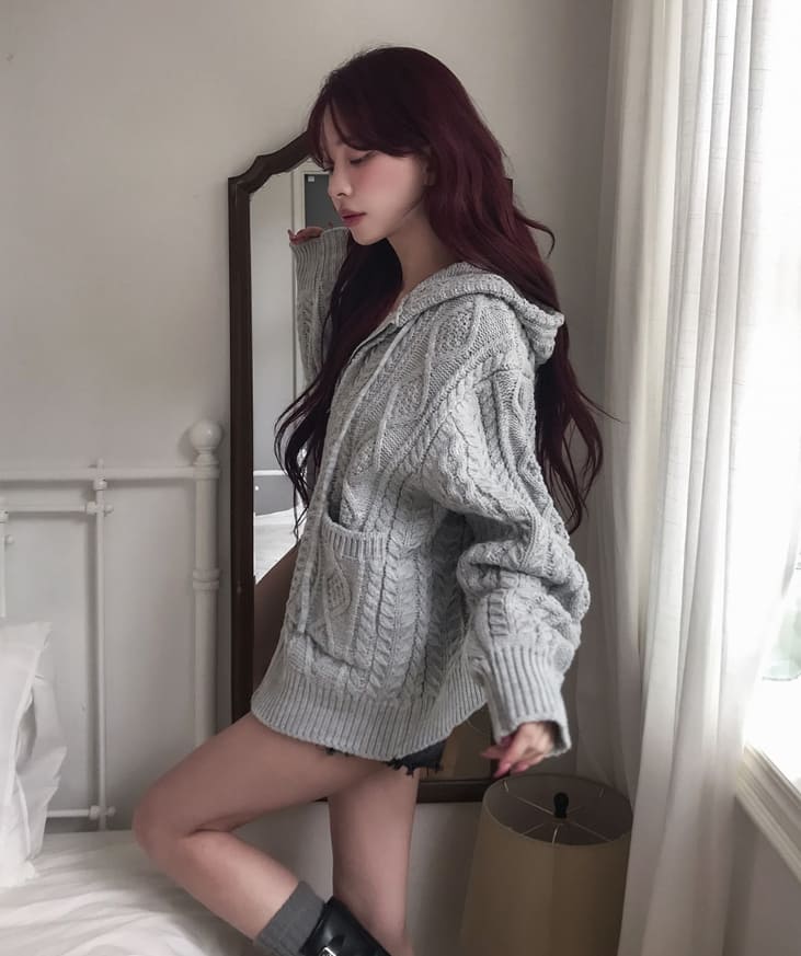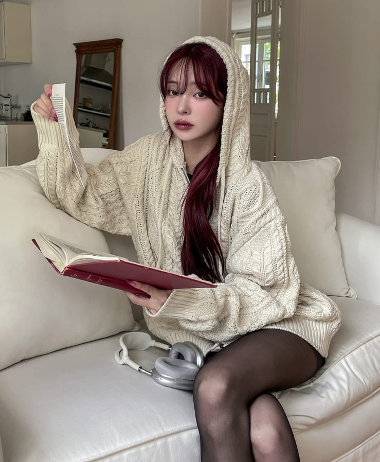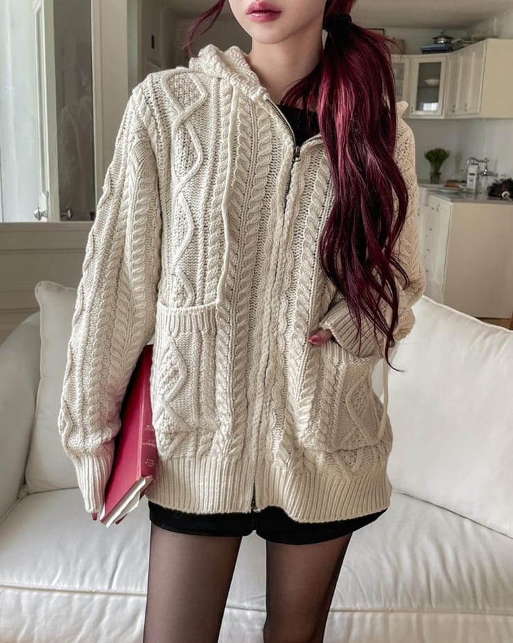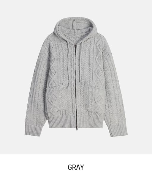 [wool30%] Woods Cable Two-Way Knit Hooded Zip-Up