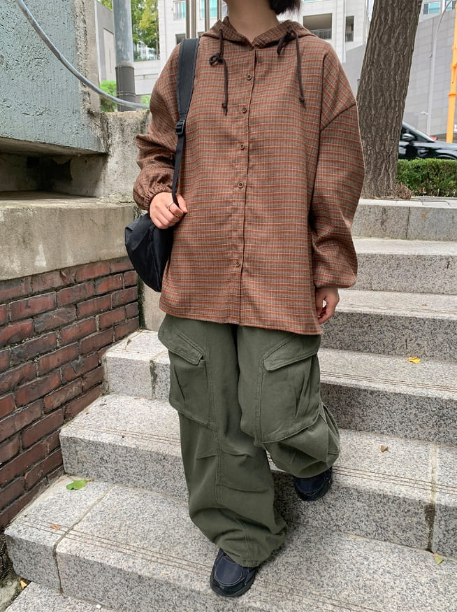 [BAONHAUS] Almeve Peach Fuzz Check Over Hood Shirt