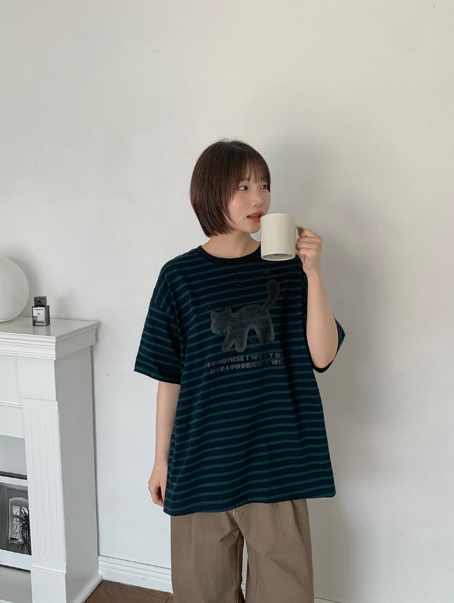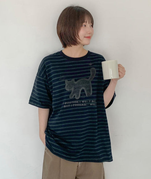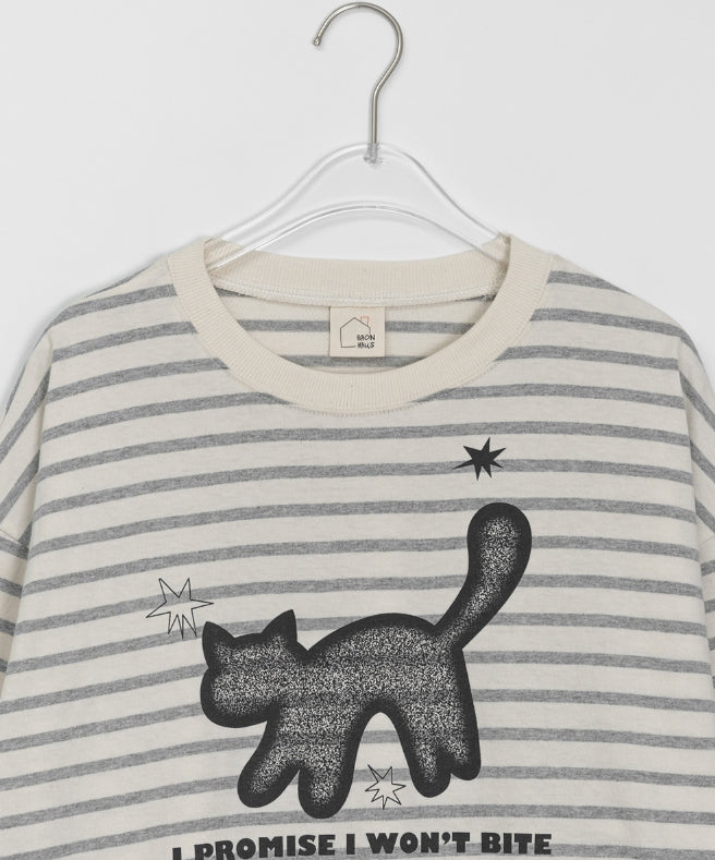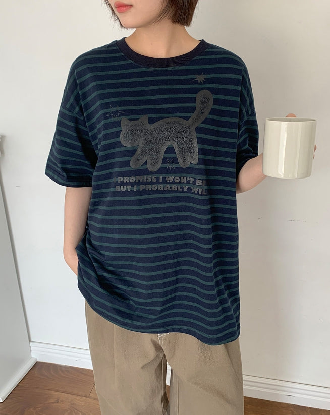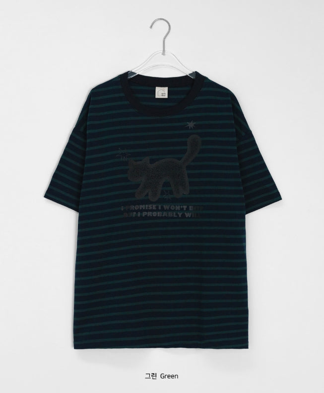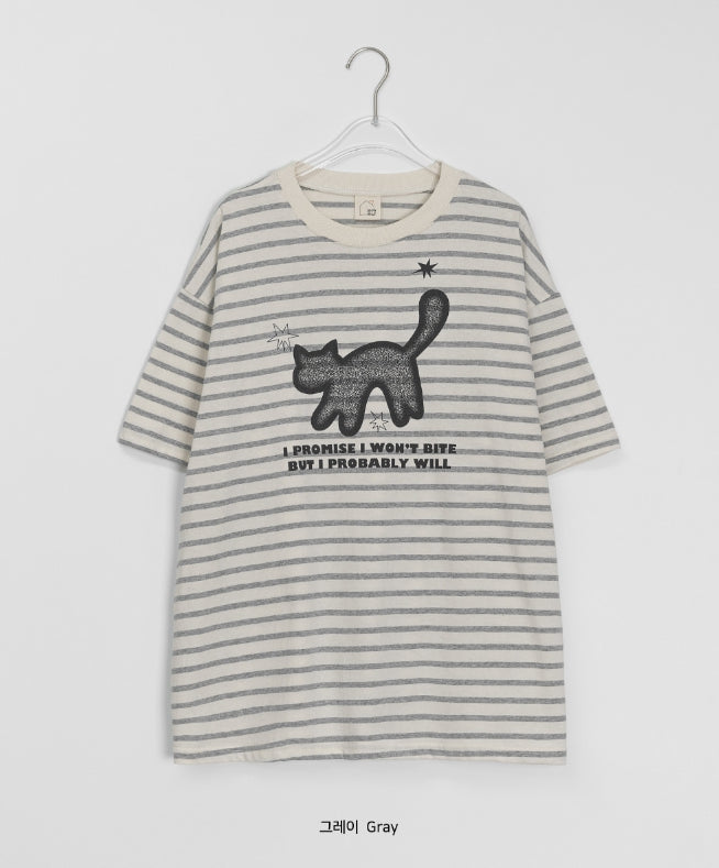 [BAONHAUS] Hahil Stripe Cat Over Short Sleeve Tee