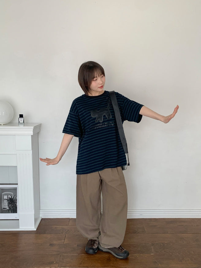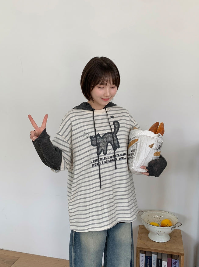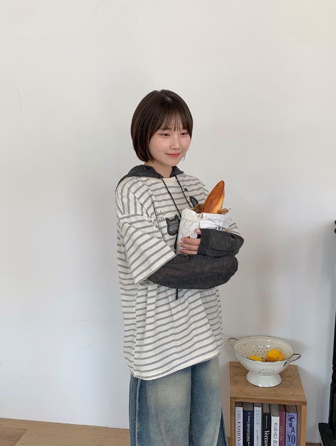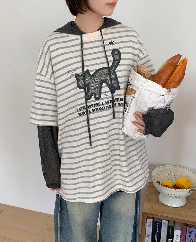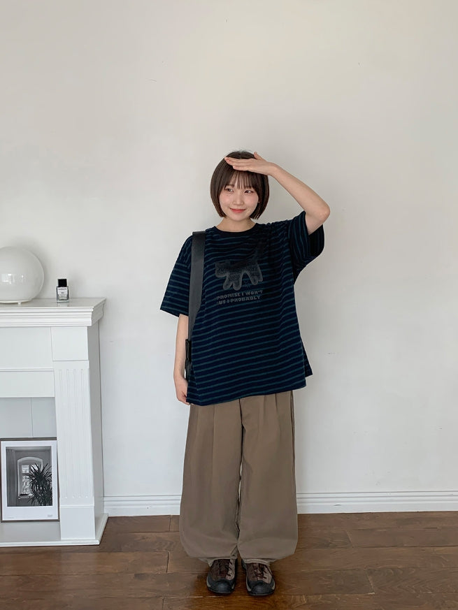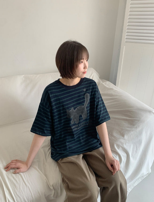 [BAONHAUS] Hahil Stripe Cat Over Short Sleeve Tee