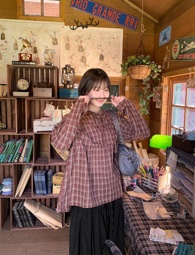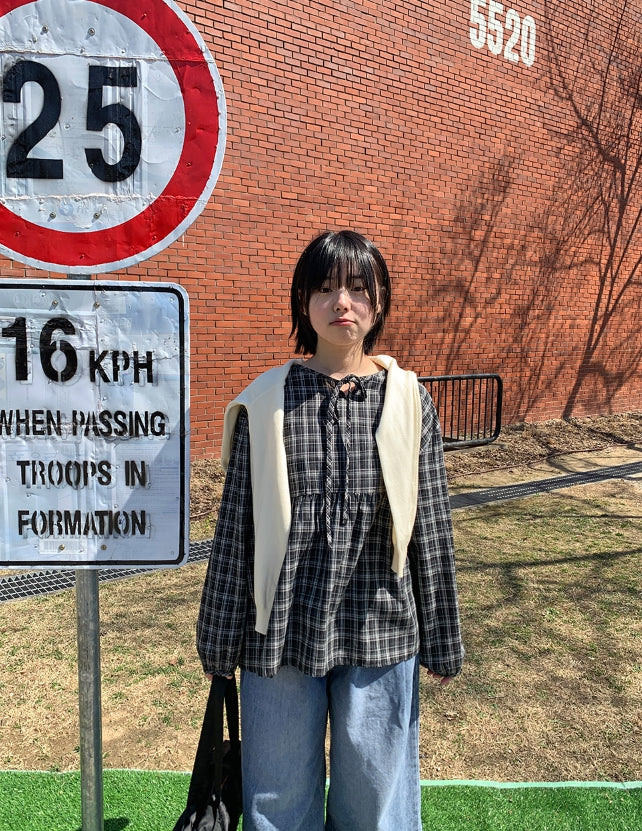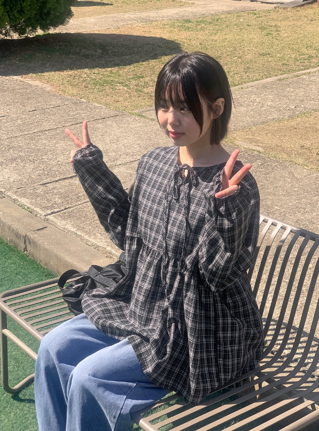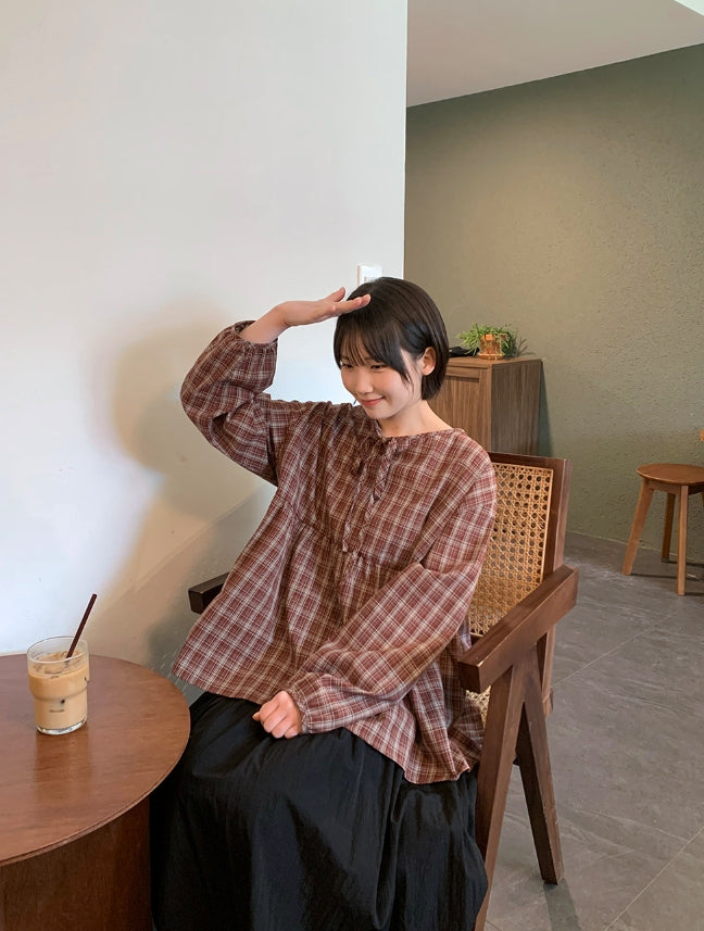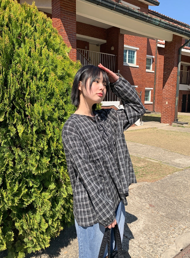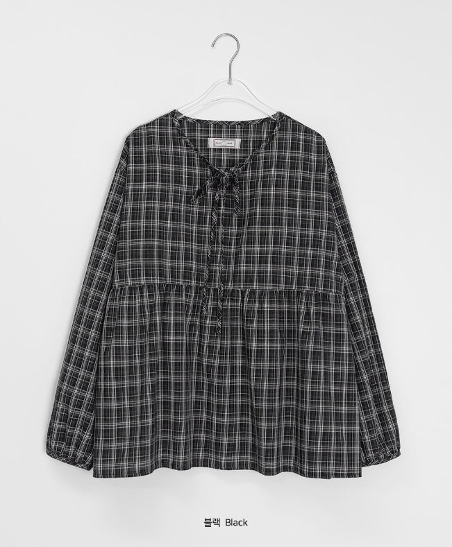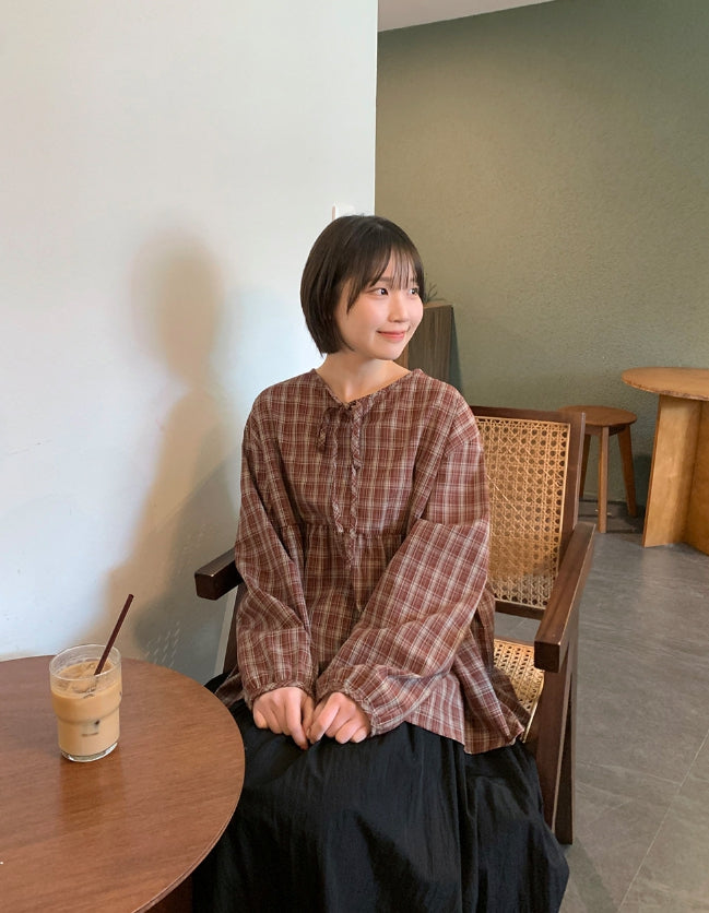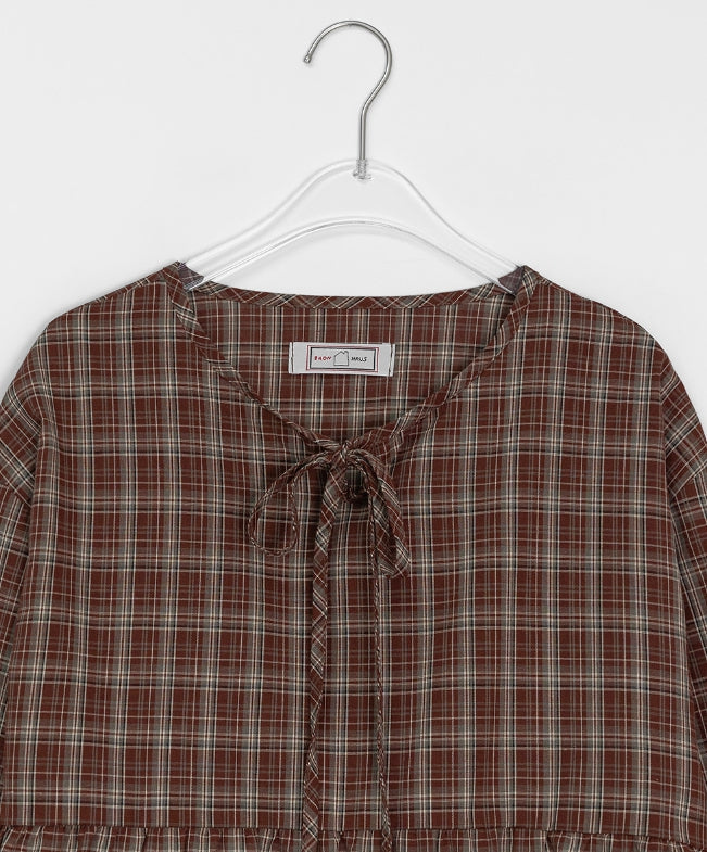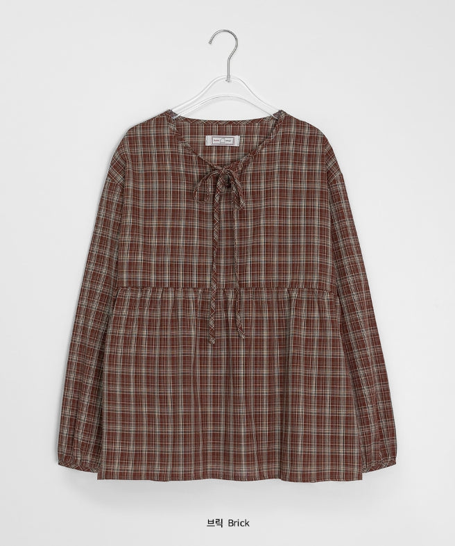 [BAONHAUS] Raminne Check Ribbon Shirring Blouse