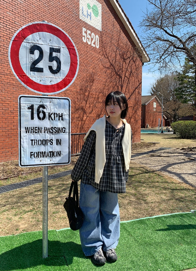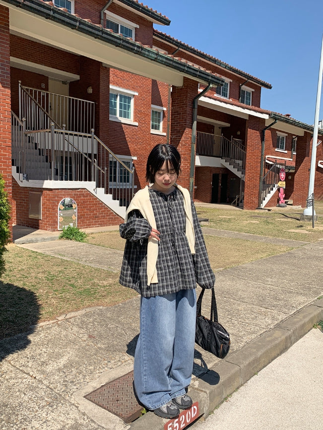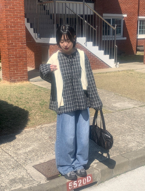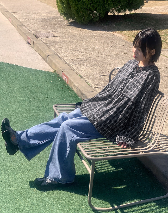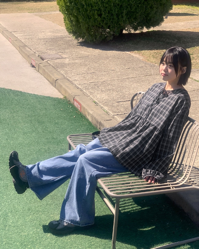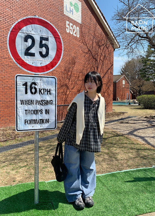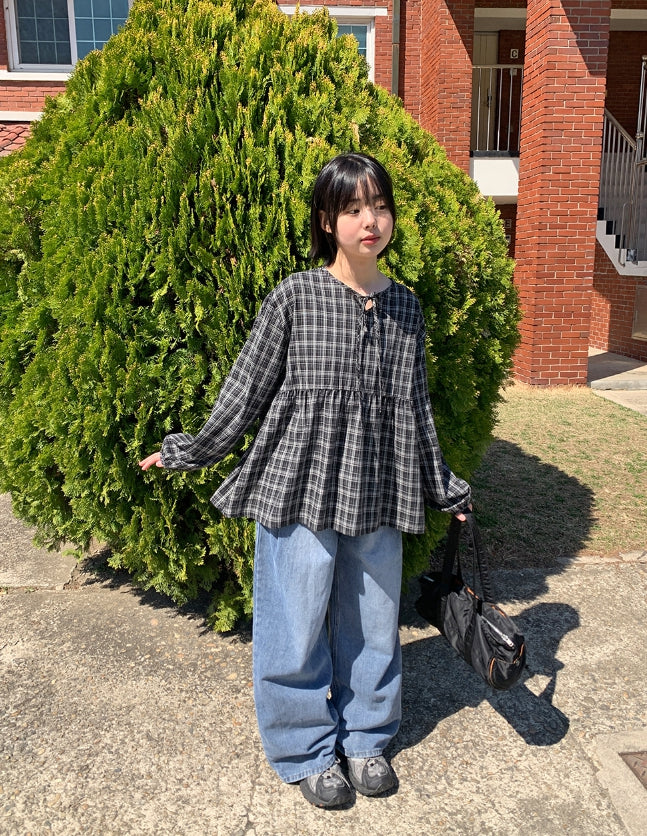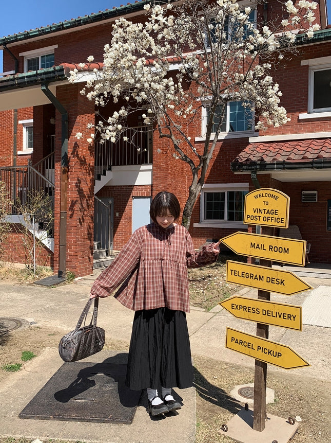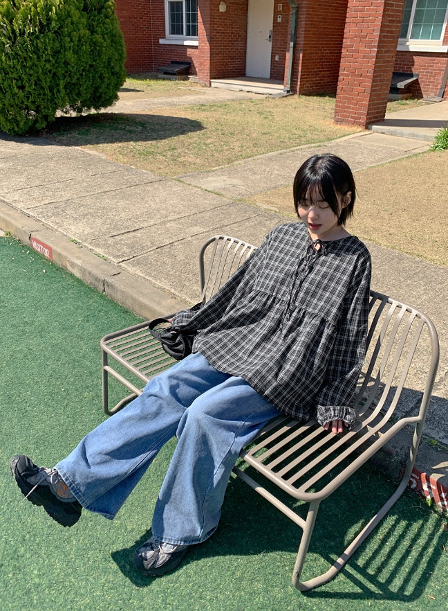 [BAONHAUS] Raminne Check Ribbon Shirring Blouse
