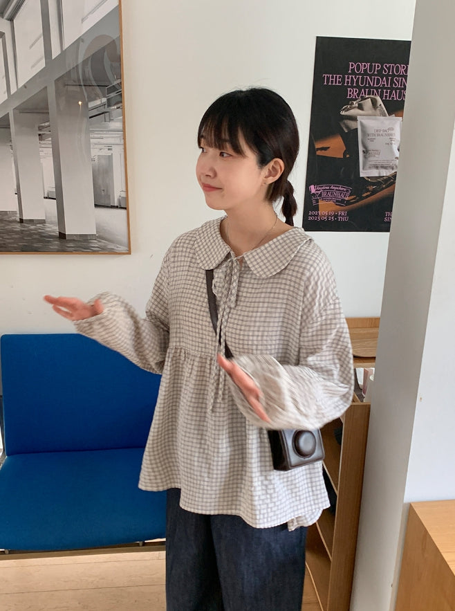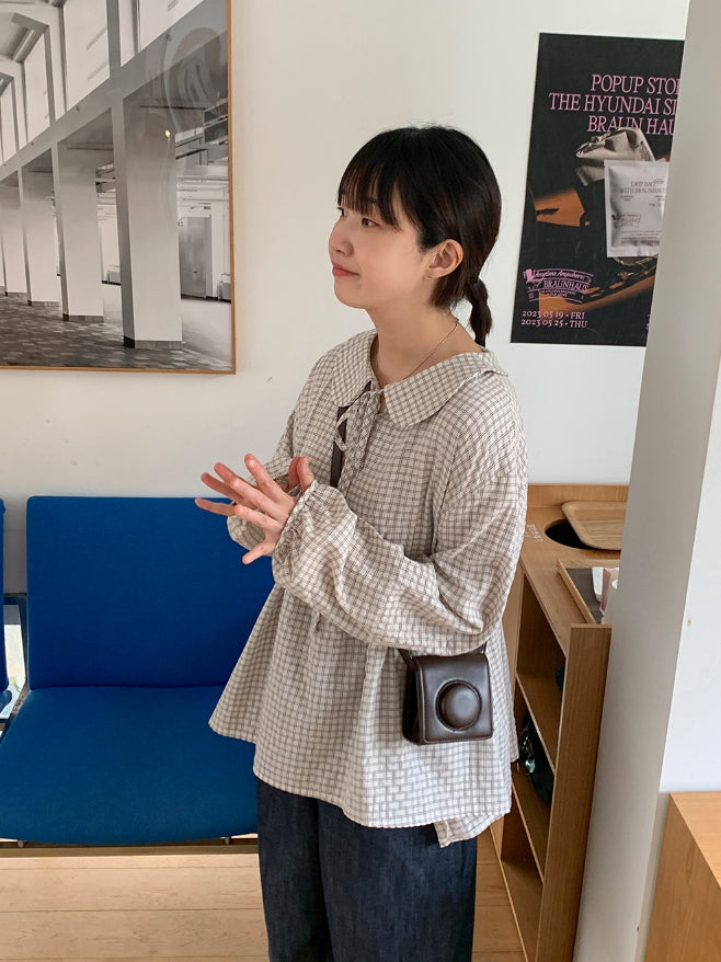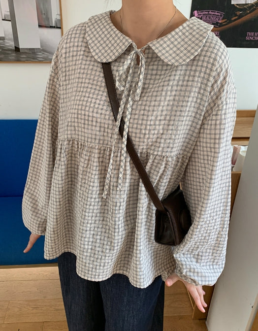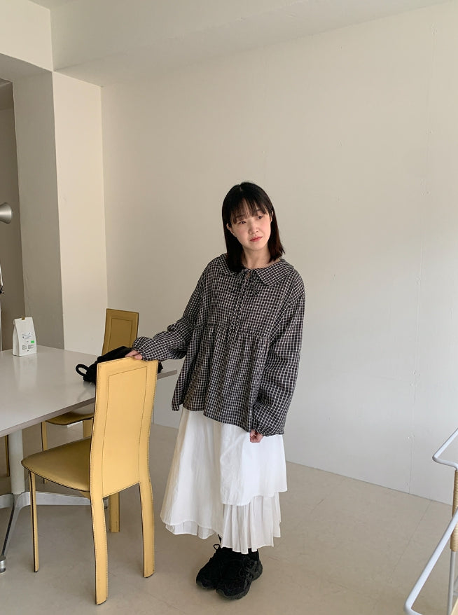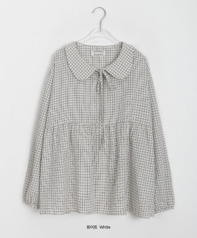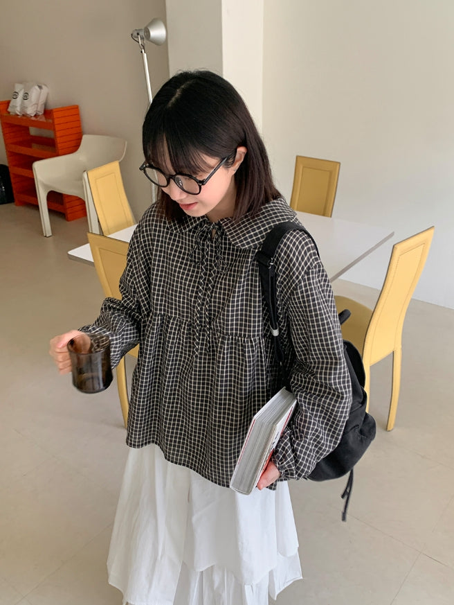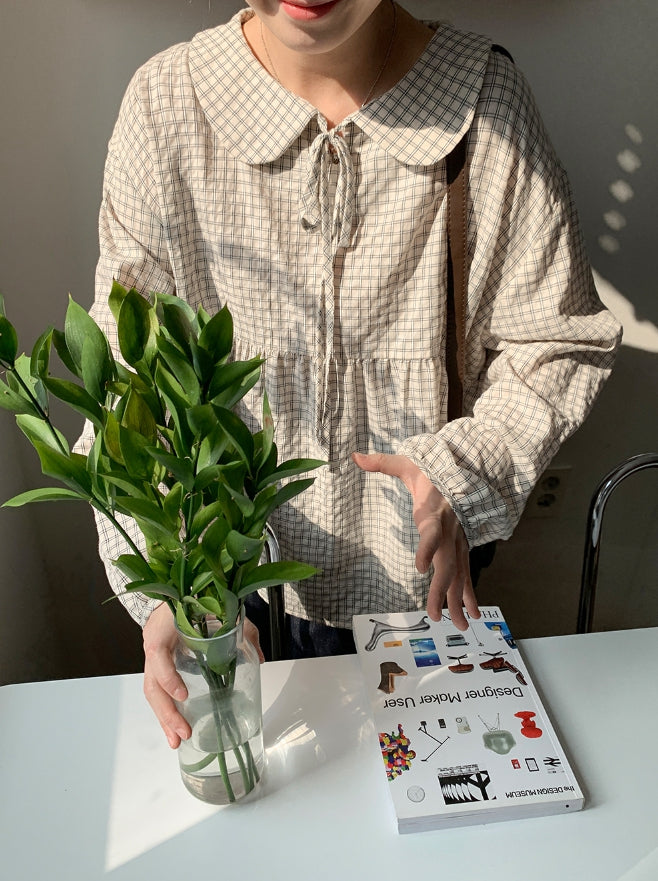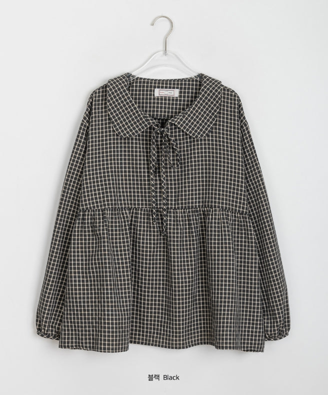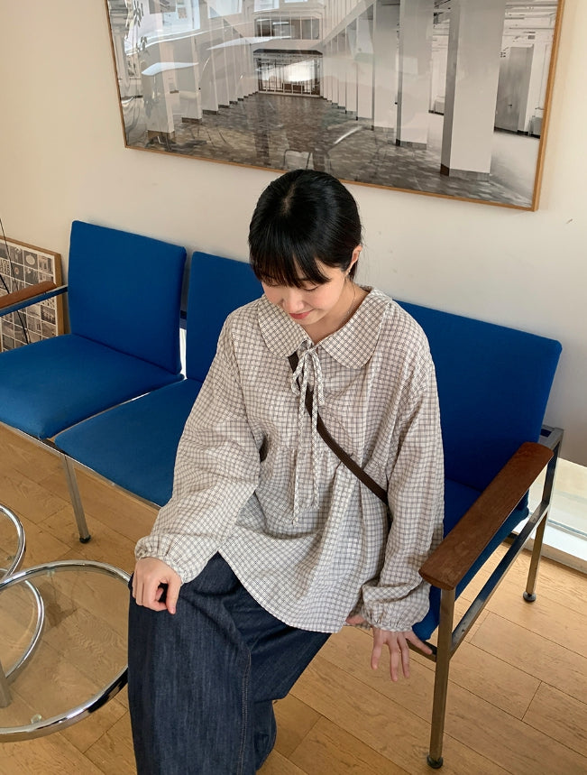 [BAONHAUS] Yokon Check Ribbon Shirring Blouse