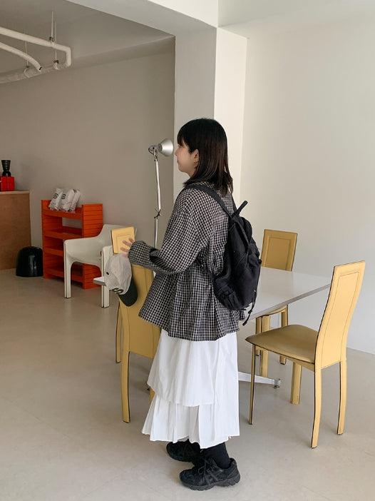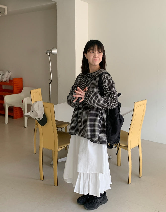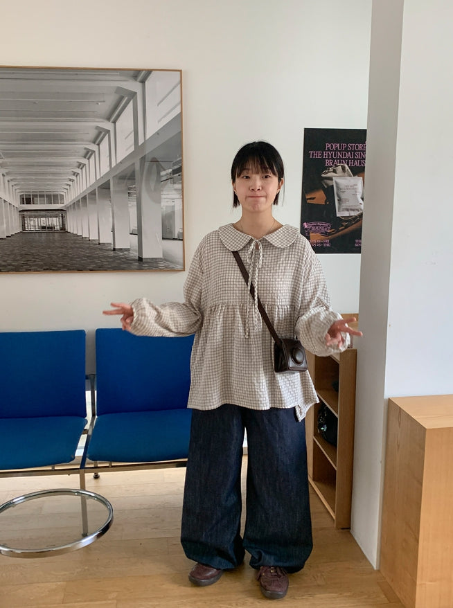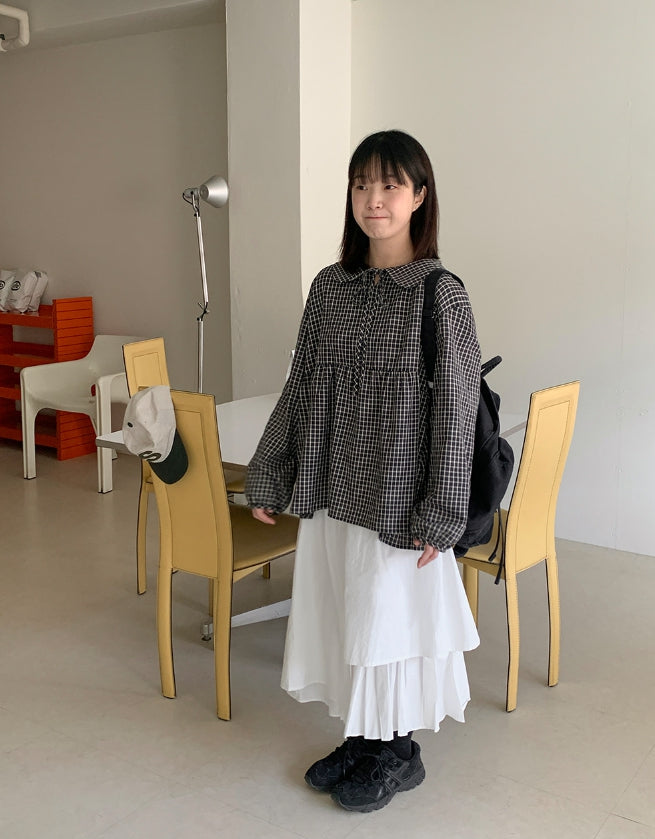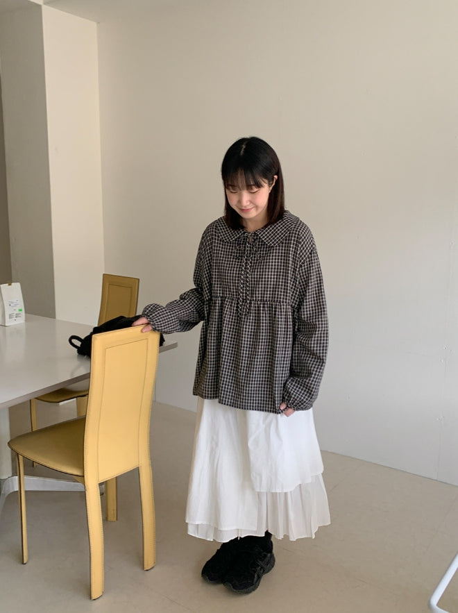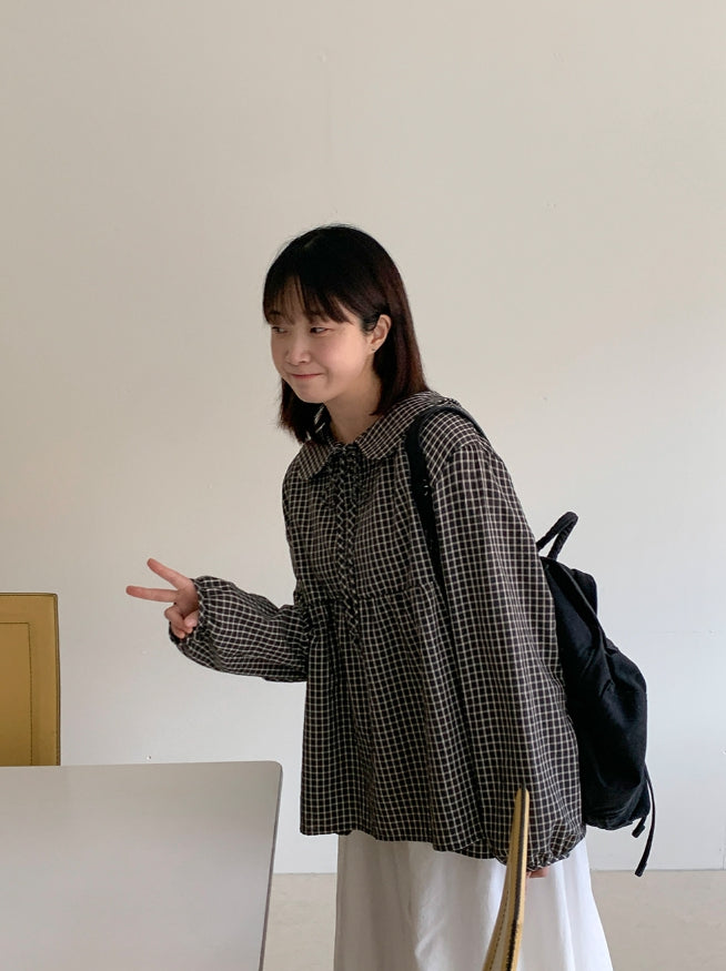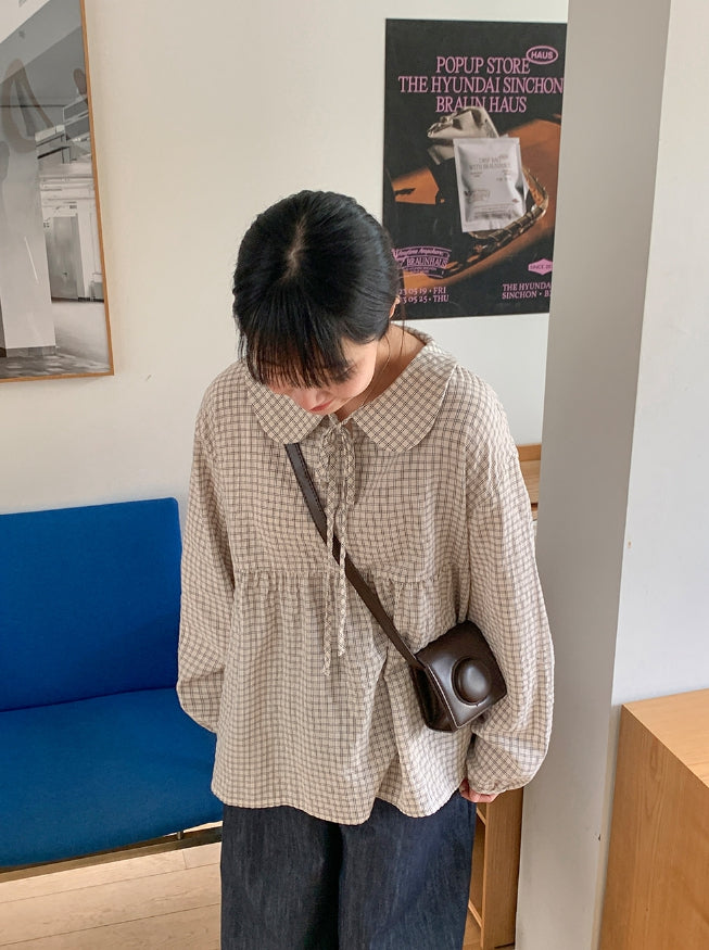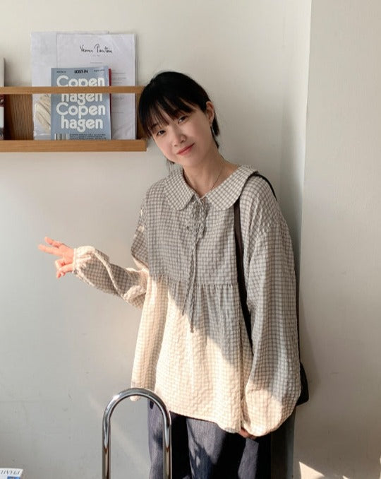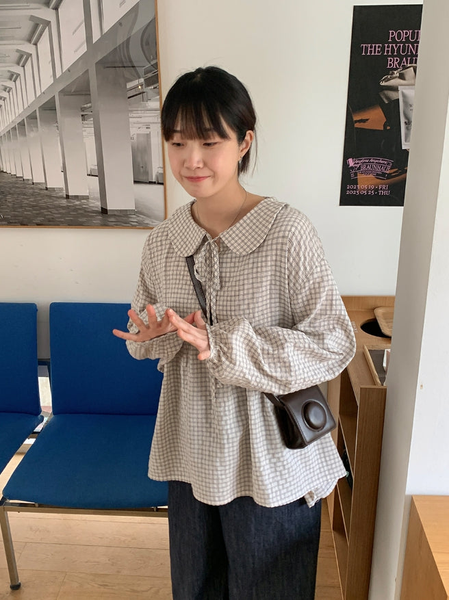[BAONHAUS] Yokon Check Ribbon Shirring Blouse