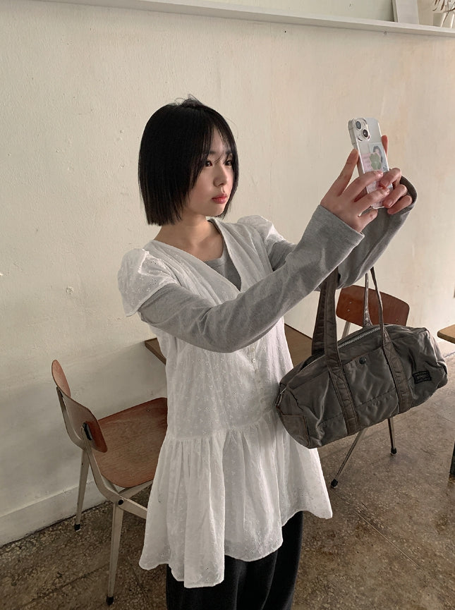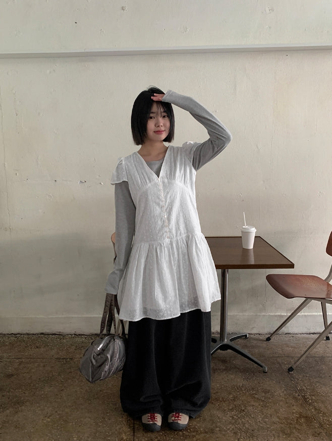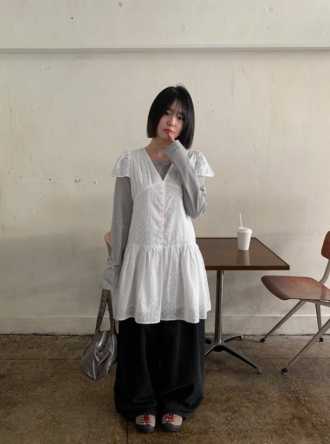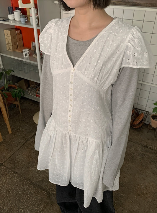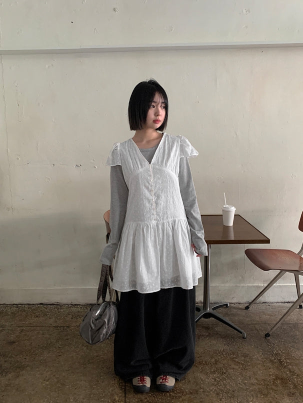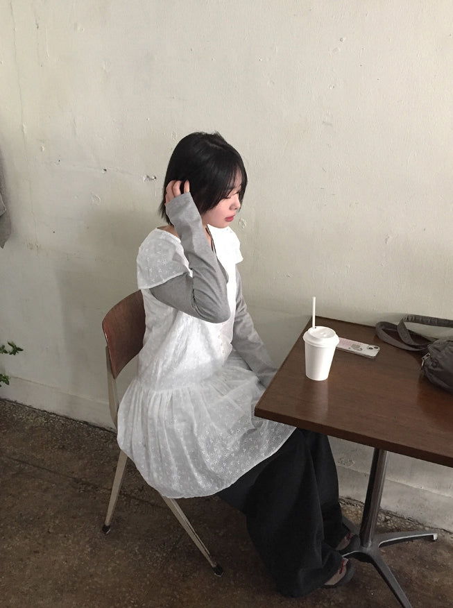 ドベニーフラワーパンチングシャーリングブイネック半袖ワンピース