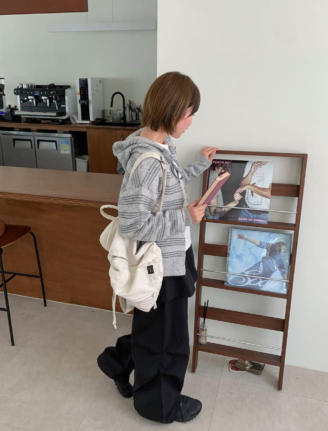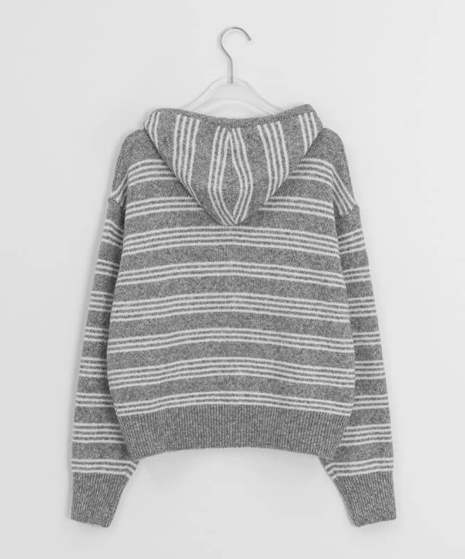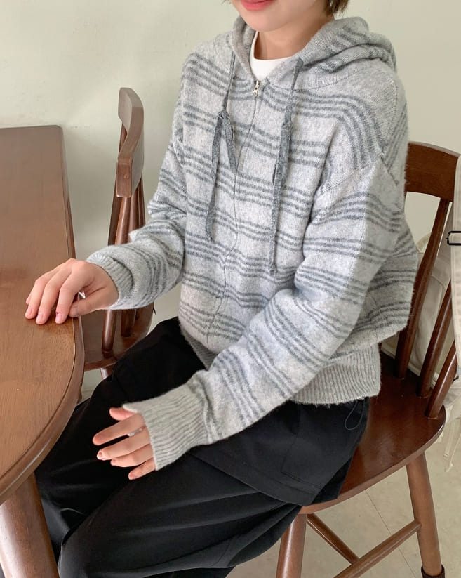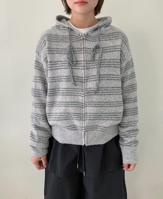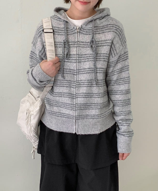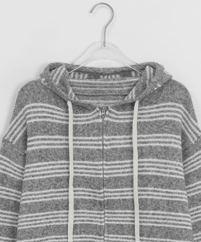 フェルトンデンストライプニットフードジップアップカーディガン