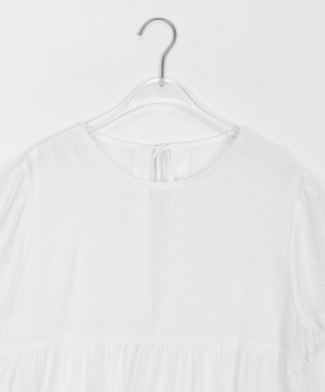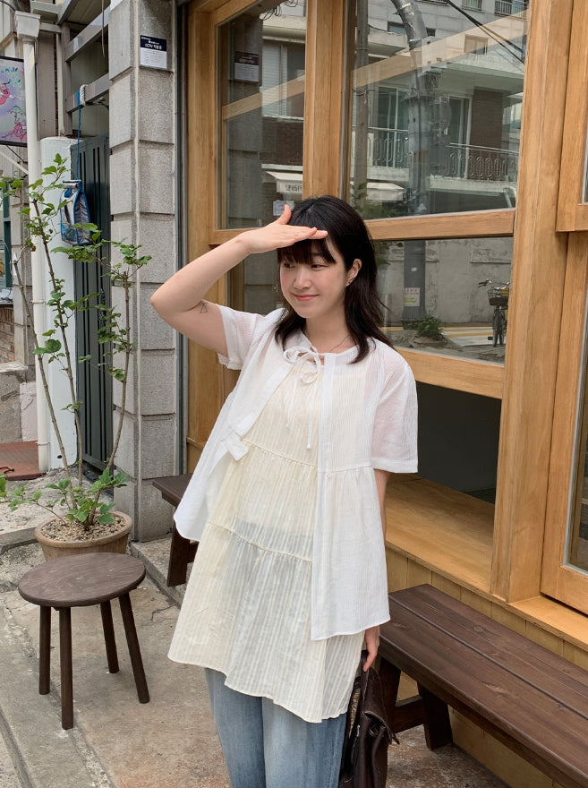 ハノユシャーリングリボンボタンストラップ半袖ブラウス