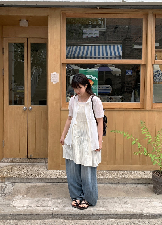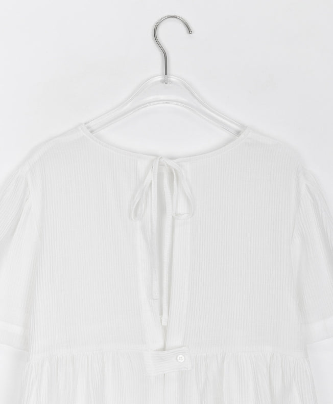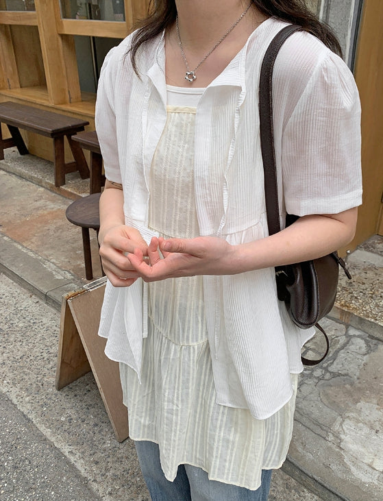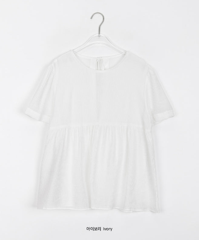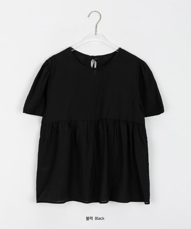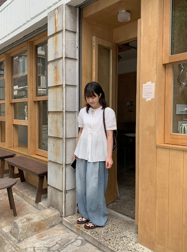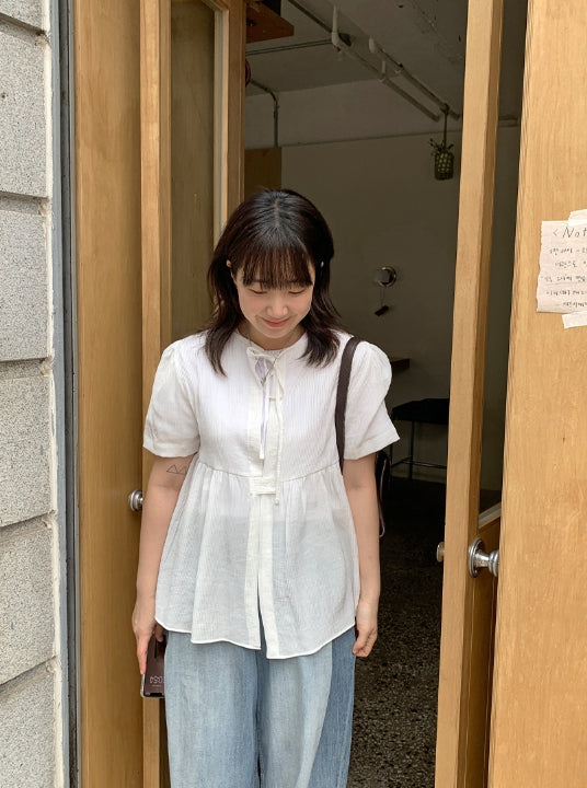 Hanoyu Shirring Ribbon Button Strap Short Sleeve Blouse
