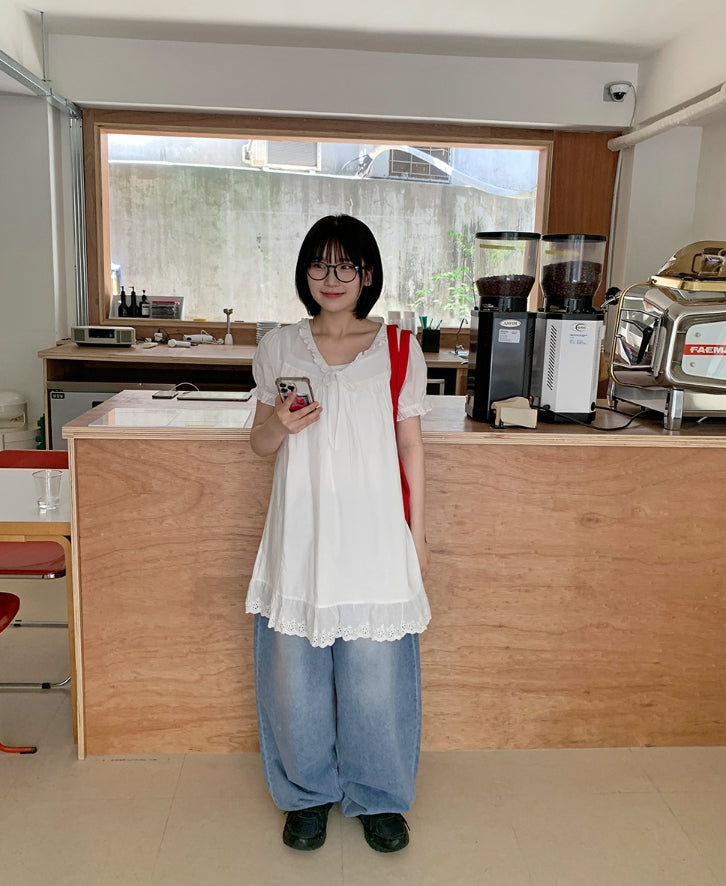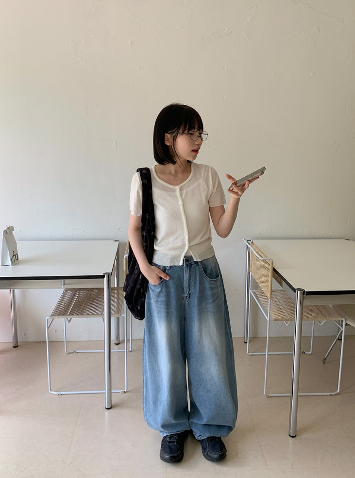 ツイティーキャットウォッシングライトブルーワイドデニムパンツ