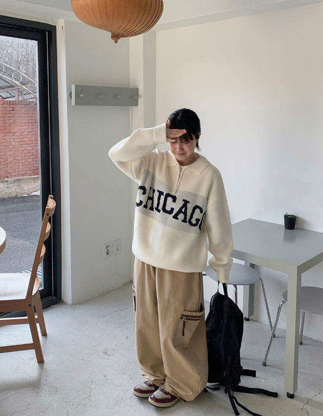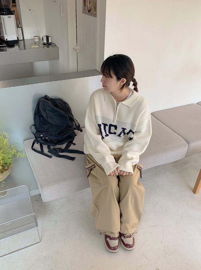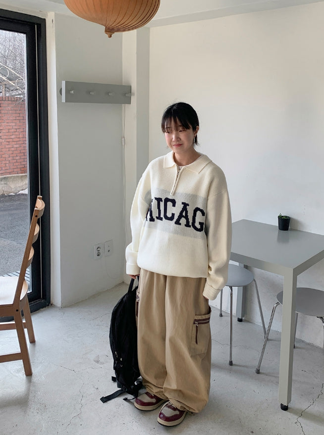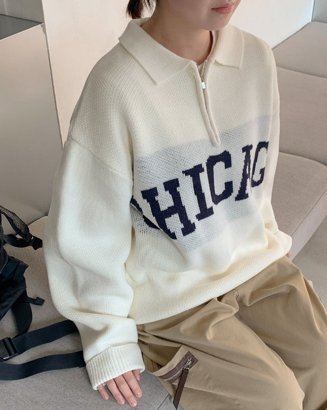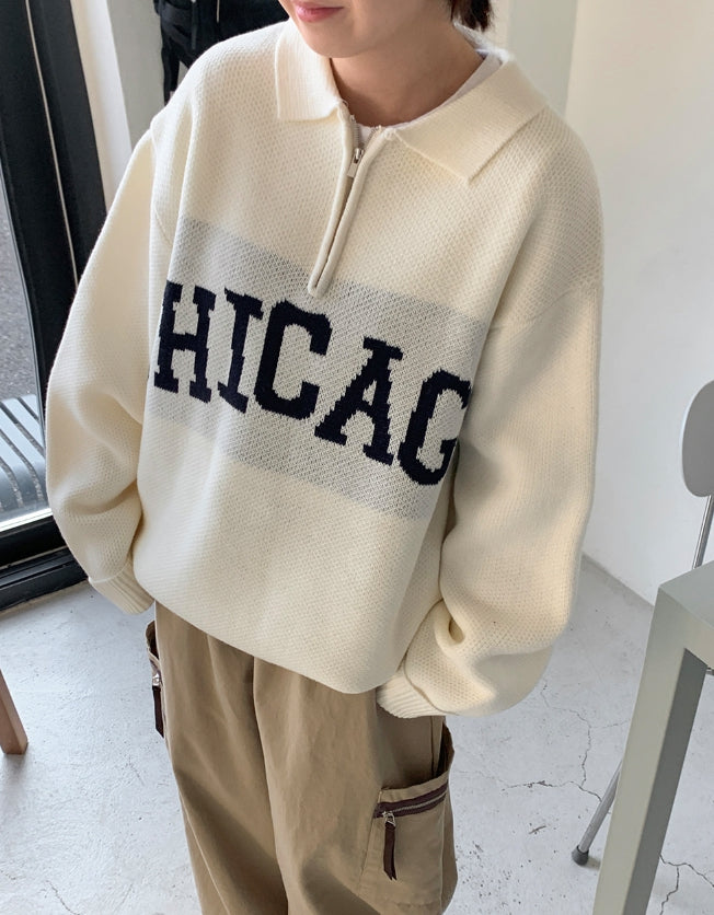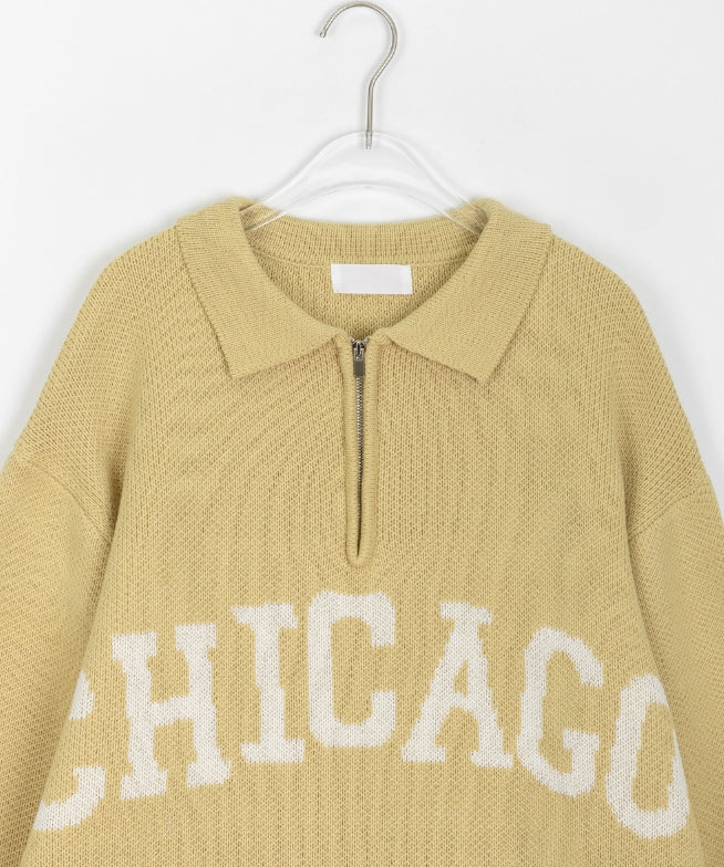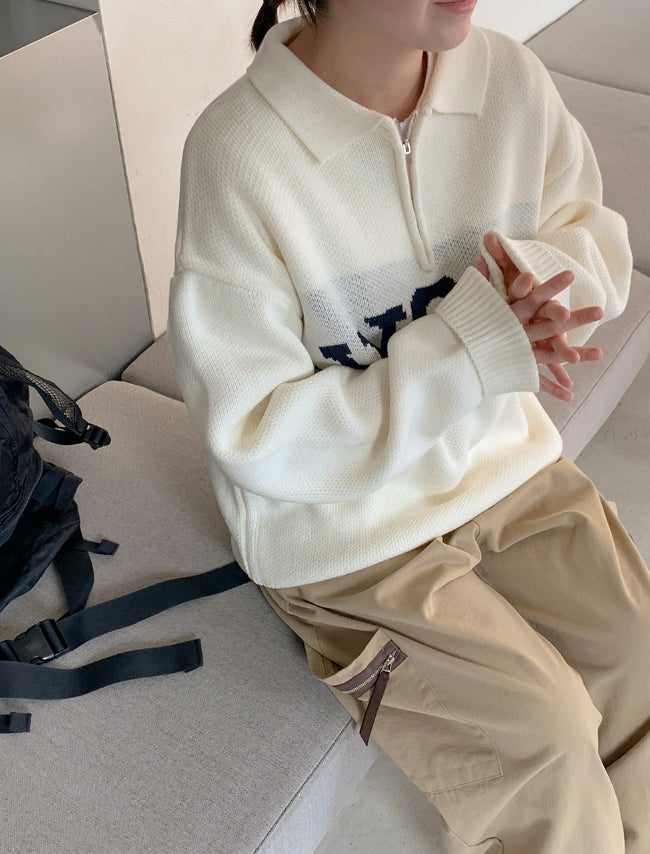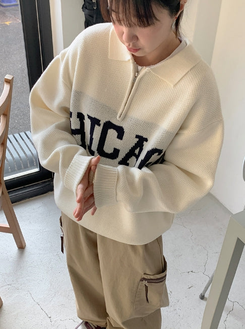 [男女兼用]ベルリップレタリングハーフジップアップ襟付きニット