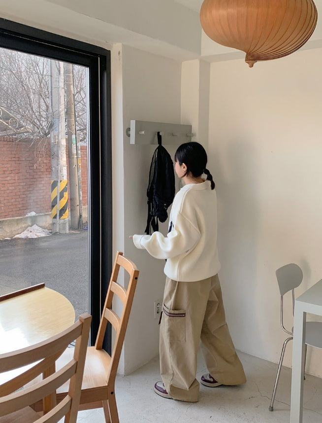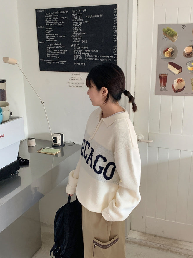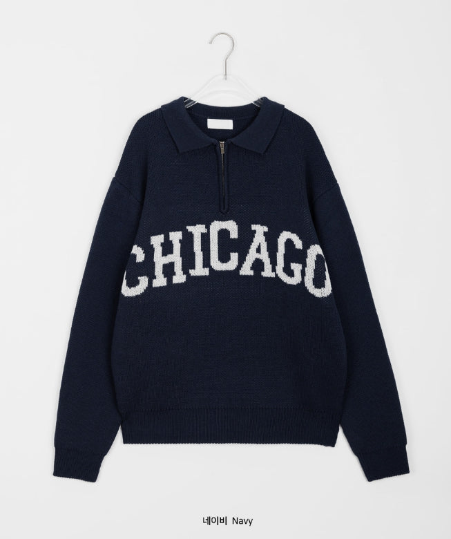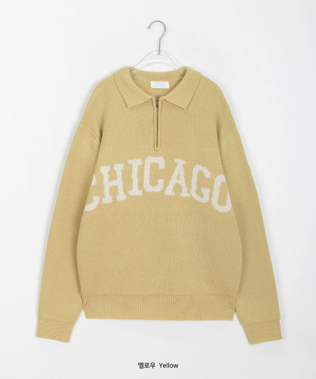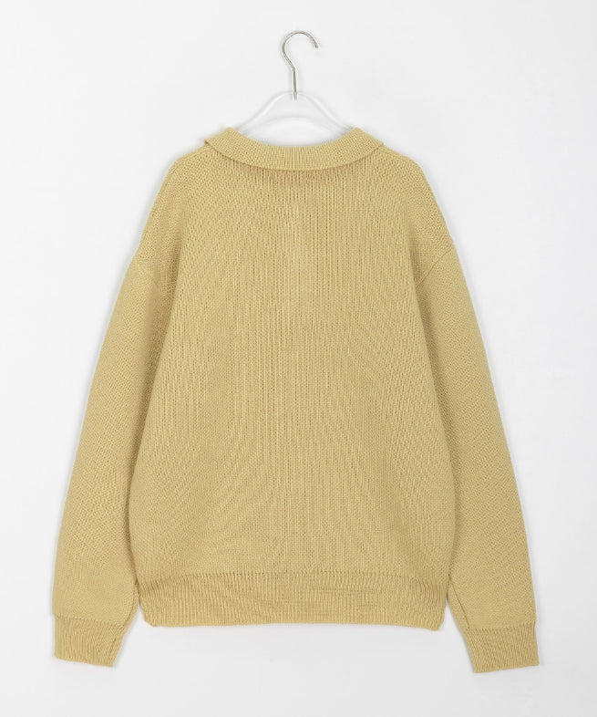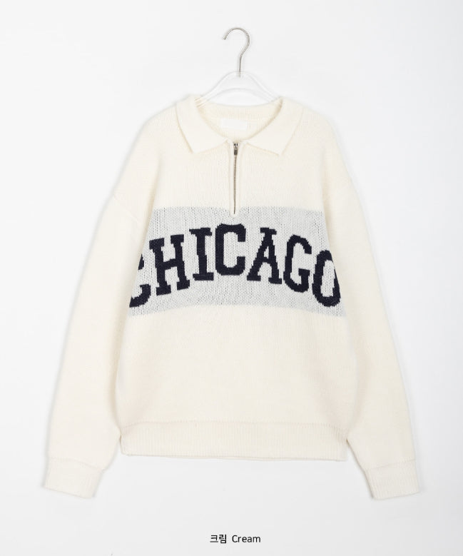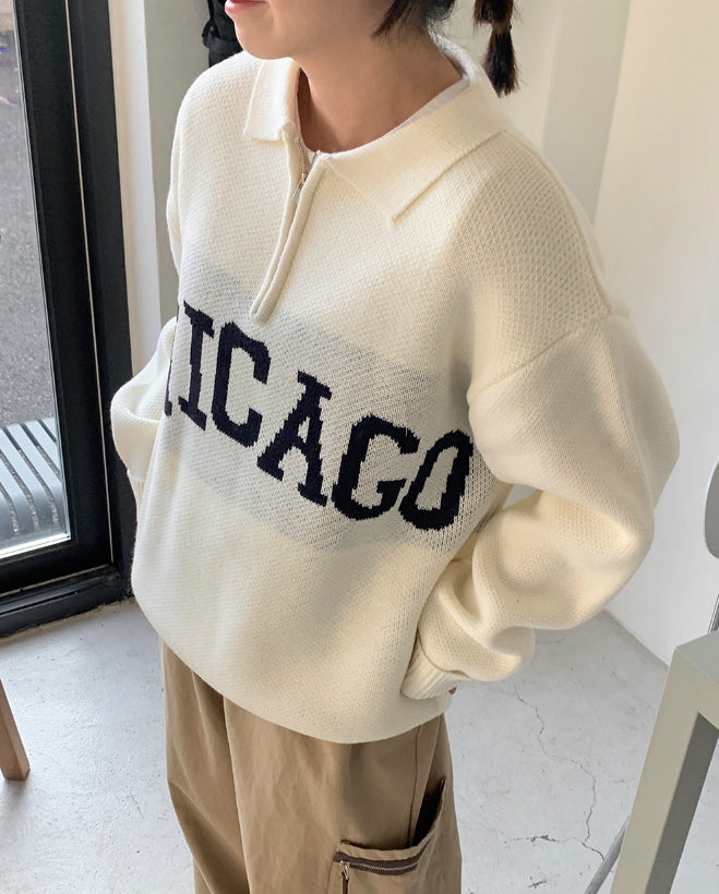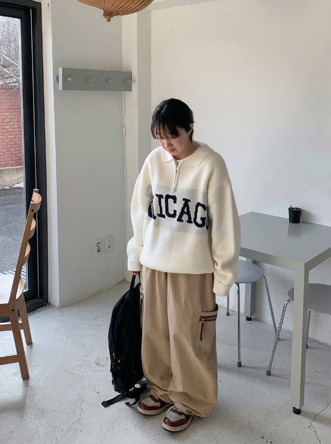 [男女兼用]ベルリップレタリングハーフジップアップ襟付きニット