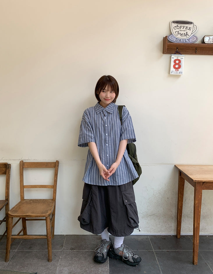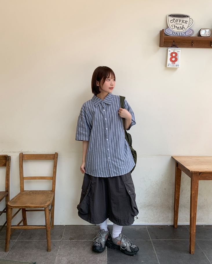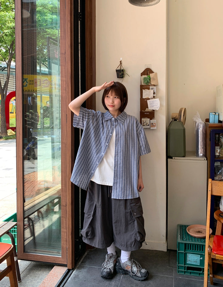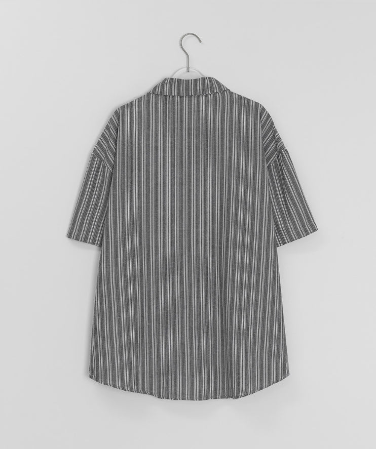 [男女共用]バブレットストライプリネンオーバー半袖シャツ