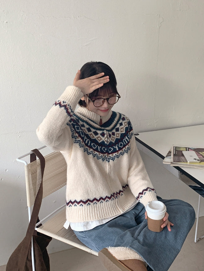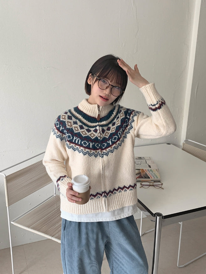 Vanini Nordic Round Wool Knit Zip-Up Cardigan