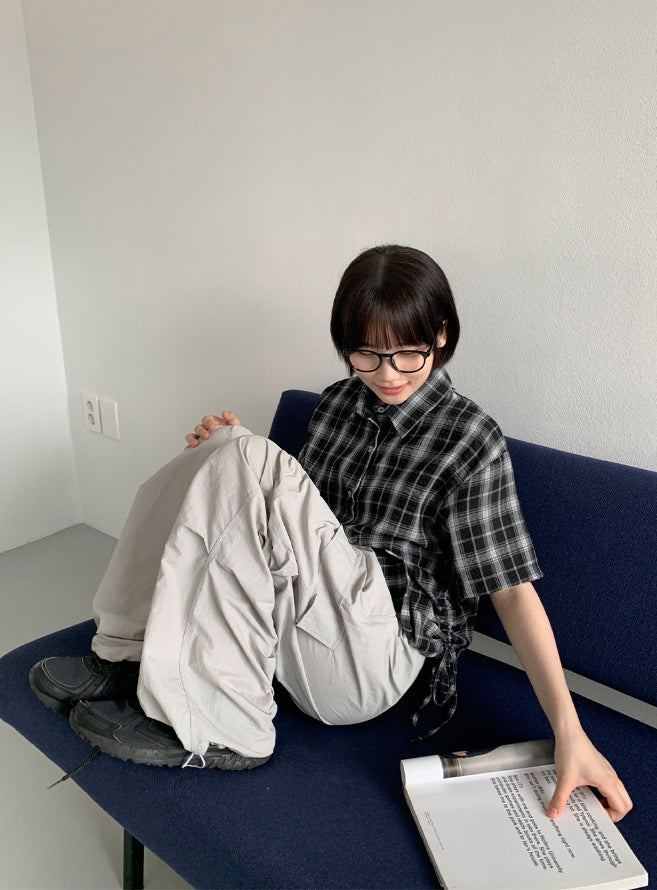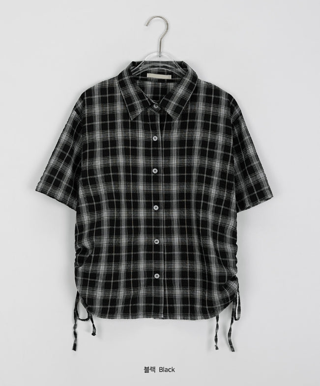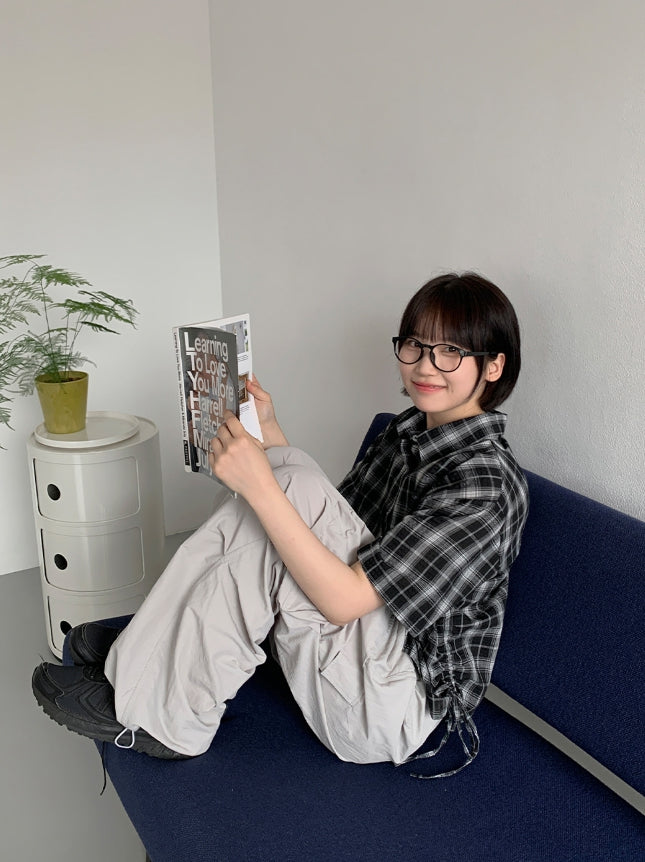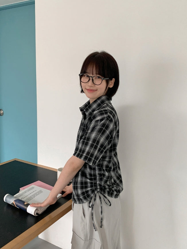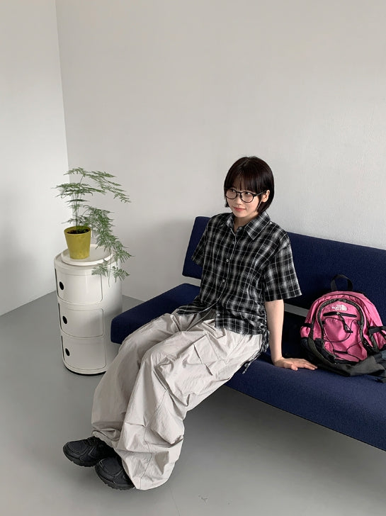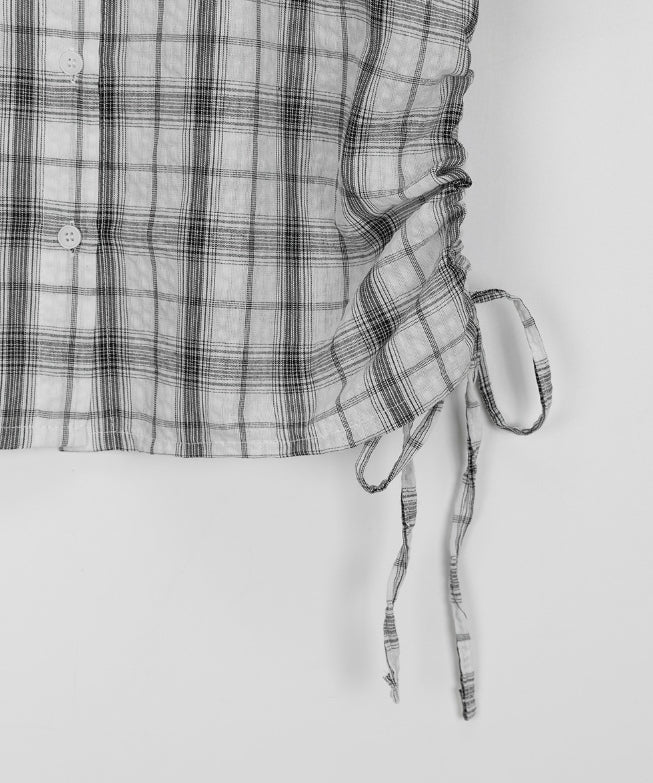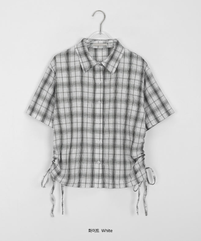 Wook Check Shirring Strap Wrinkle Crop Short Sleeve Shirt