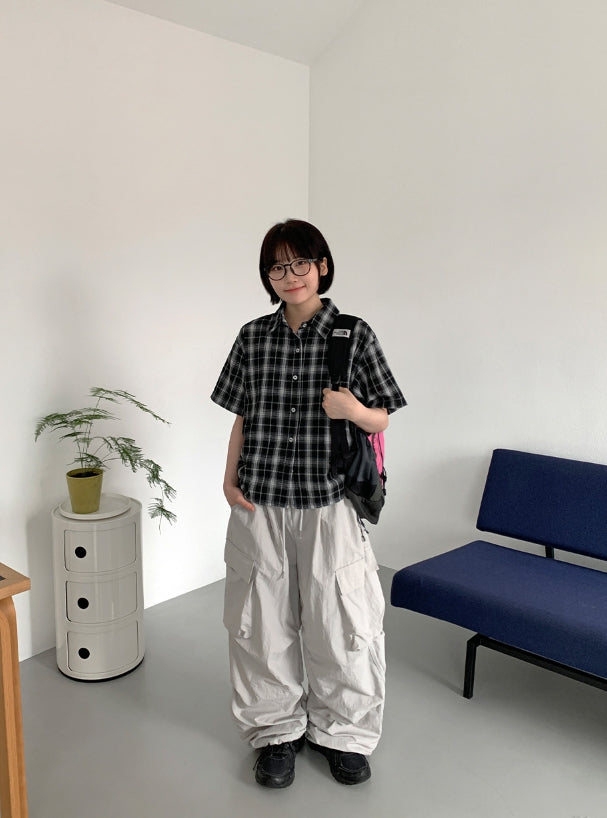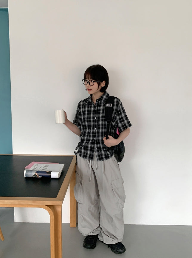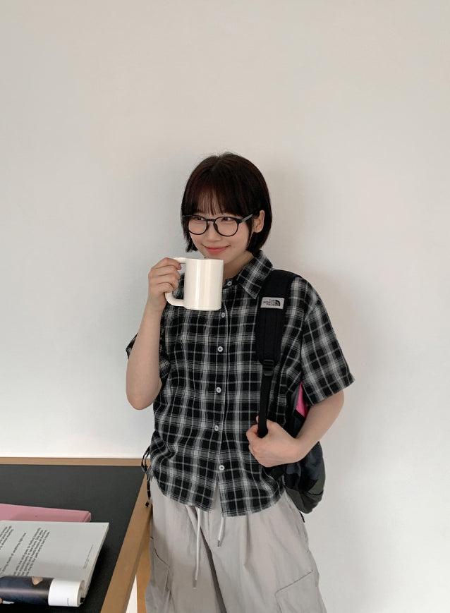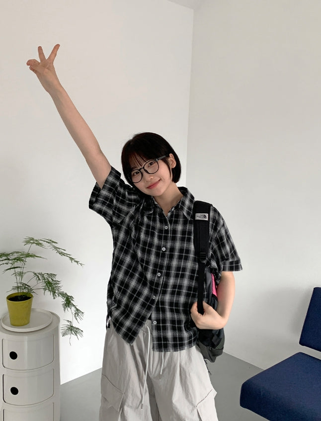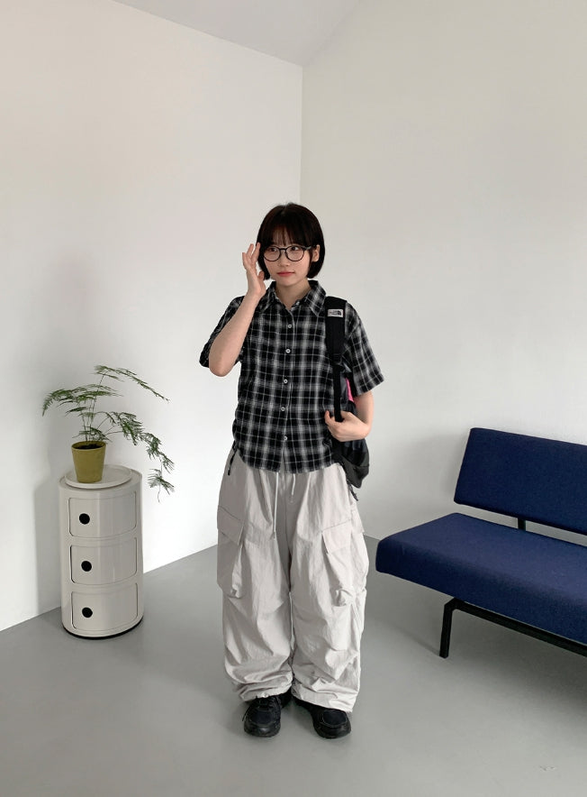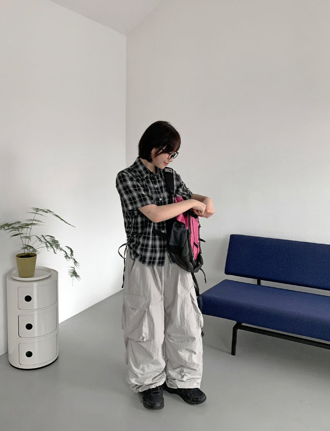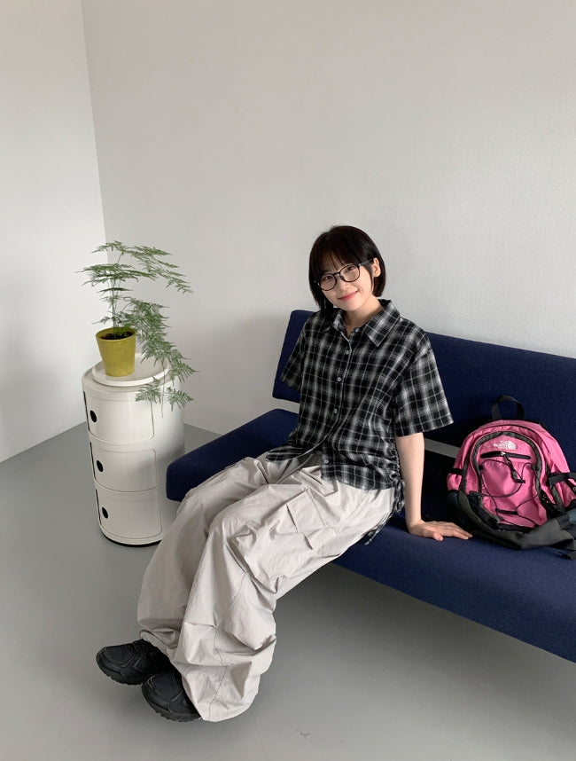 Wook Check Shirring Strap Wrinkle Crop Short Sleeve Shirt