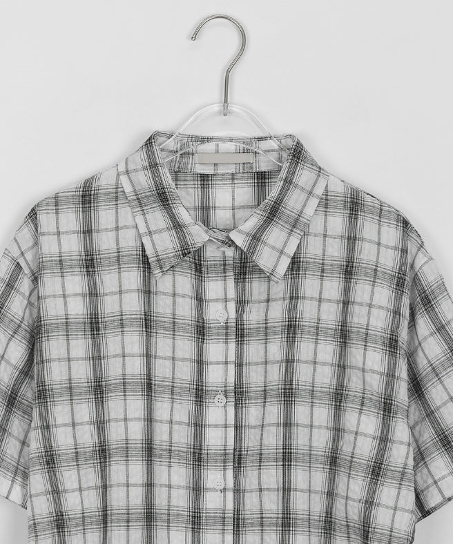 ウクチェックシャーリングストラップリンクルクロップ半袖シャツ