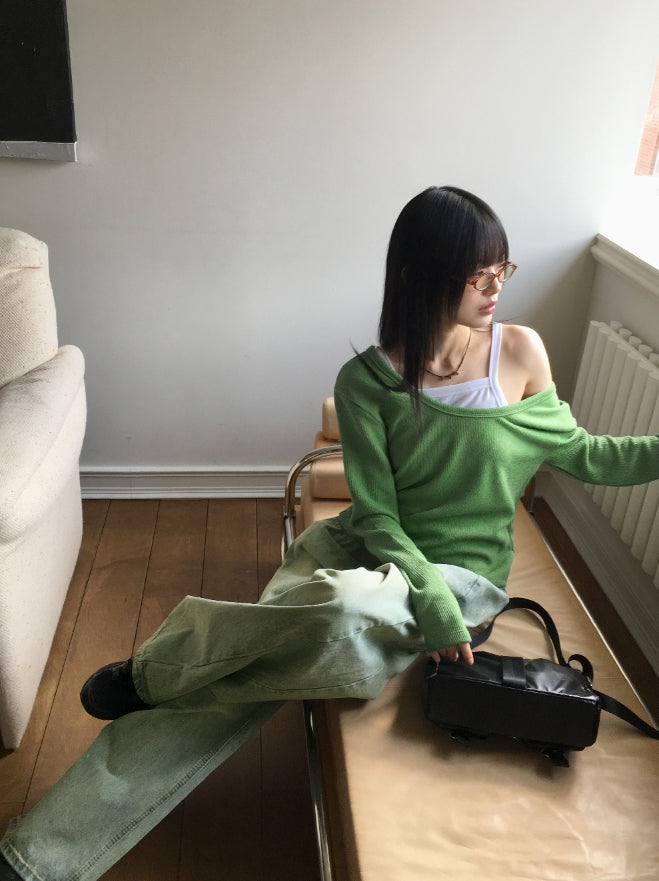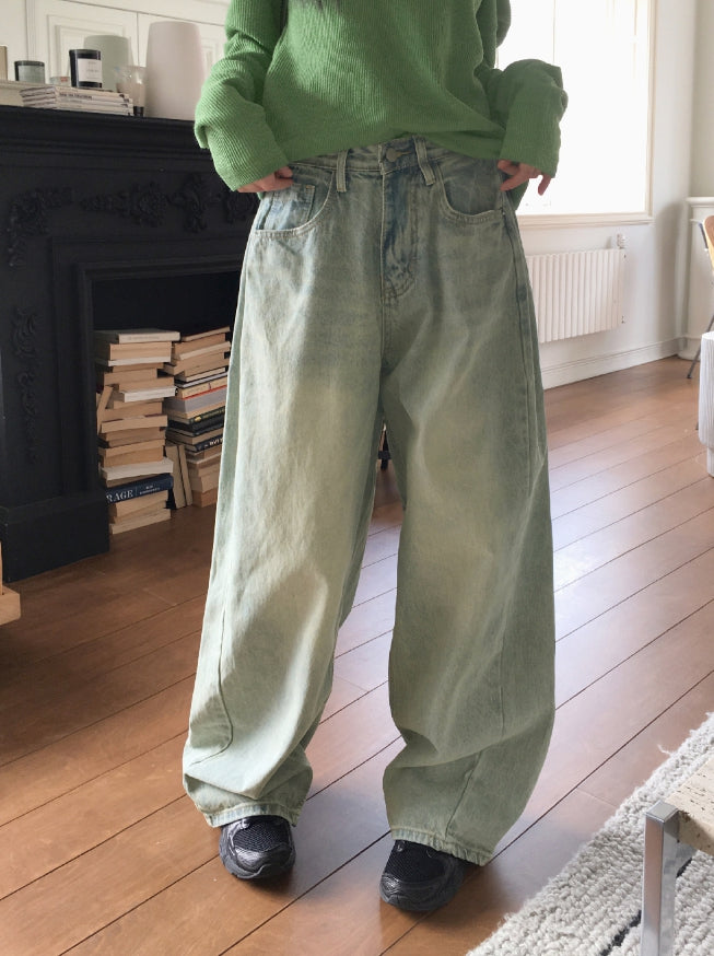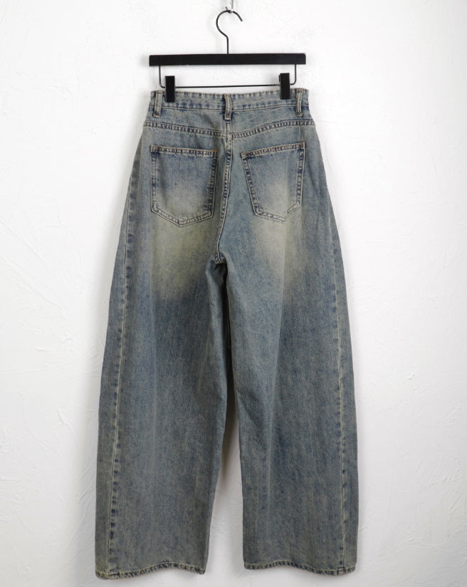 キベサイドピンタックバルーンフィットビンテージウォッシュ加工ロングワイドデニム