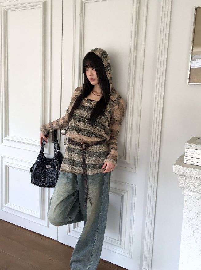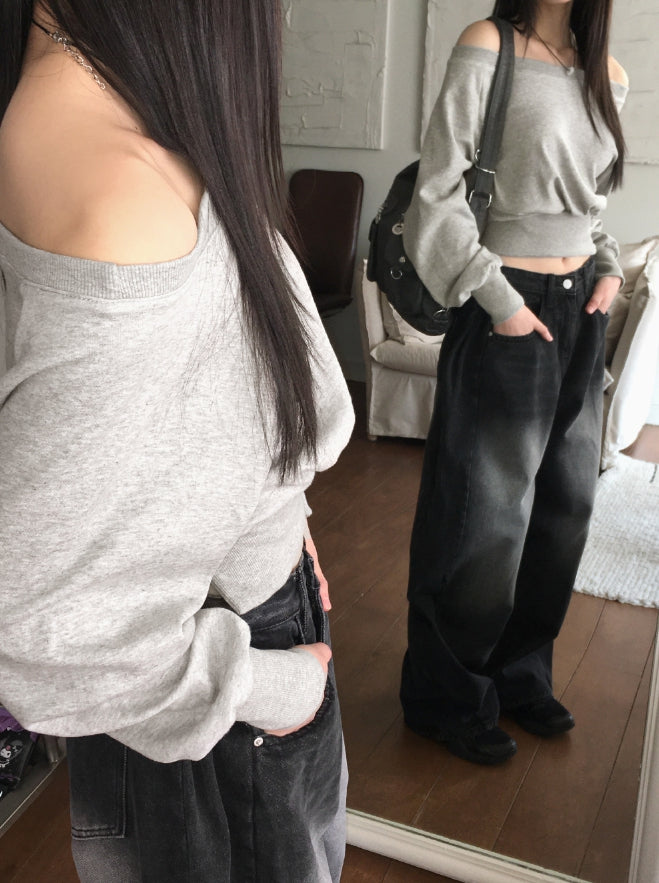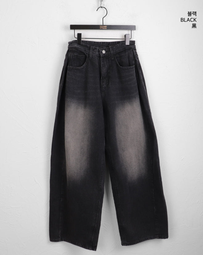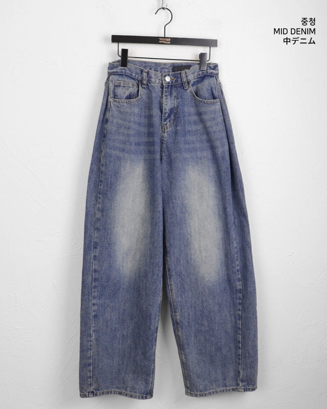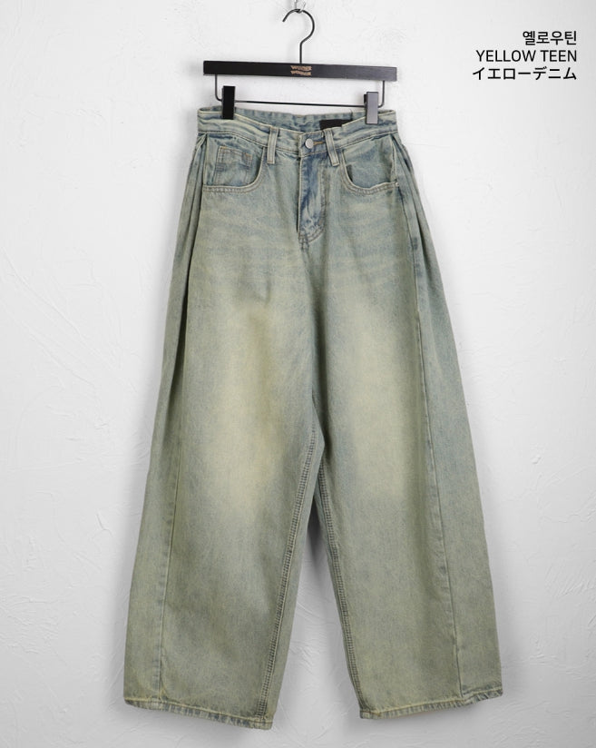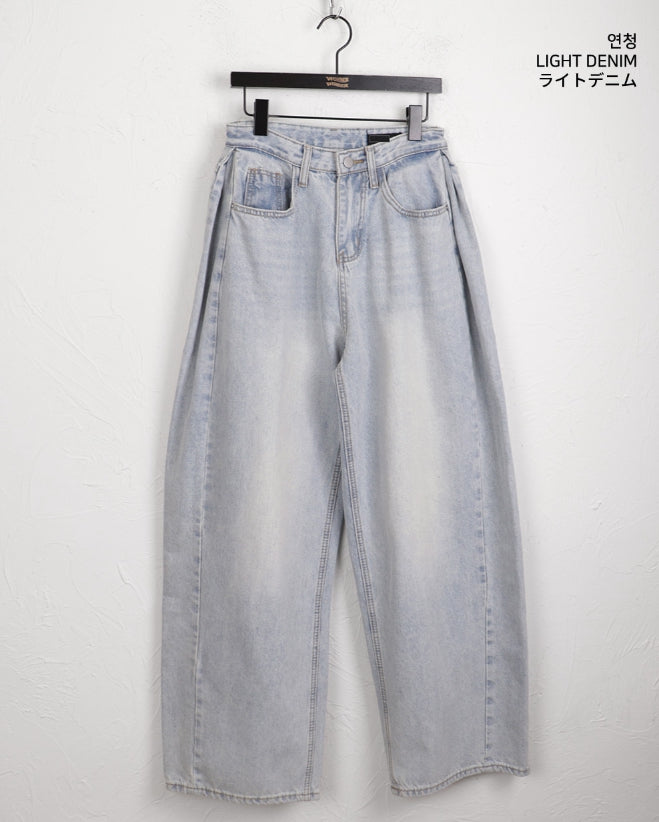 Kibe Side Pintuck Balloon Fit Vintage Washing Long Wide Denim Pants