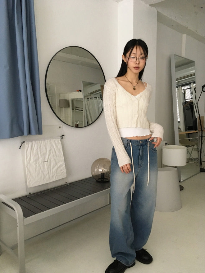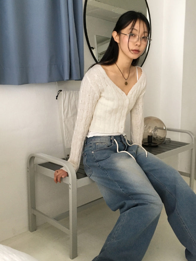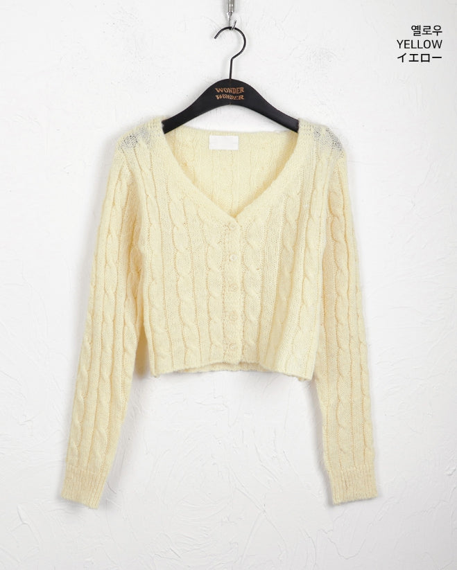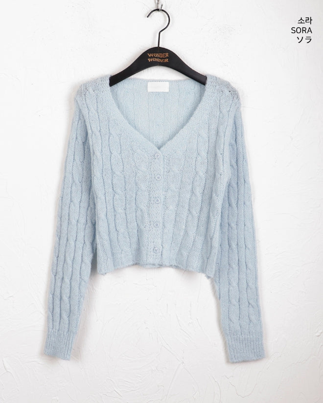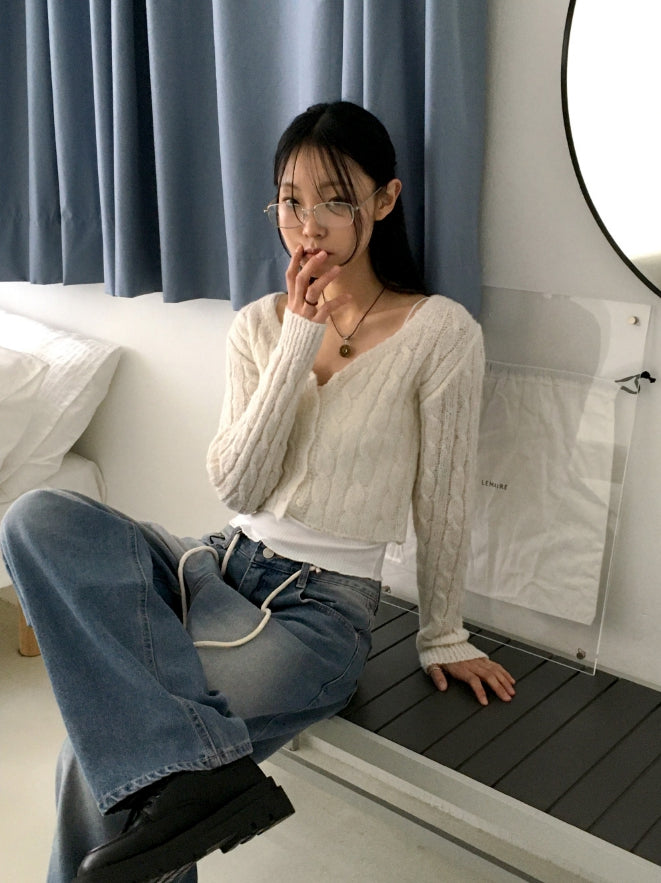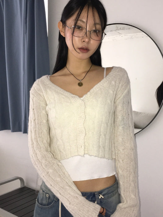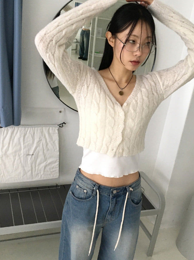 Bevel Spring Cable V-Neck Cropped Long-Sleeved Cardigan